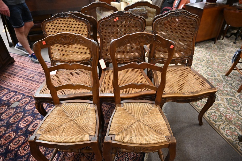 Lot 117: Set of Eight Louis XV Style Side Chairs, with caned seats and backs, height 39 1/2 inches, seat height 18 1/2 inches, (two seats as is), along with a pair of rush seat side chairs.