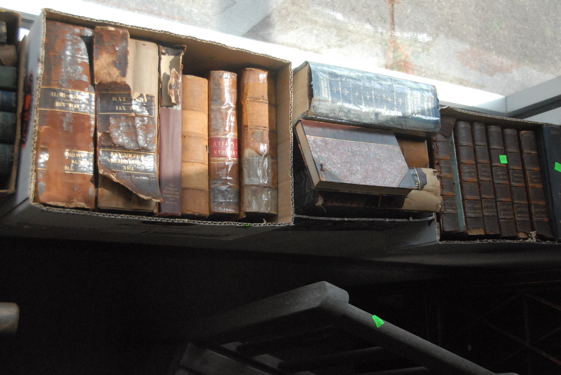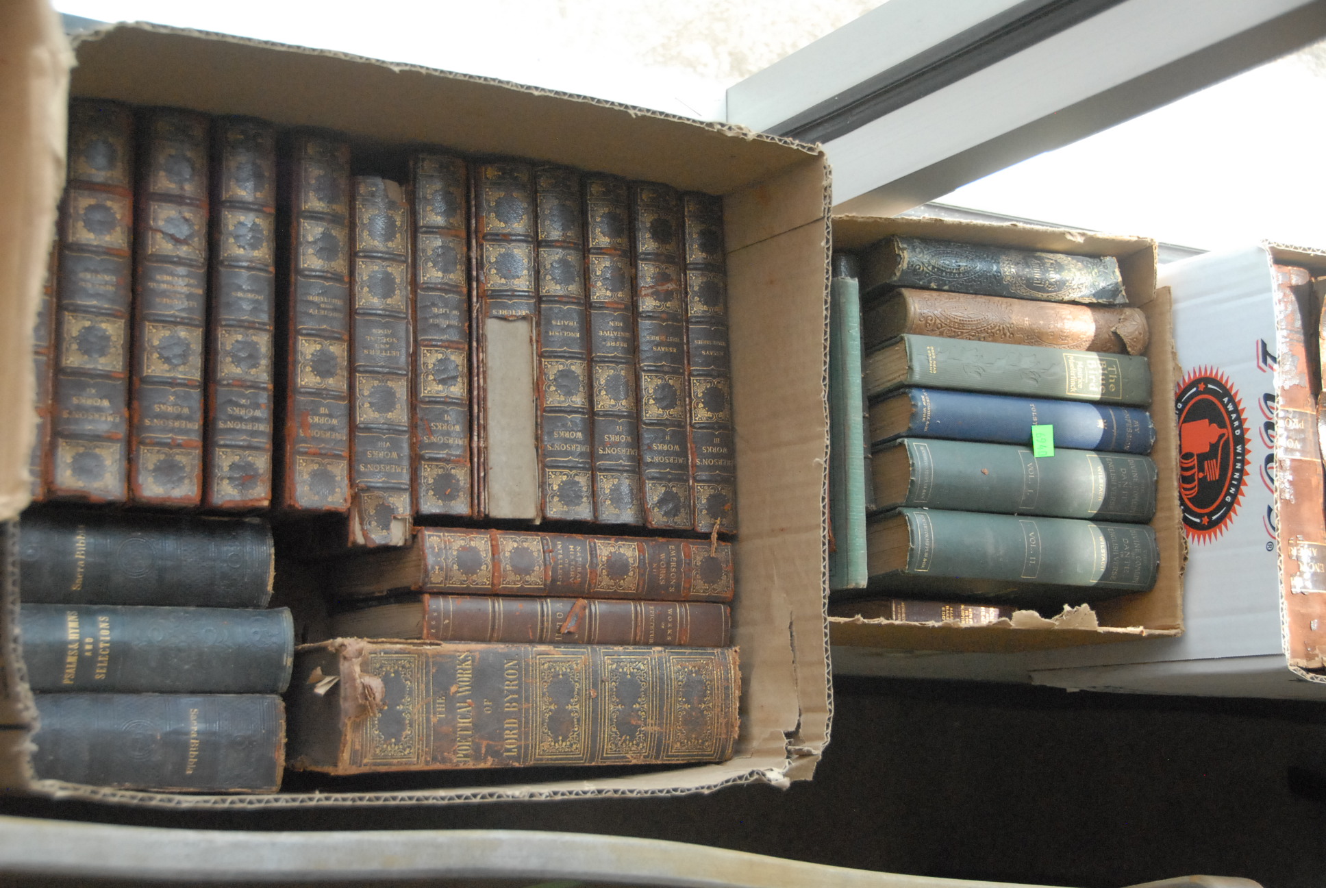 Seven boxes of mostly leather bound books.