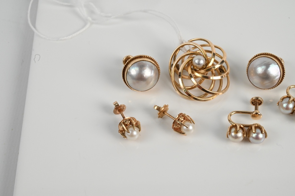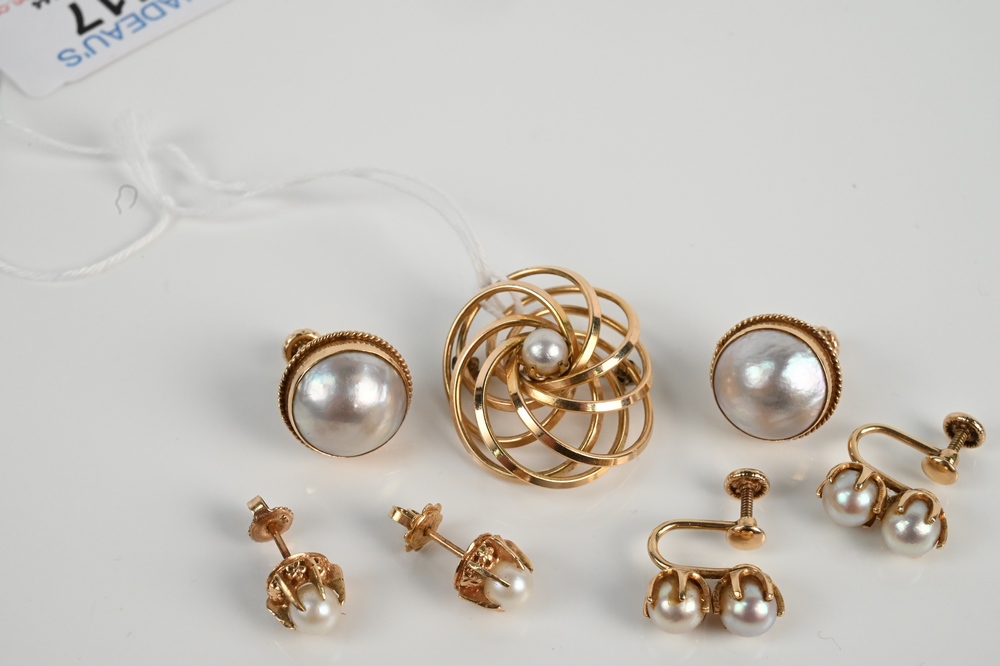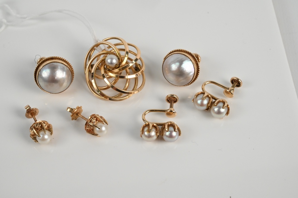 Seven Piece Gold and Pearl Lot, to include a pair of studs, marked 14K; a pair of screw back earrings having large pearl centers, marked 14K; pair of screw back earrings having two pearls each, marked 14K; along with a 10 karat pin, total weight 23.1 grams.