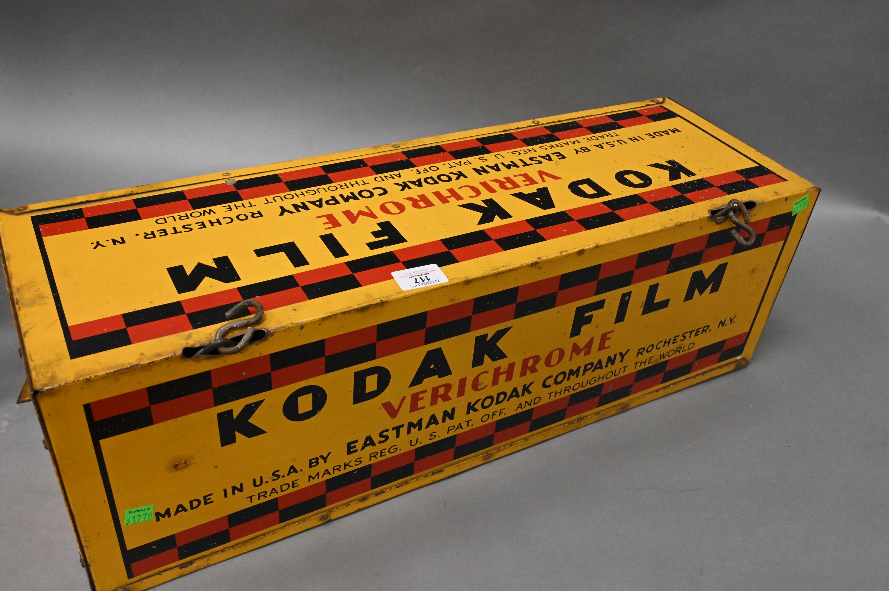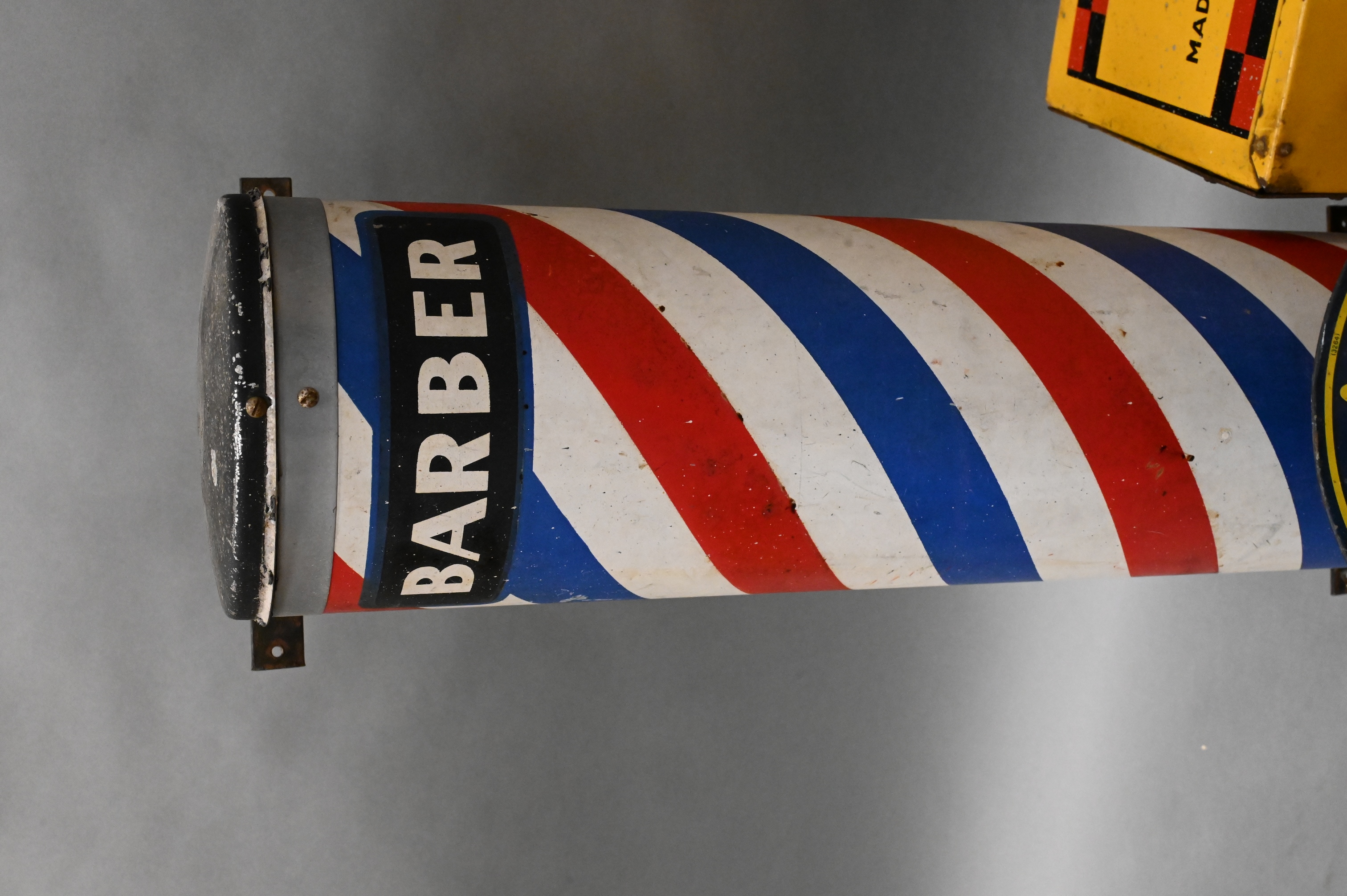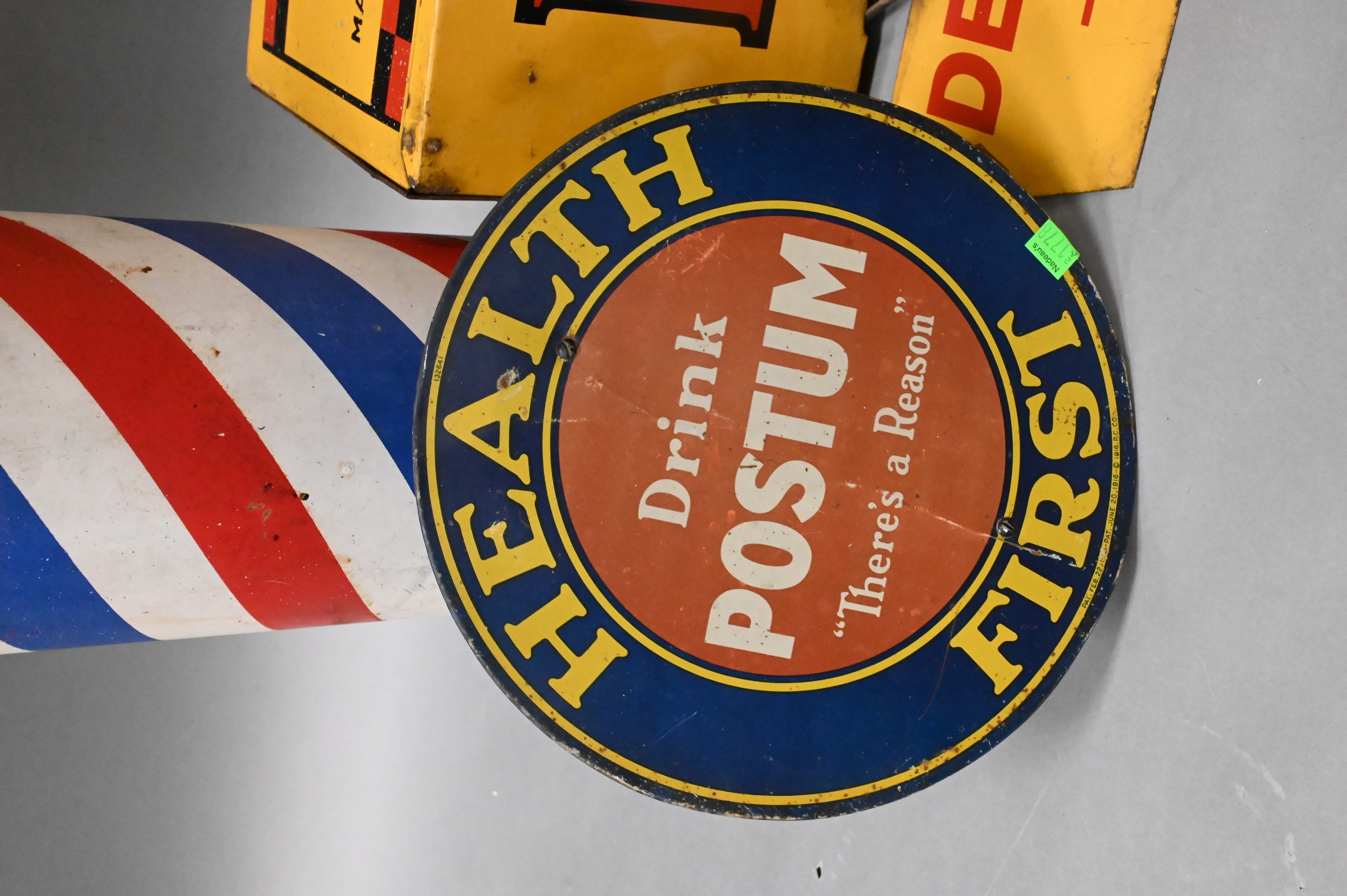 barber shop pole, Kodak film Verichrome tin box display with hanging service sign, and “Drink Postum Health First” twine holder