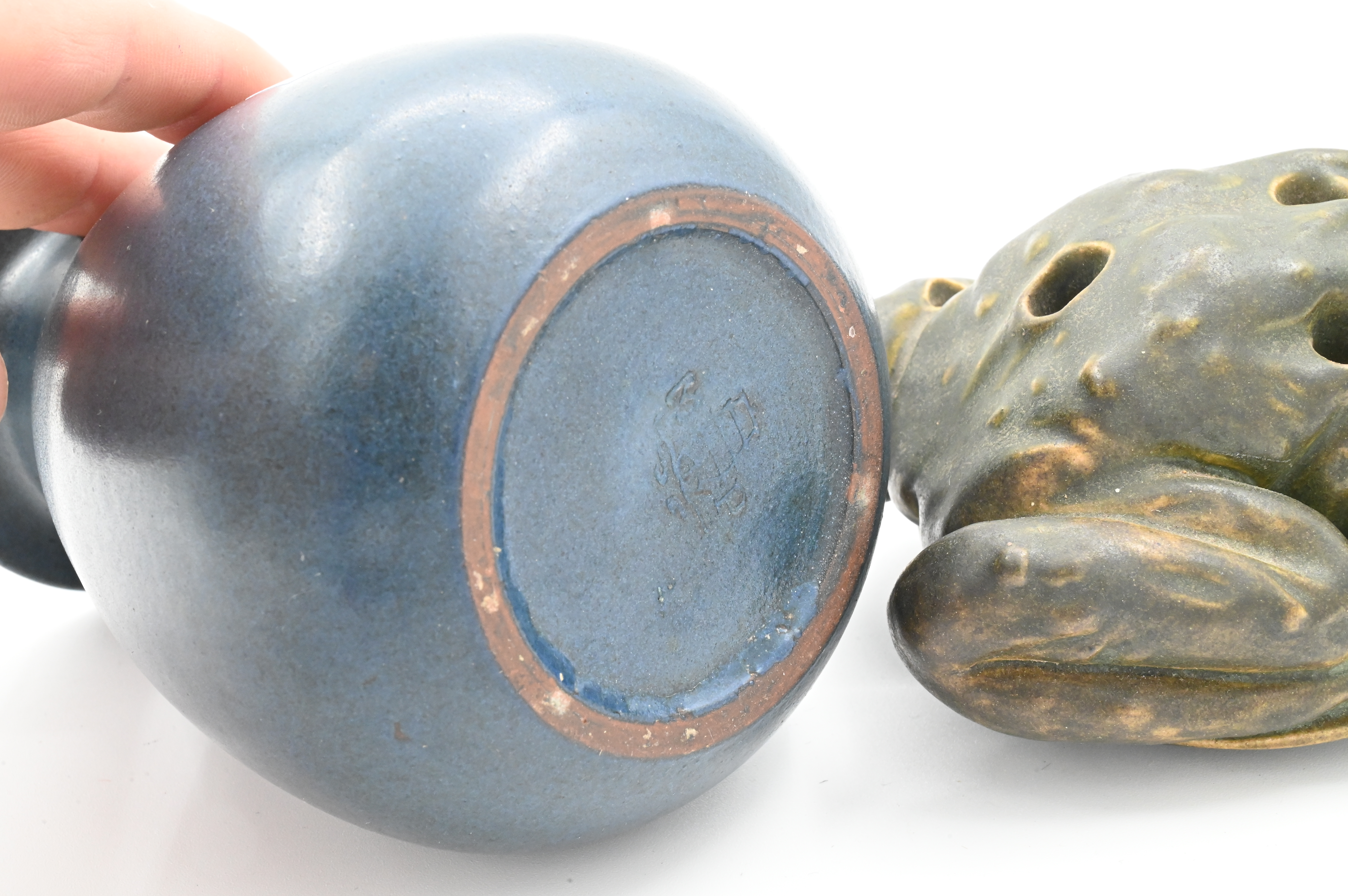marblehead pottery, matte blue glazed vase having flared rim, along with a Grueby matte green pottery flower frog/toad having mark on bottom