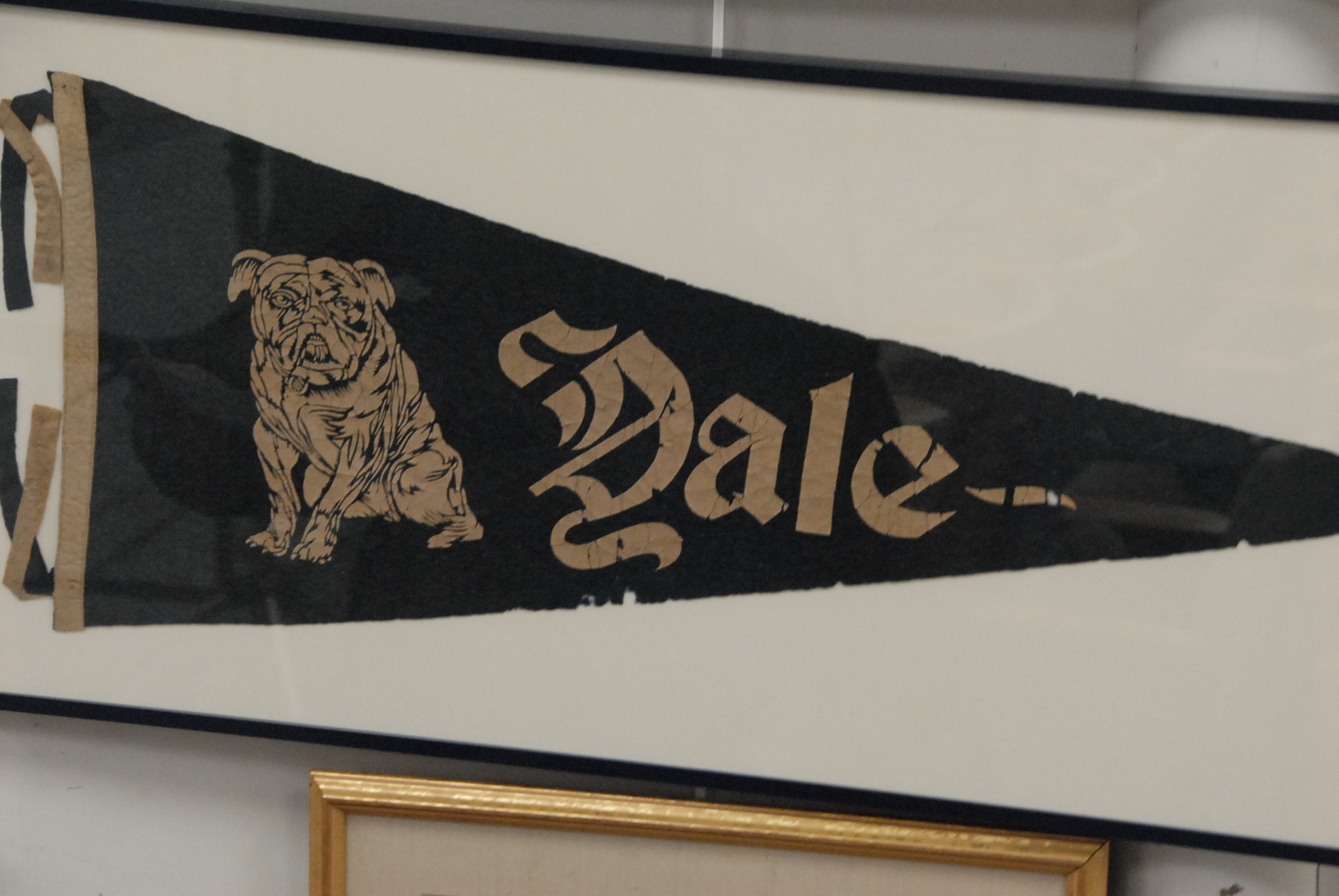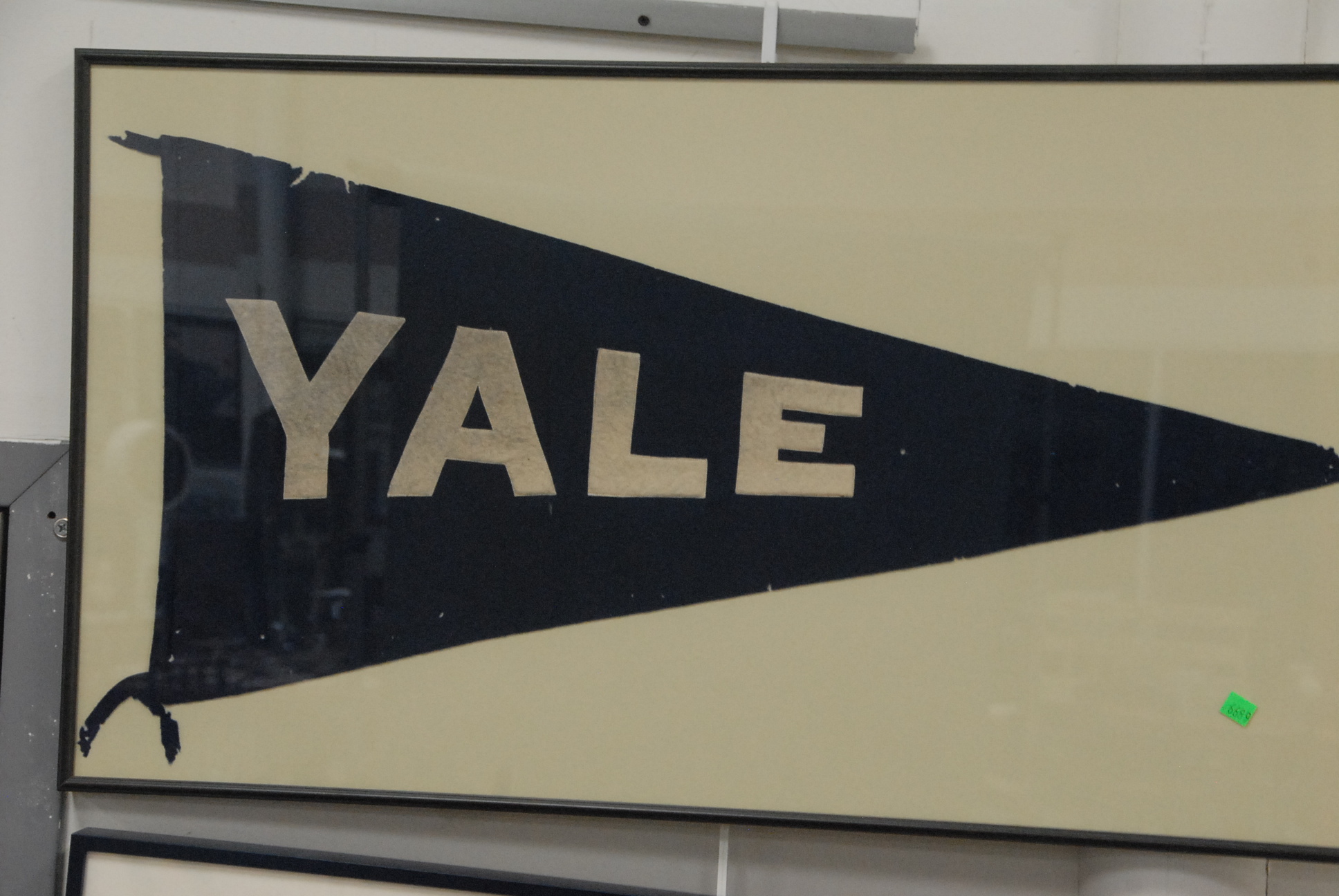 Lot 117: Two piece framed lot Yale Stadium pennant sewn vintage lettering circa 1900-1910 and Yale felt pennant stylized lithographed bulldo…