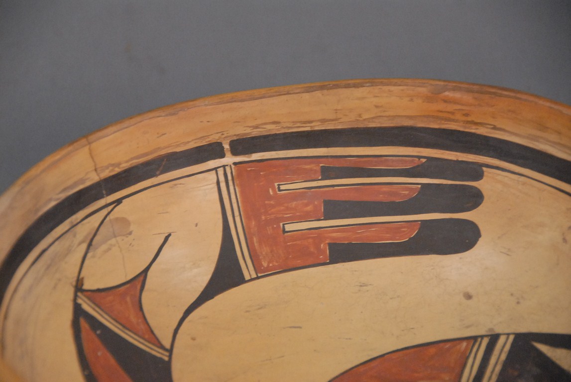 Two piece lot Acoma pottery bowl one crack and small plate. bowl: dia. 10in. ht. 3in. plate: dia. 4 3/4in. Being sold to benefit a Connecticut Museum.