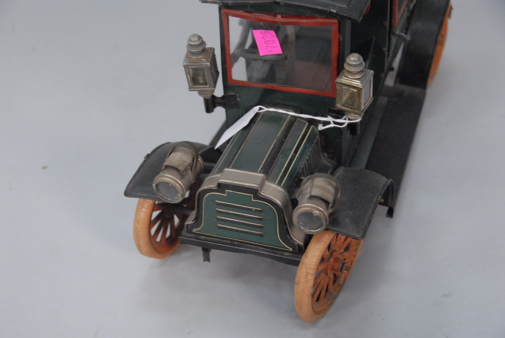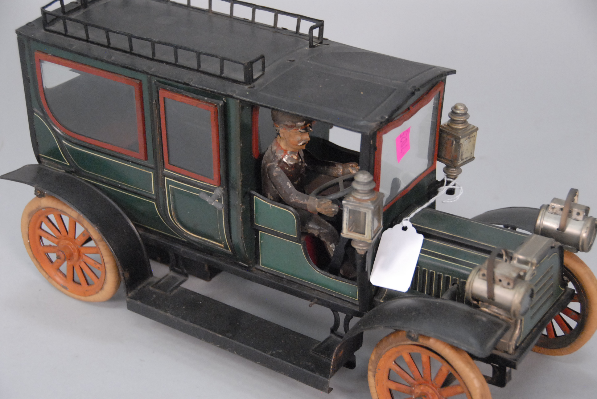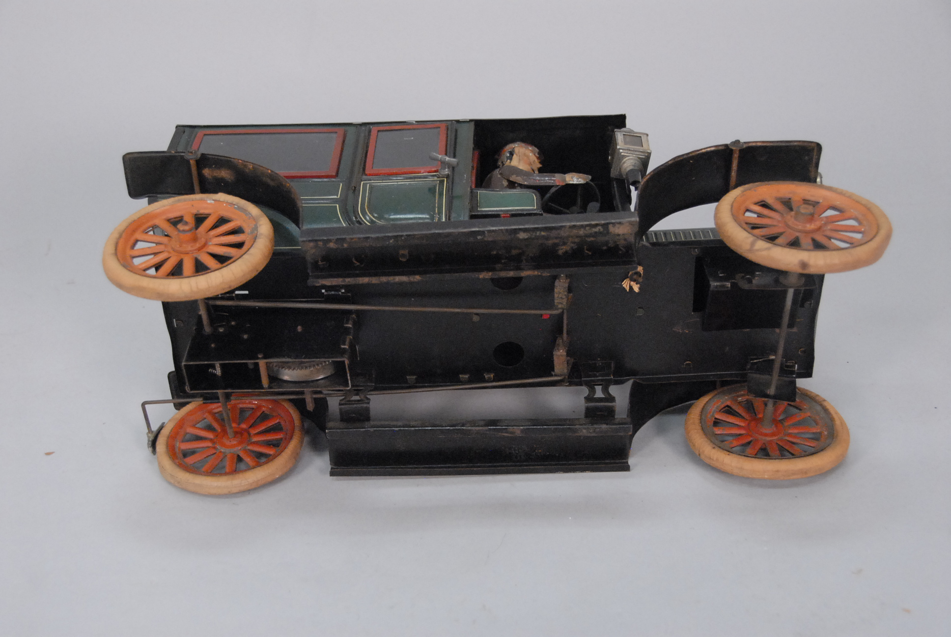 Vintage tin toy wind up transport truck with driver and rubber tires ht. 8in., lg. 16in.