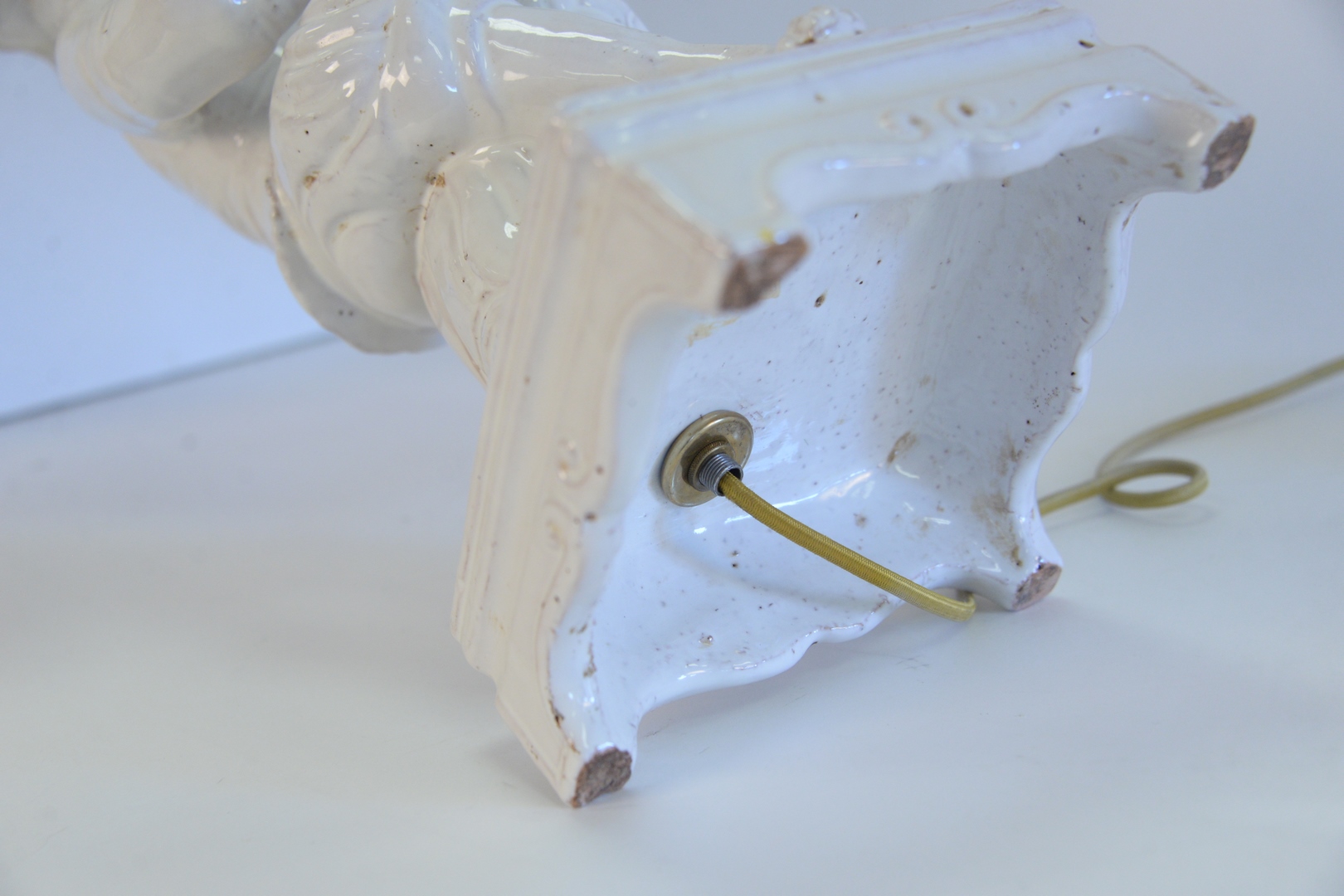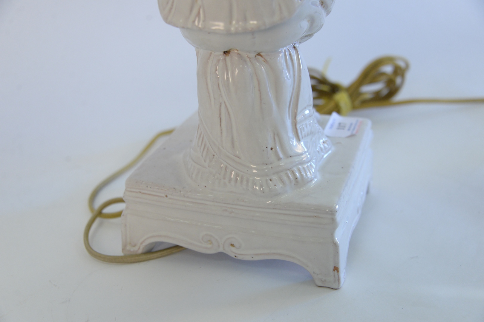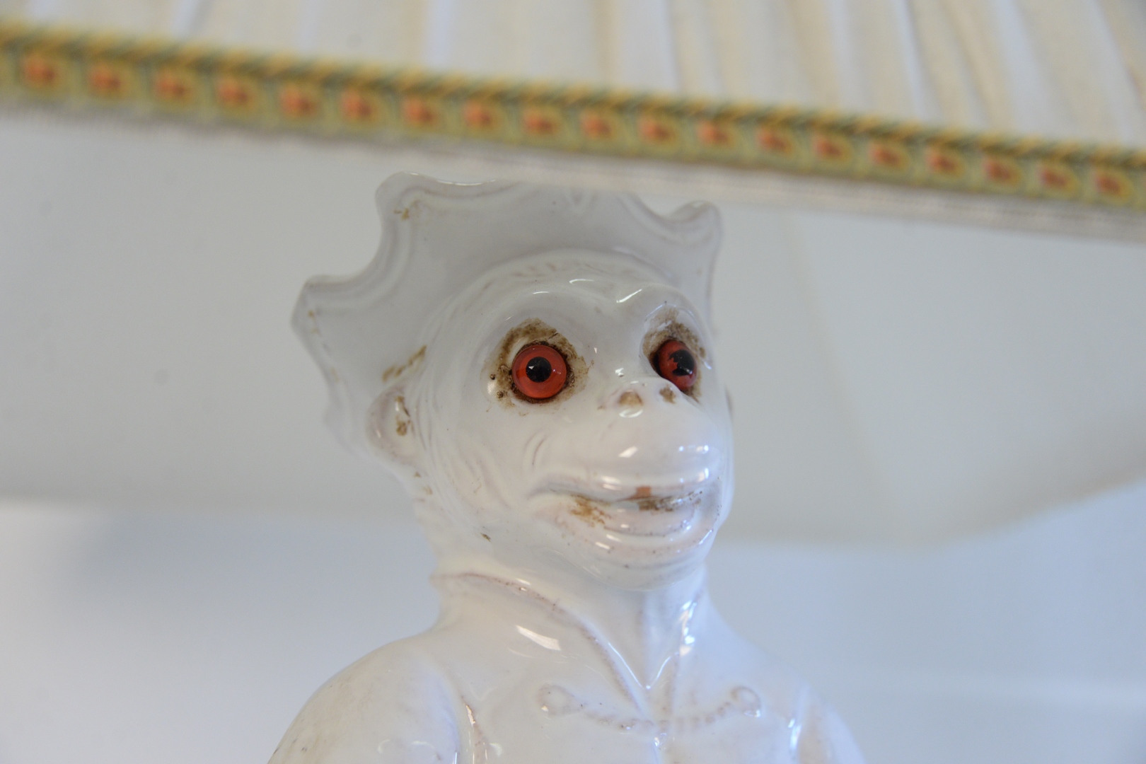 Lot 117: White Porcelain Crowned Seated Monkey, having red glass eyes, on square base, made into a table lamp, monkey height 16 inches.