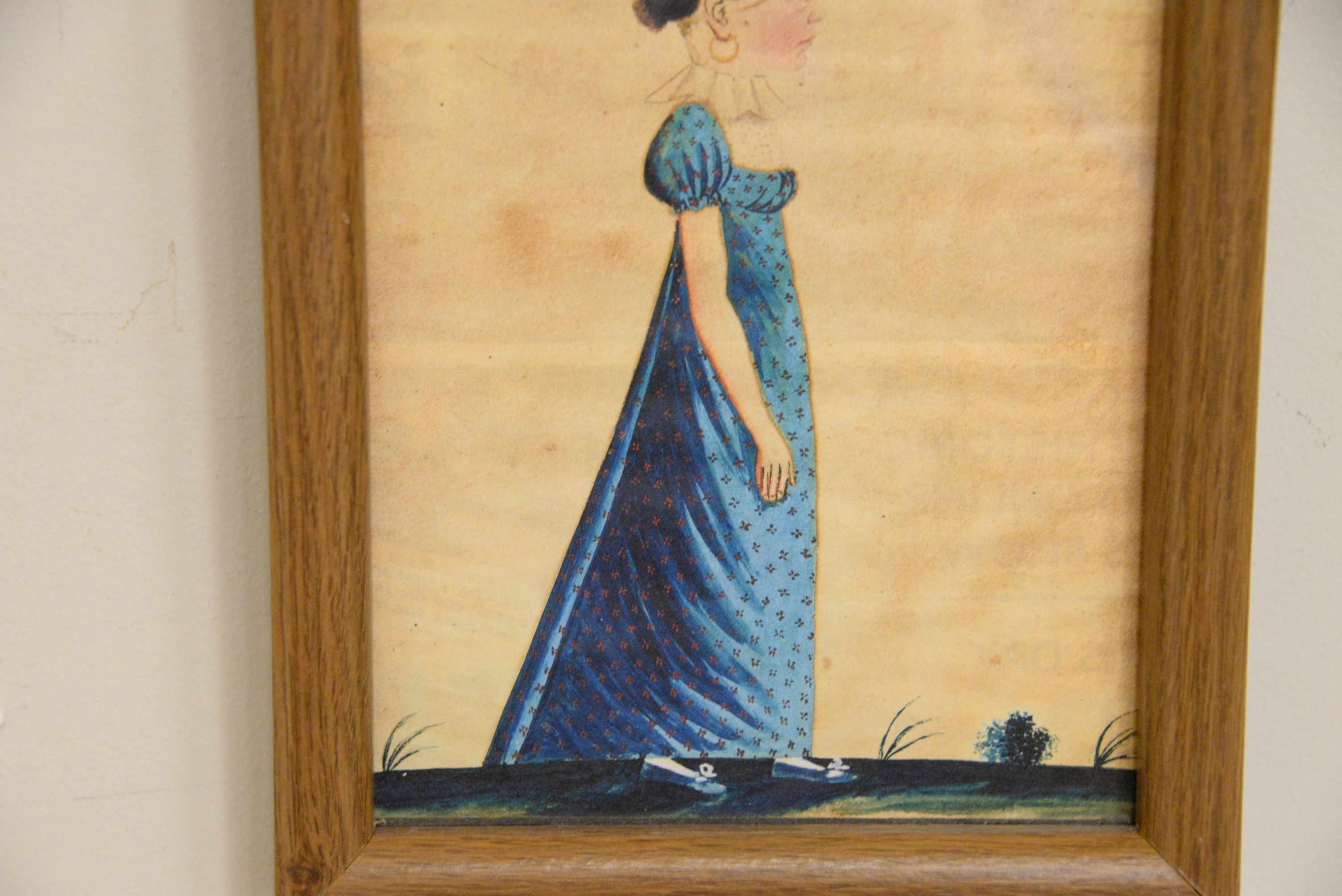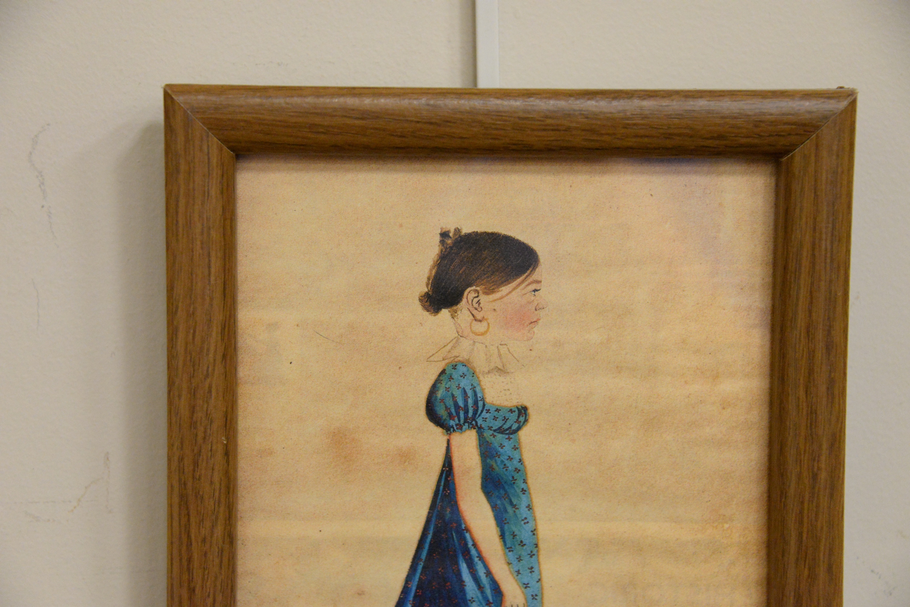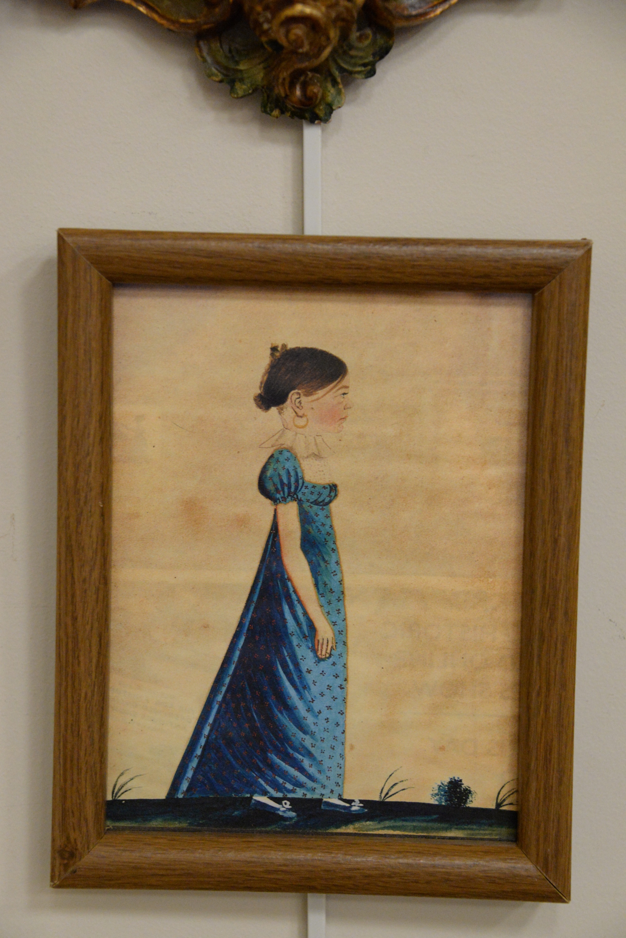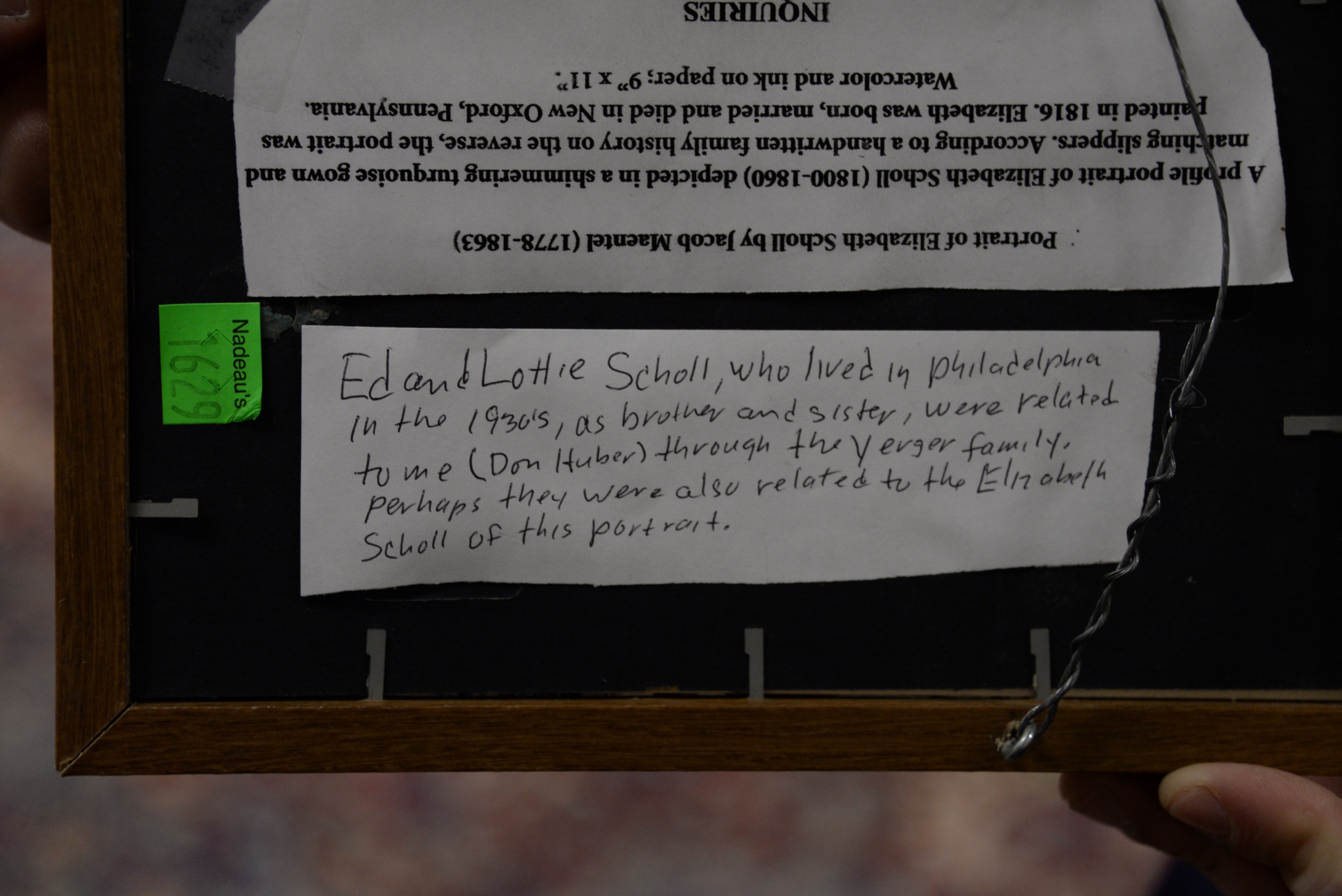 label on verso reads “A profile portrait of Elz Sch (1800 – 1860) depicted in a shimmering turquoise gown and matching slippers.