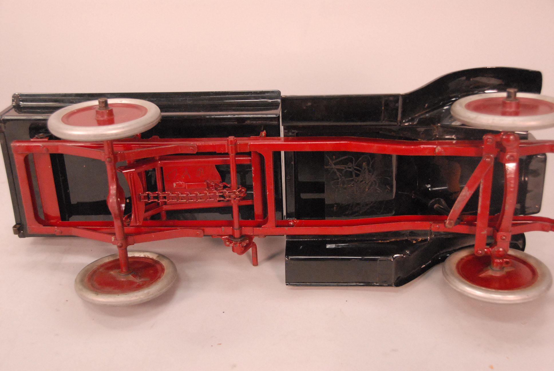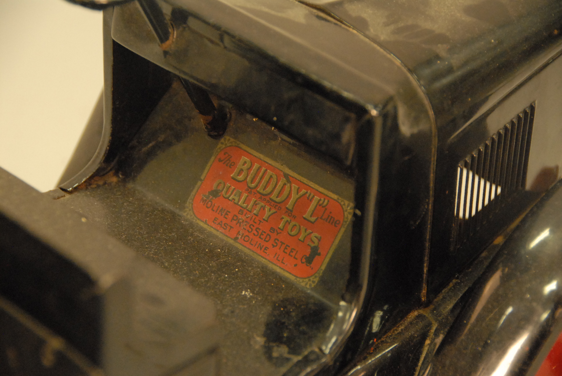 Buddy L dump truck with original black paint and red decal. lg. 23 1/2in.