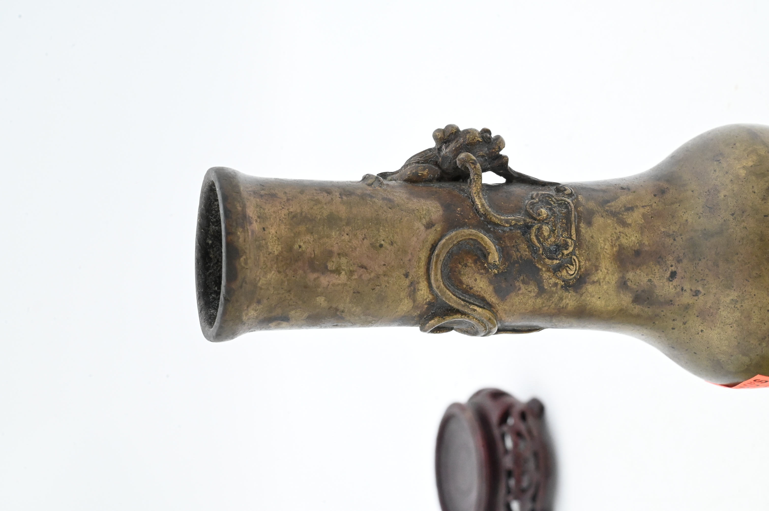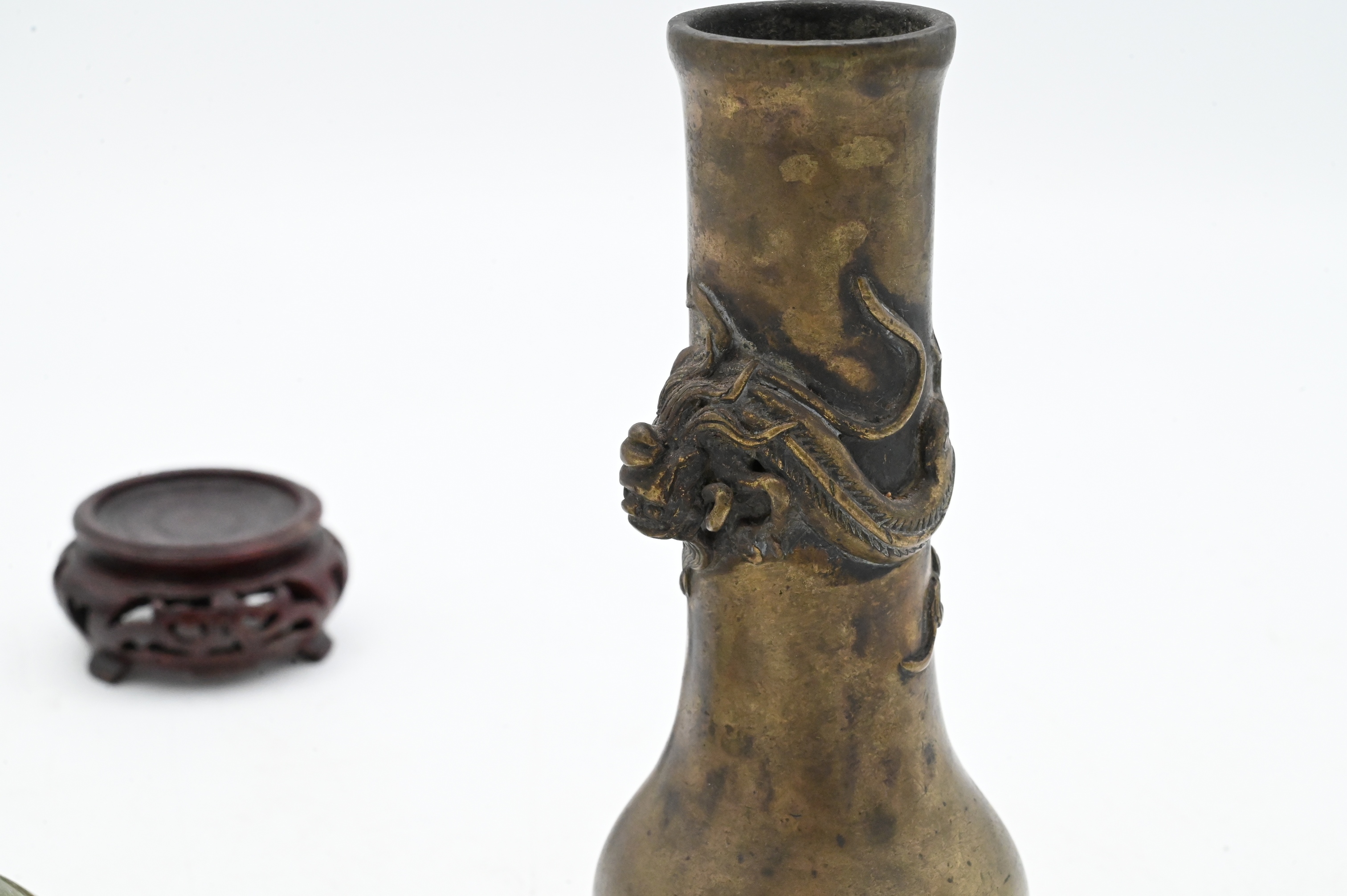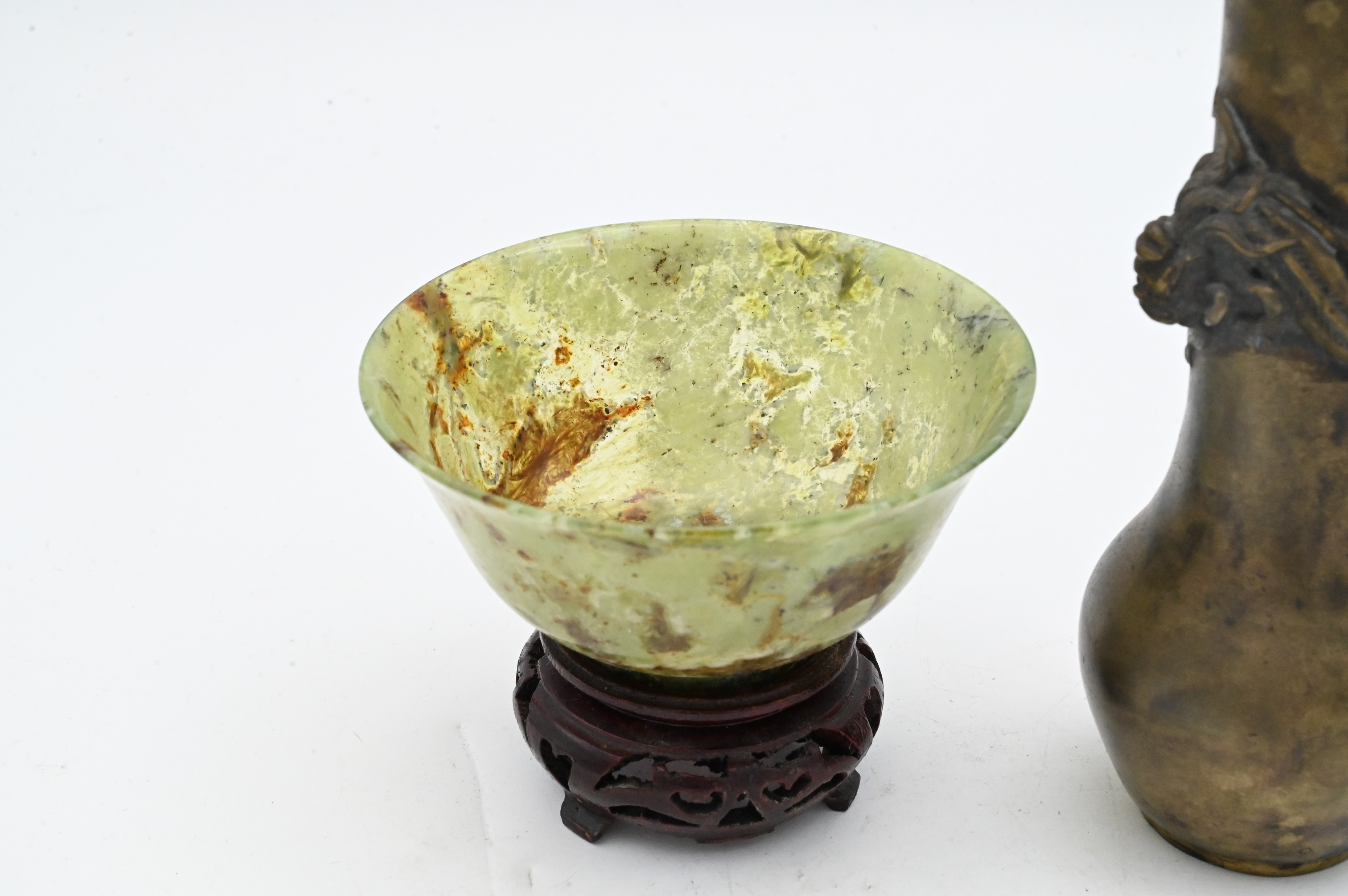 The bowl carved spinach jade, of flared form, raised on a carved wood stand; together with a small bronze vase of pear form, applied with a high-relief dragon to the neck
