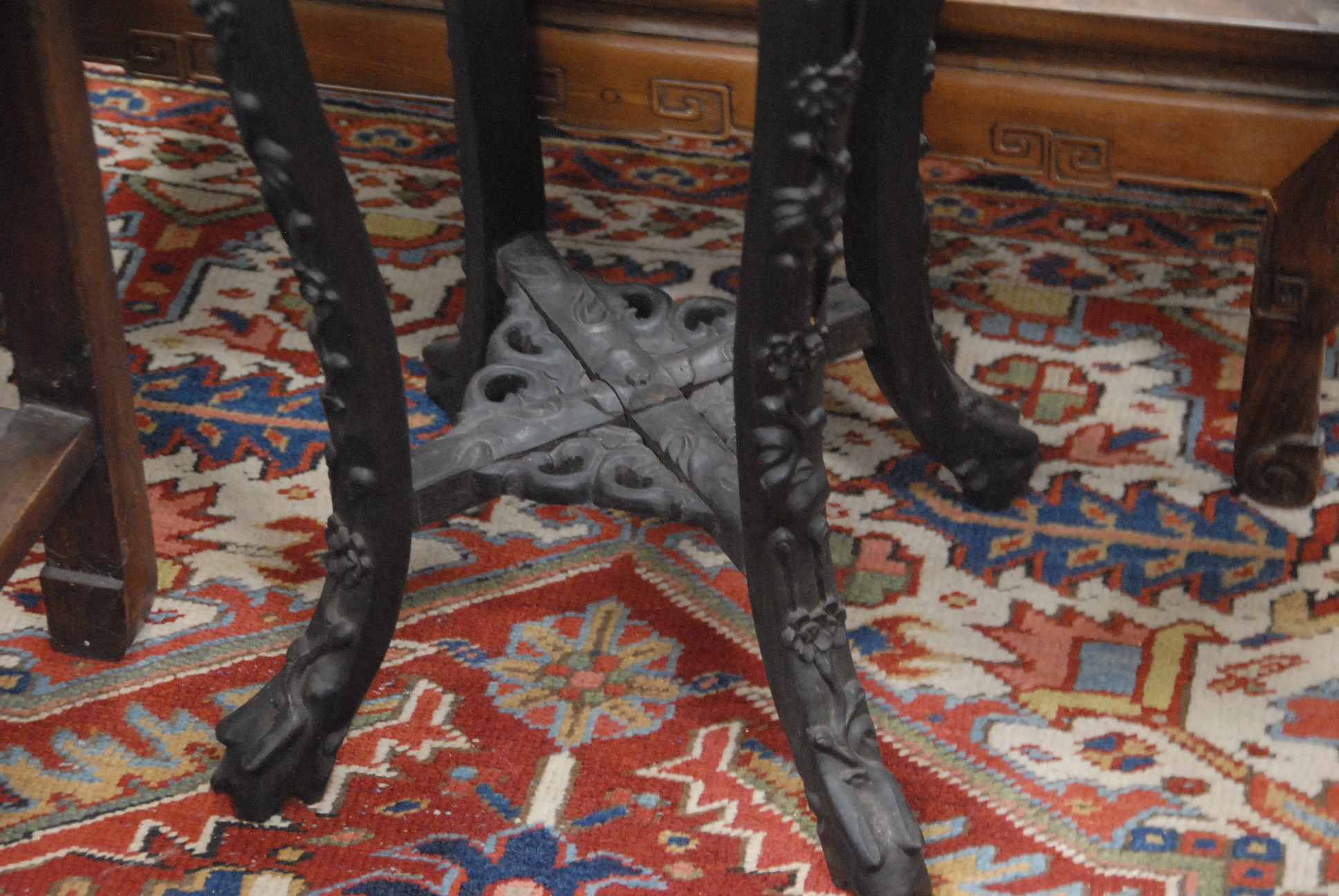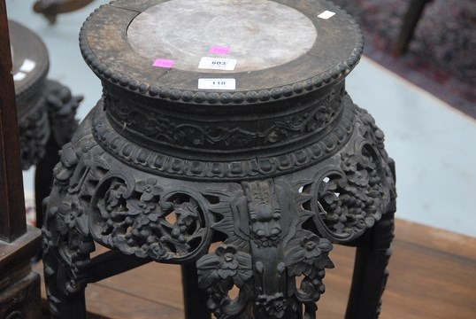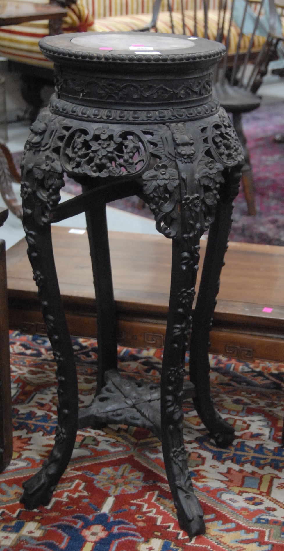 Chinese rosewood stand with inset marble top, pierce carved. ht. 35in.