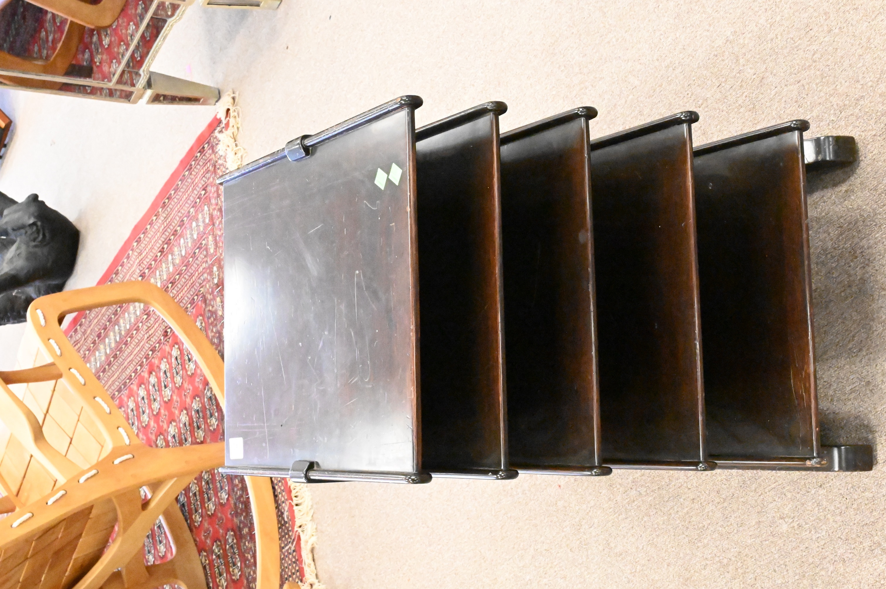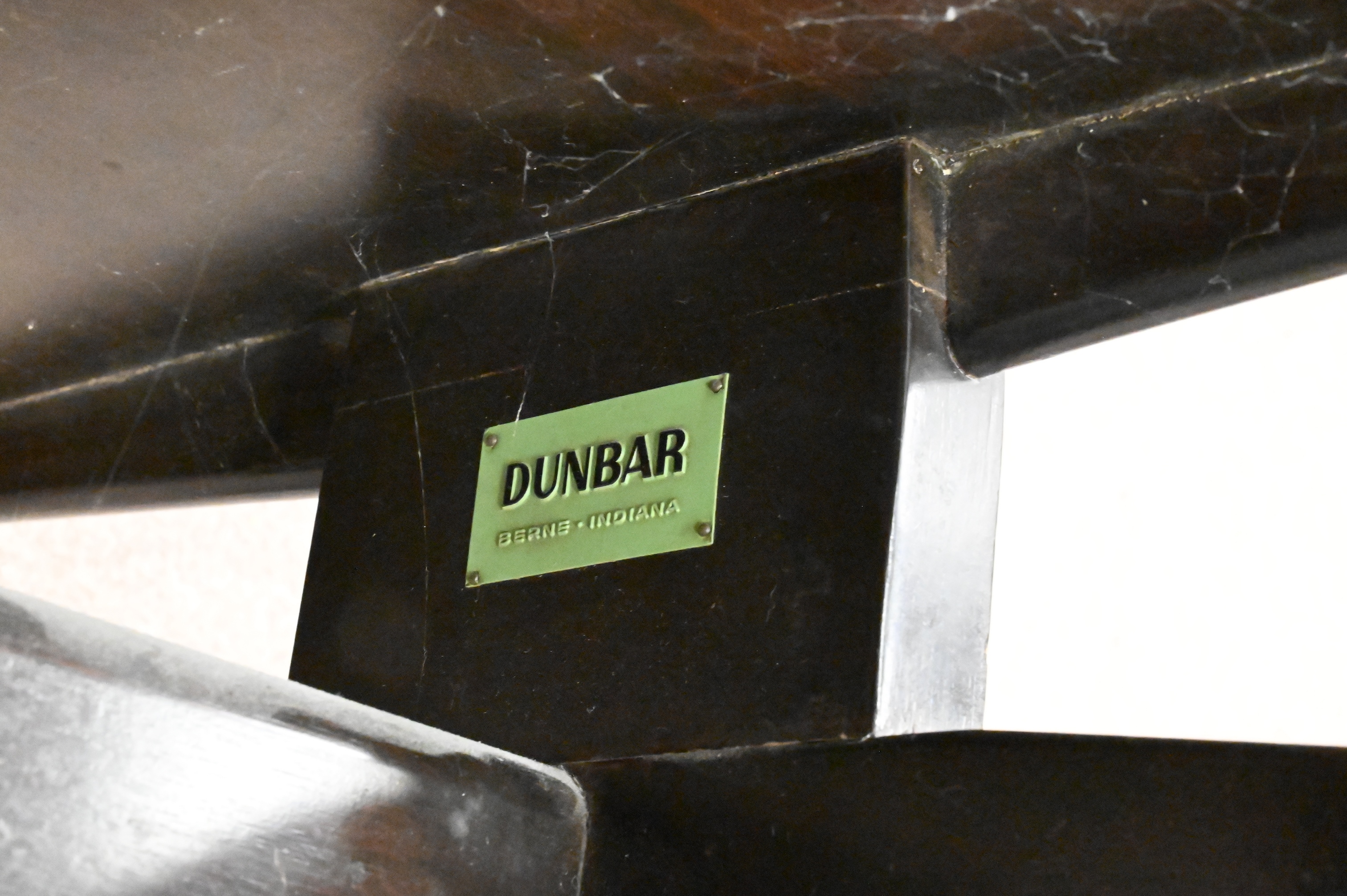 having five double-sided graduated tiers on trestle supports, metal tag embossed DUNBAR/BERNE INDIANA on the underside, circa 1951