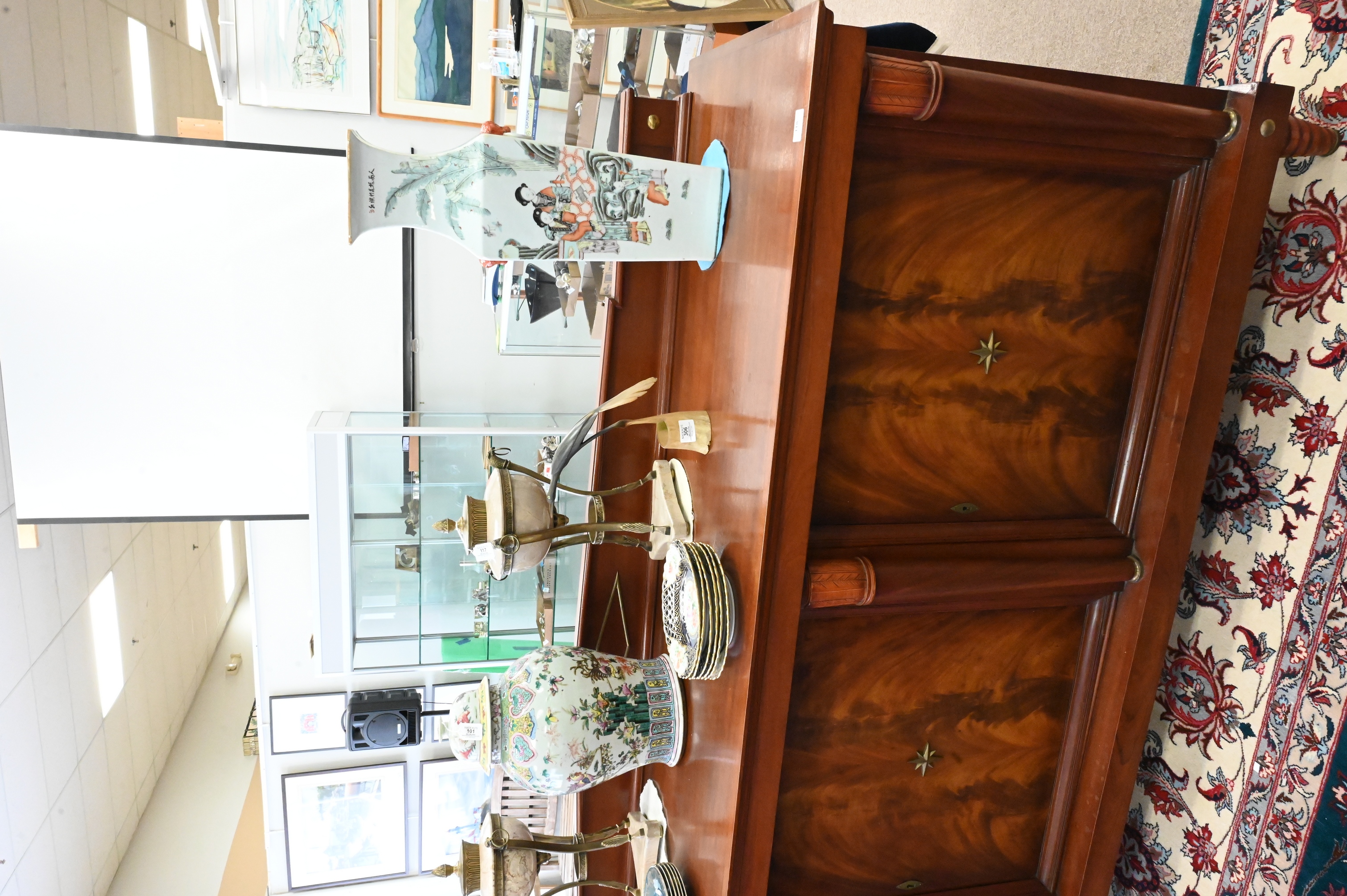 having brass mounts, three doors flanked by turned columns over twisted feet