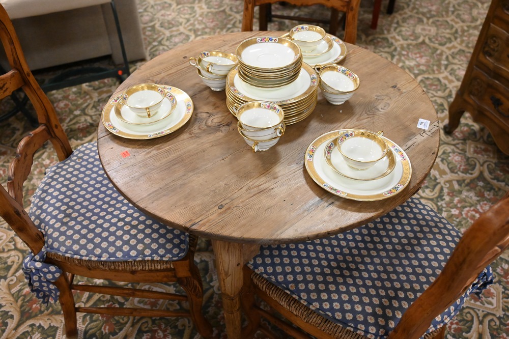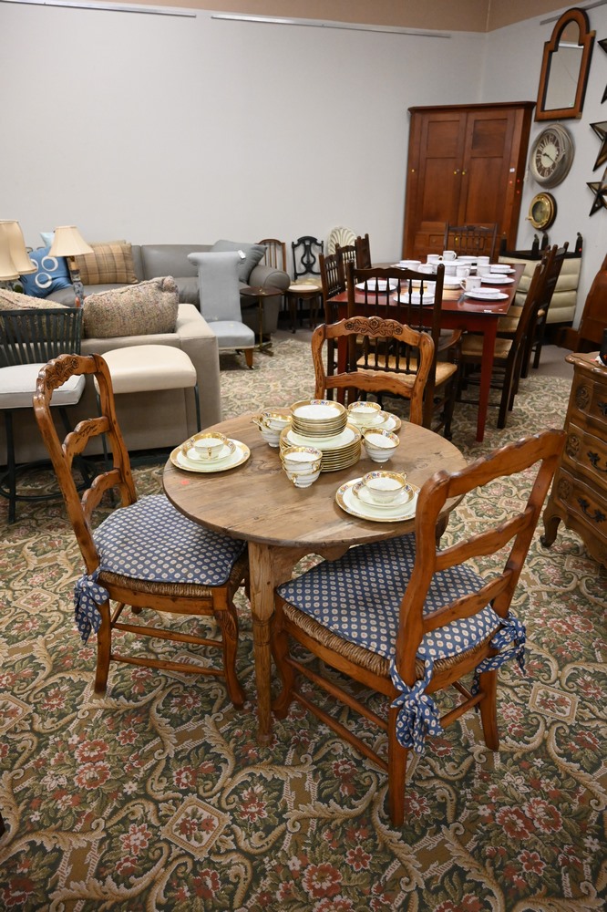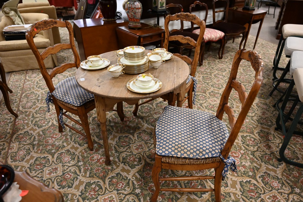 Lot 118: Four Piece French Set, to include a round table and three rush seat chairs, height 27 inches, diameter 34 inches.