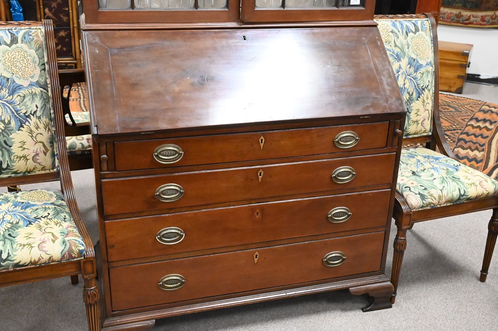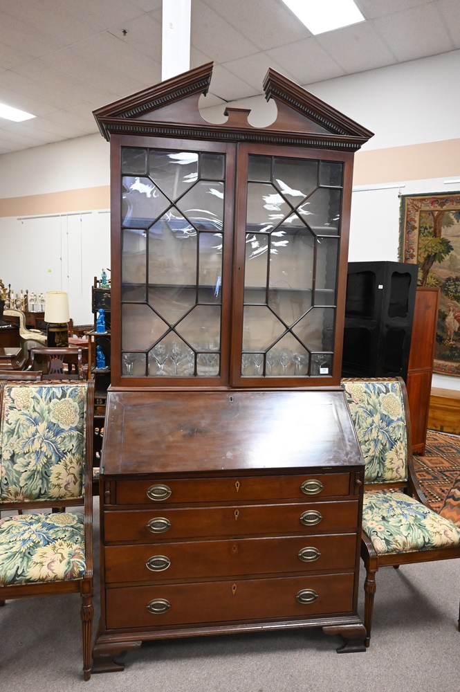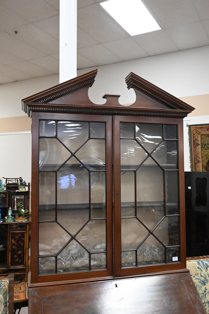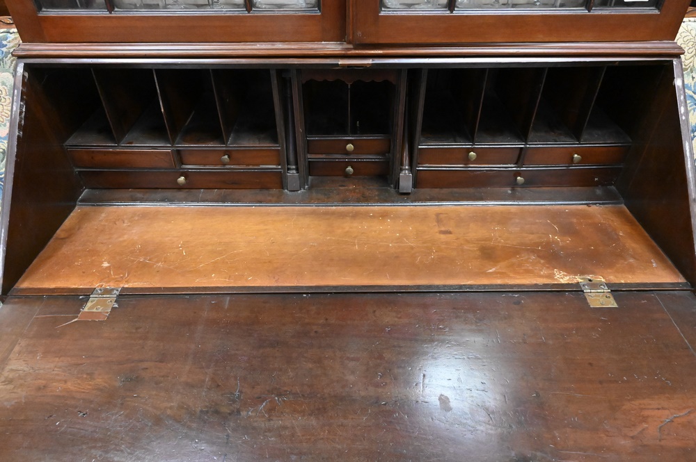 George III Mahogany Secretary Desk, in two parts, upper section with two cracked glass panels, 18th century, height 95 inches,