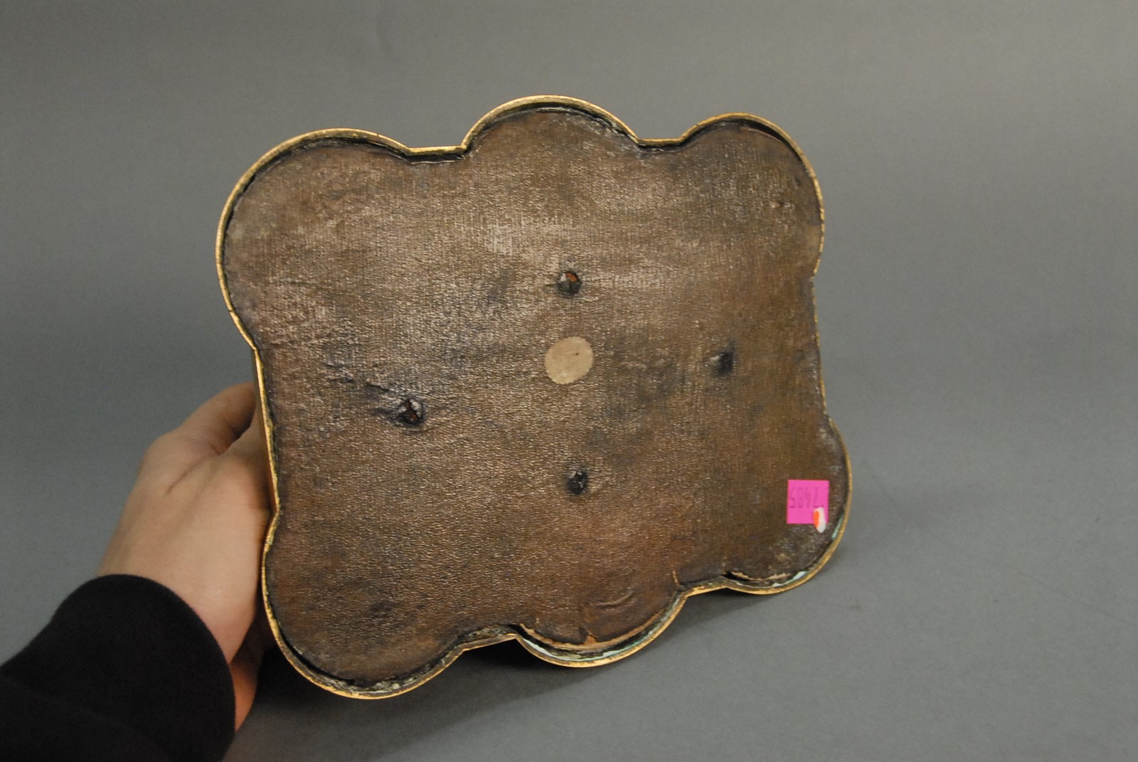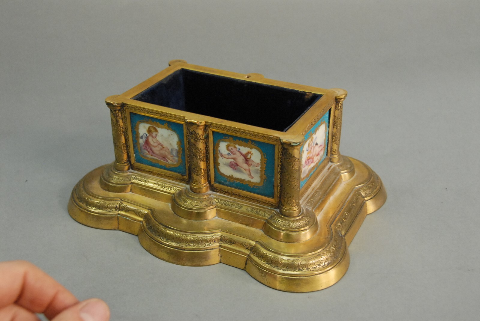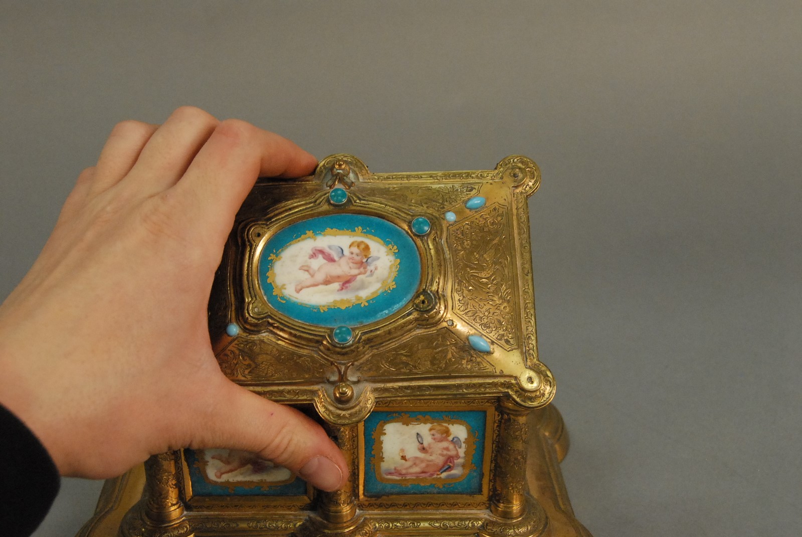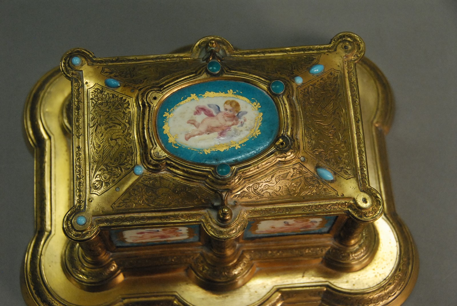 Lot 118: Gilt jewel box mounted with seven painted porcelain panels and small blue stones six small stones missing, cover hinge loose. ht. 5 in. lg. 9 in.