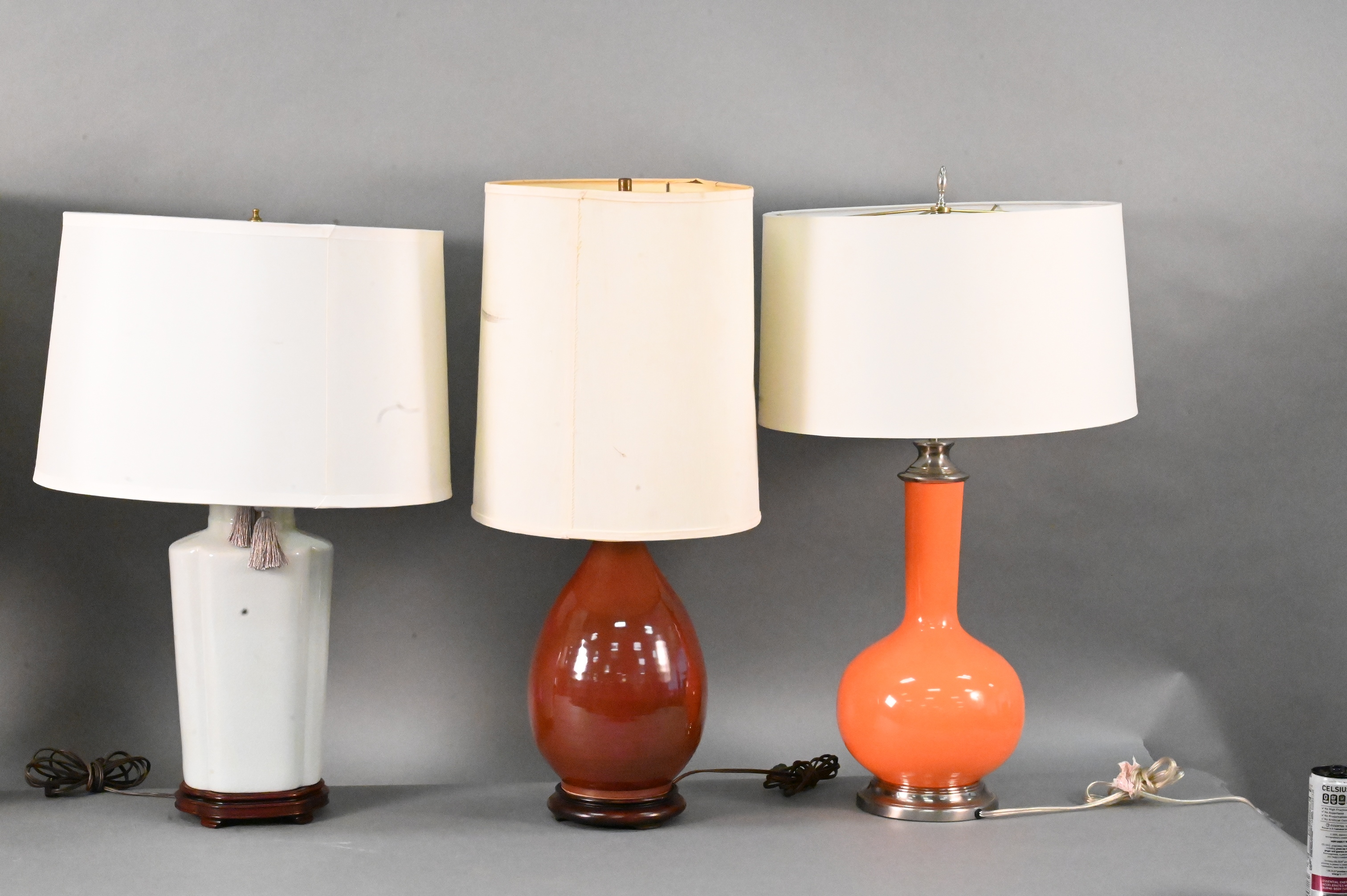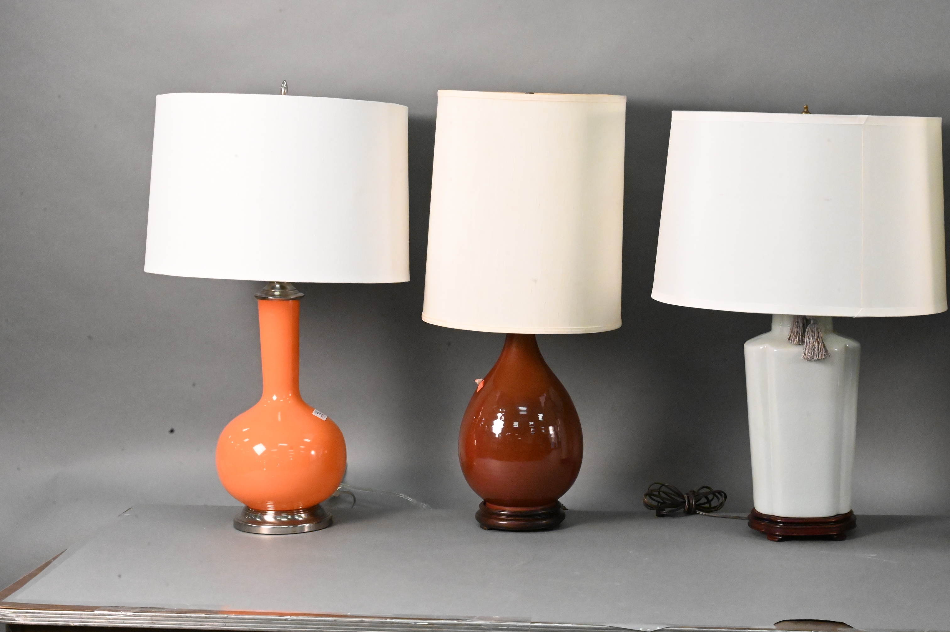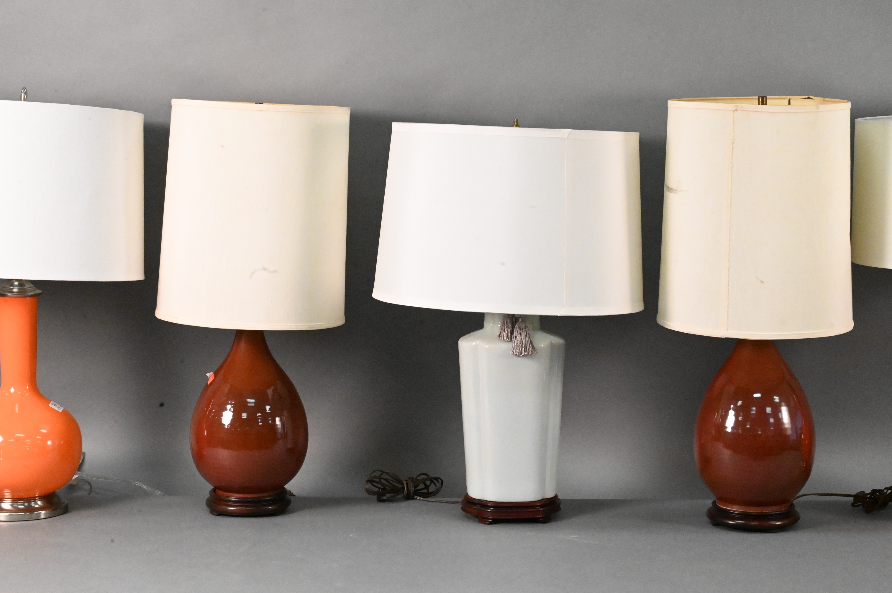 Group of Five Chinese Style Vase Table Lamps, to include a pair of red glazed bottle vases, a pair of orange bottle vases, along with a celadon crackle glaze, tallest 31 inches.