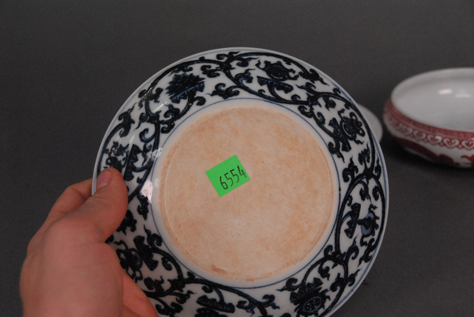 Lot 118: Group of three Oriental porcelain pieces to include a blue and white bowl dia. 7in., Famille rose plate with Guanyin figure having Y…