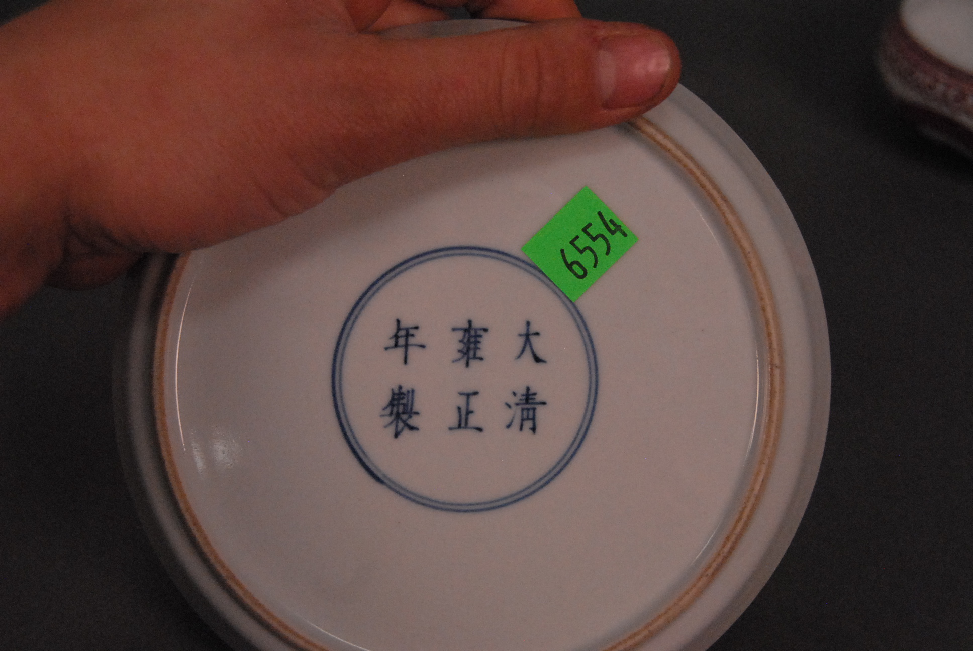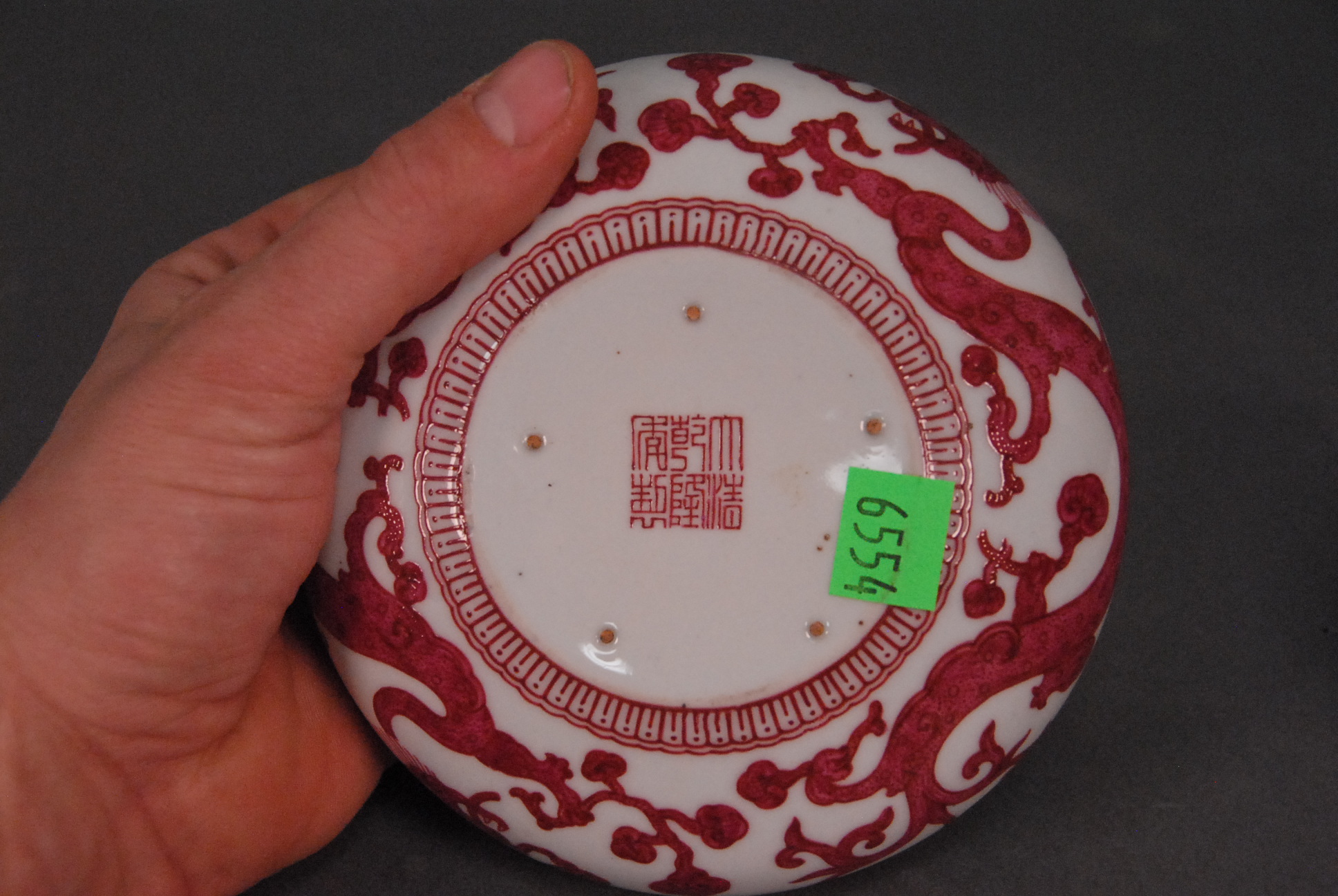 Group of three Oriental porcelain pieces to include a blue and white bowl dia. 7in., Famille rose plate with Guanyin figure having Yongzheng mark, and dragon bowl with Qianlong mark on bottom.