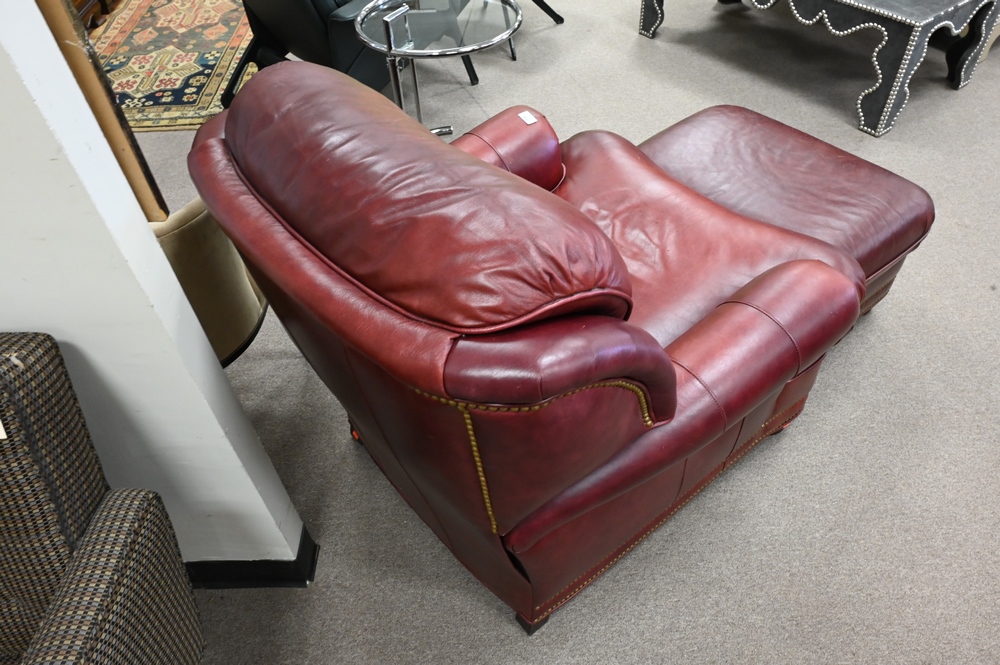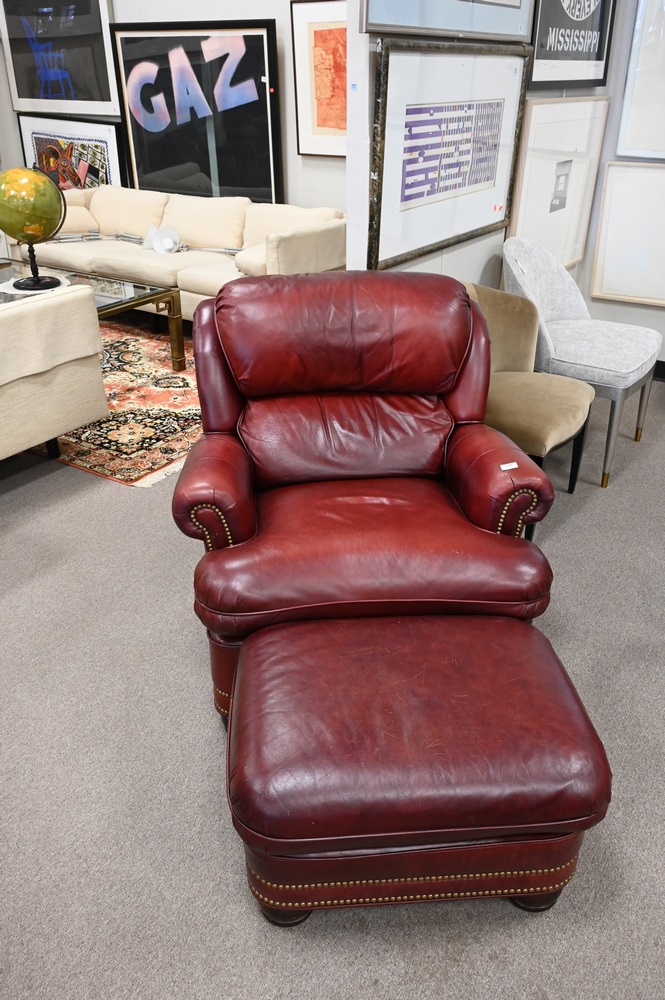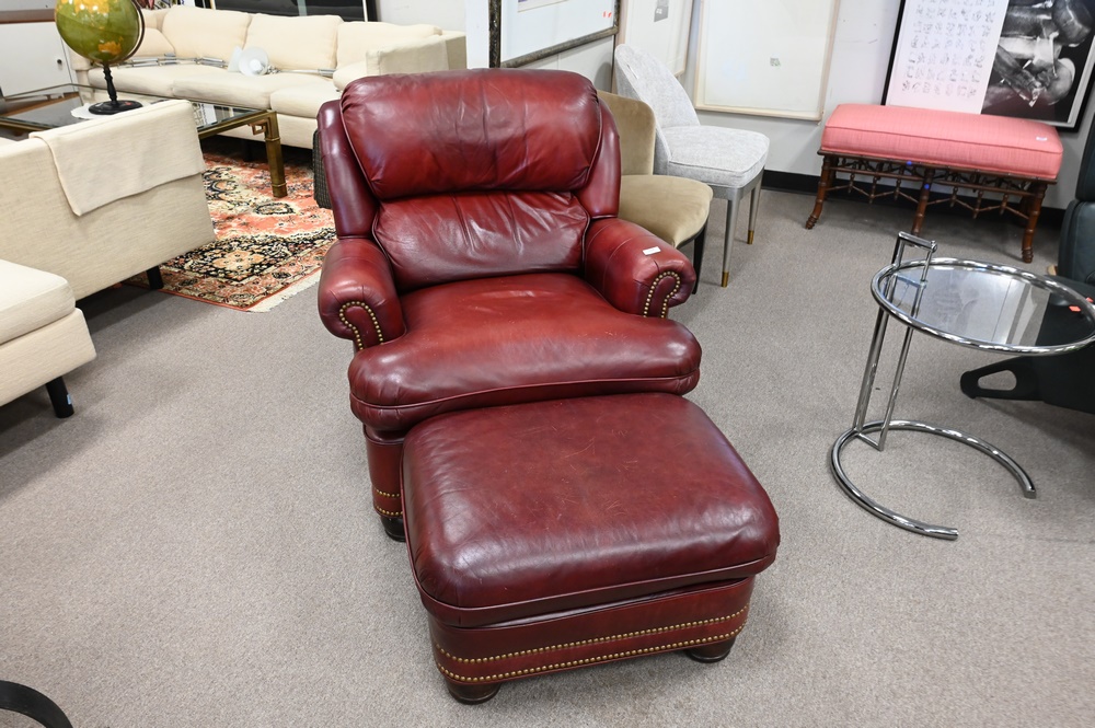 Lot 118: Hancock and Moore Leather Upholstered Easy Chair, with matching ottoman, height 36 inches, width 35 inches.