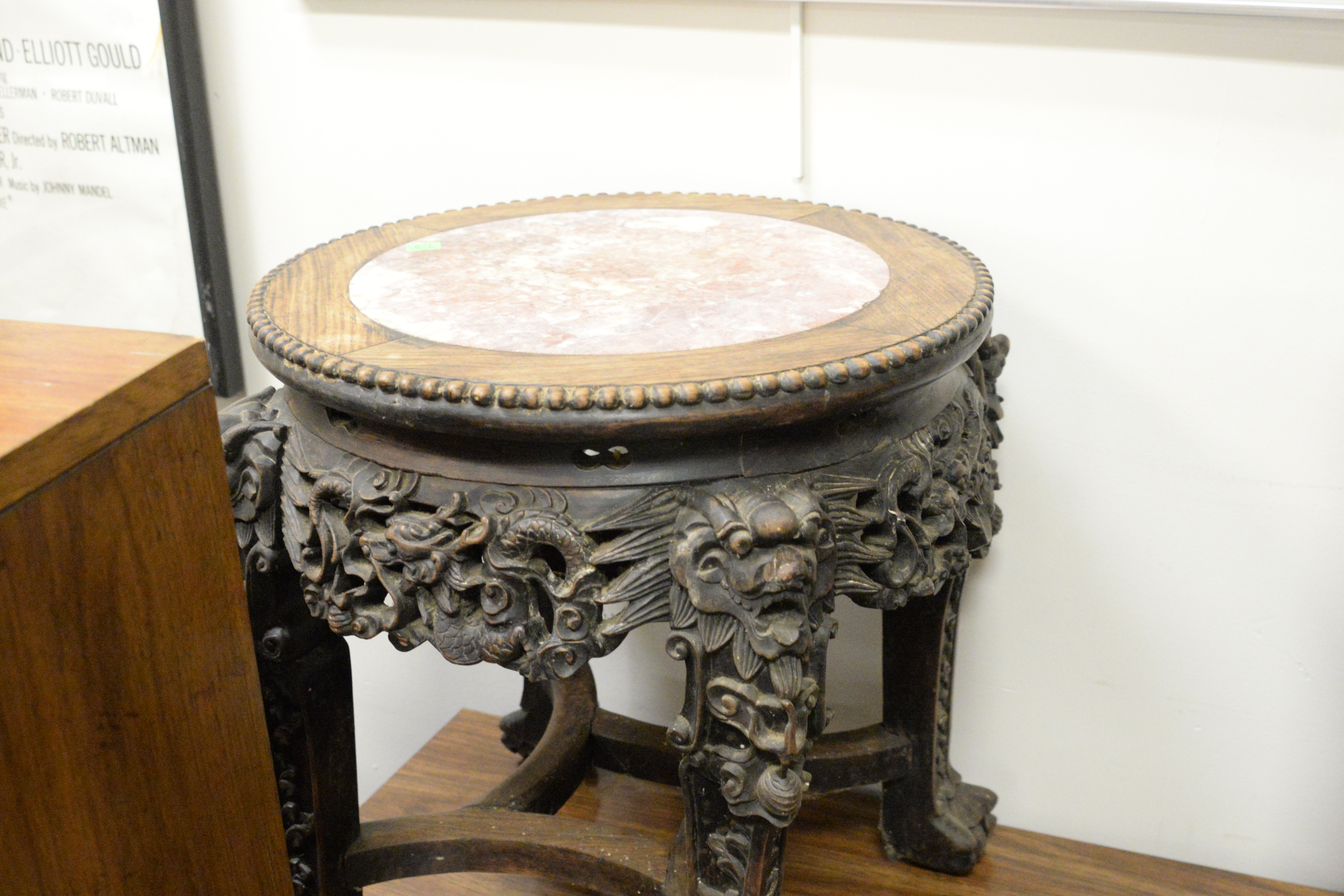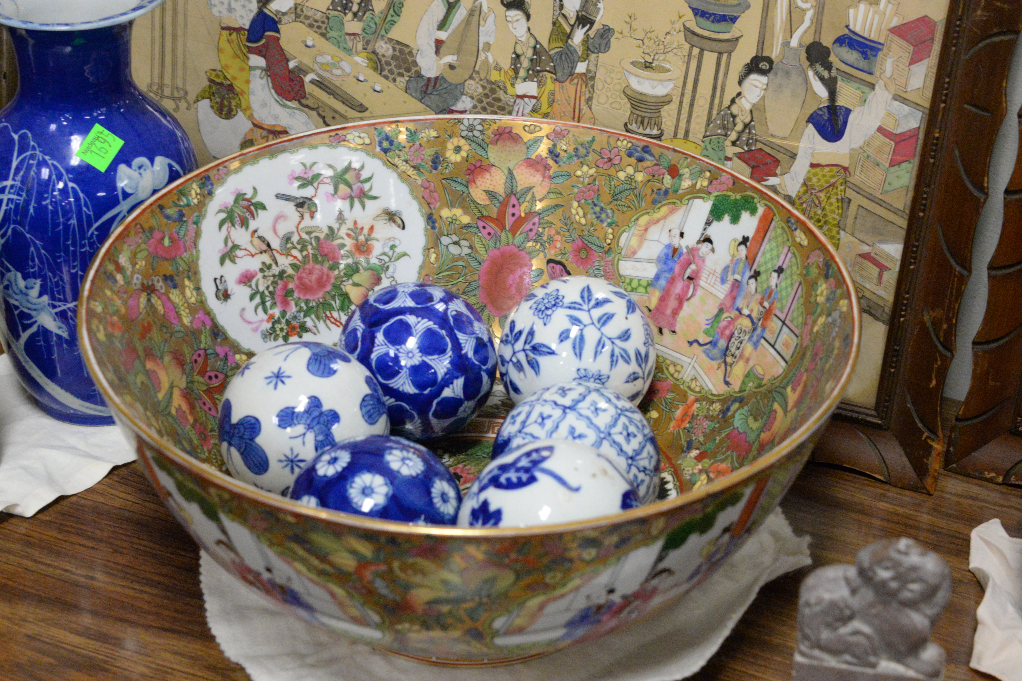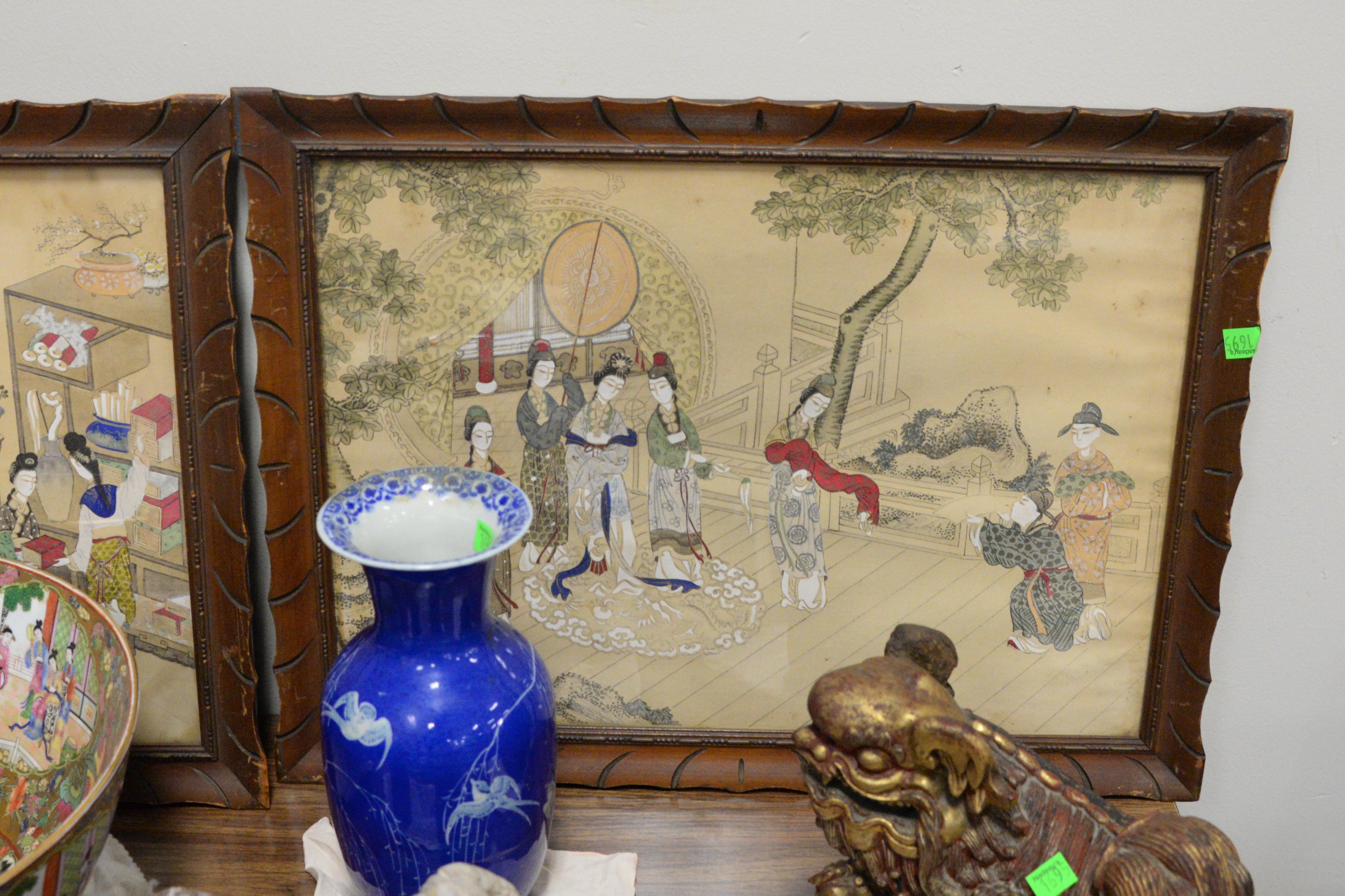 Large Grouping of Asian Items To Include, artwork, cases, stone seals, wood foo dogs, famille rose bowl, stools, urns, tallest height 37 inches