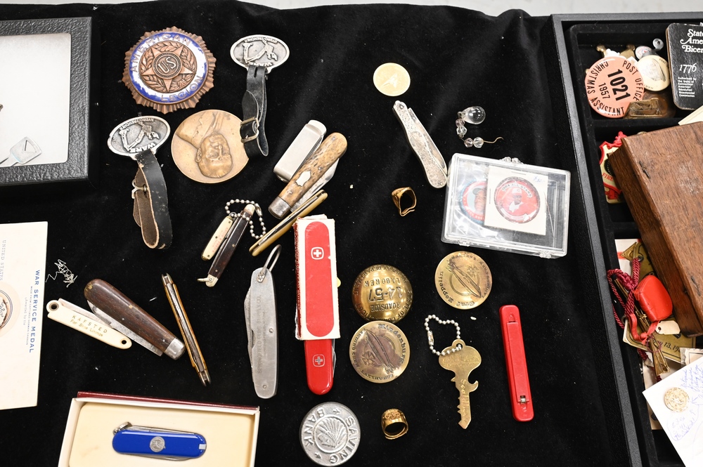 Lot of Pins, Medals and Pocket Knives, to include various topics such as political and Hartford Bridge.