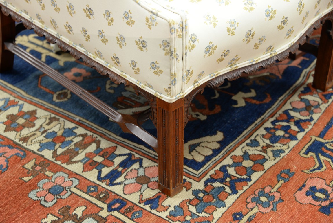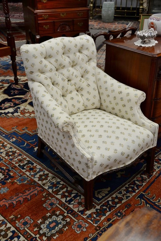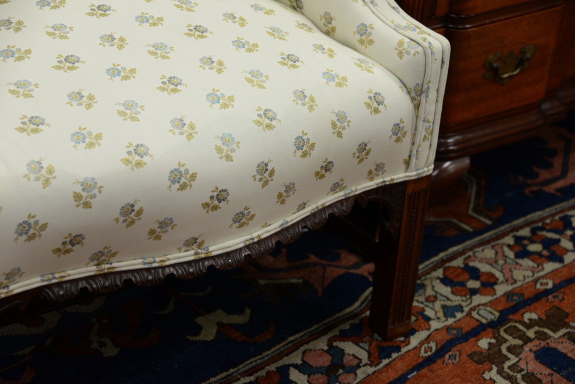 Lot 118: Margolis upholstered Chippendale style chair having carved skirt on carved molded square legs