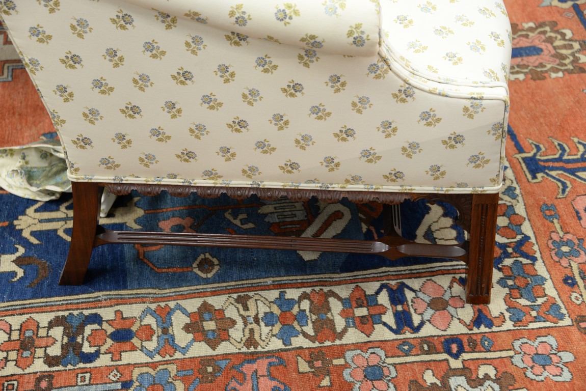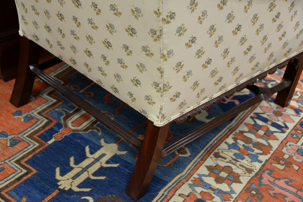 Margolis upholstered Chippendale style chair having carved skirt on carved molded square legs. wd. 32in.