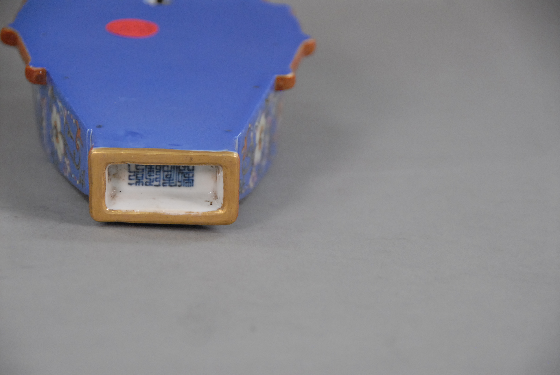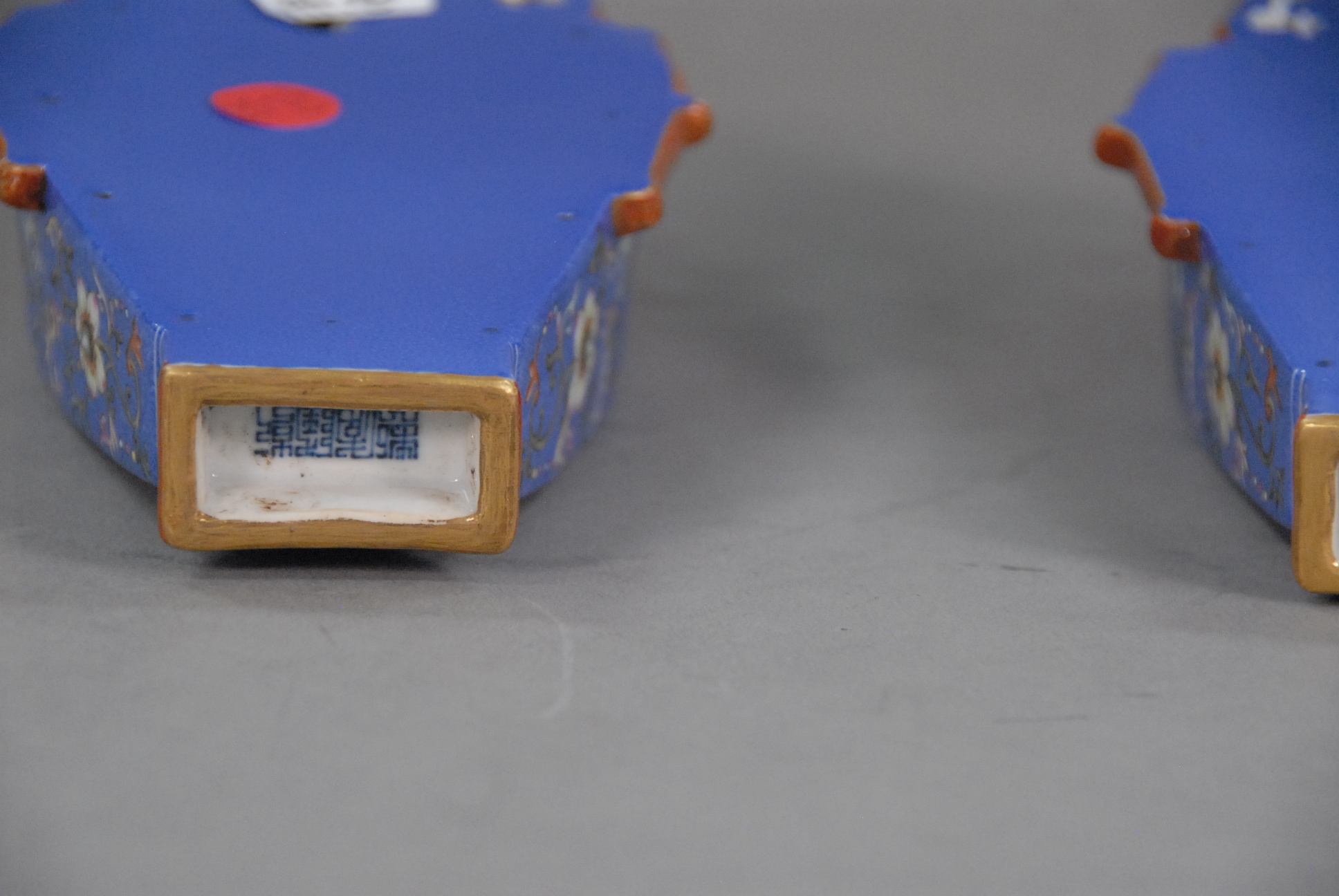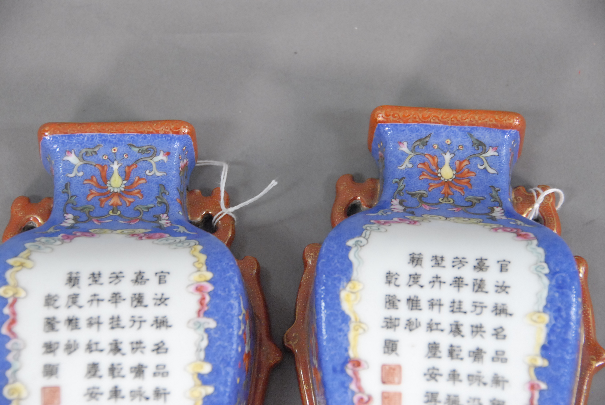 Pair of Famille rose wall pocket vases having center panel with characters, seal mark on bottom.