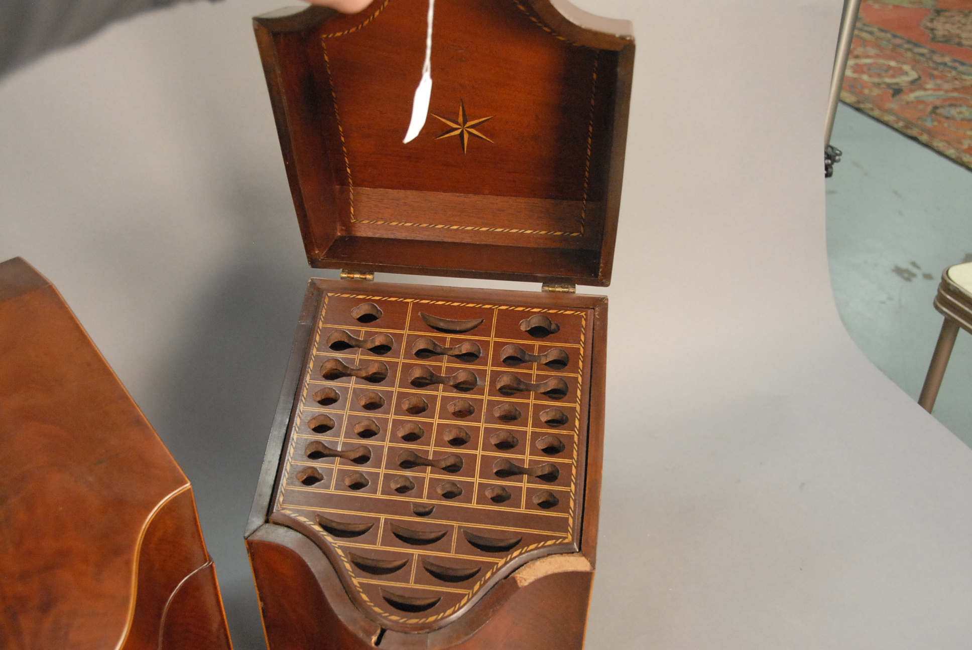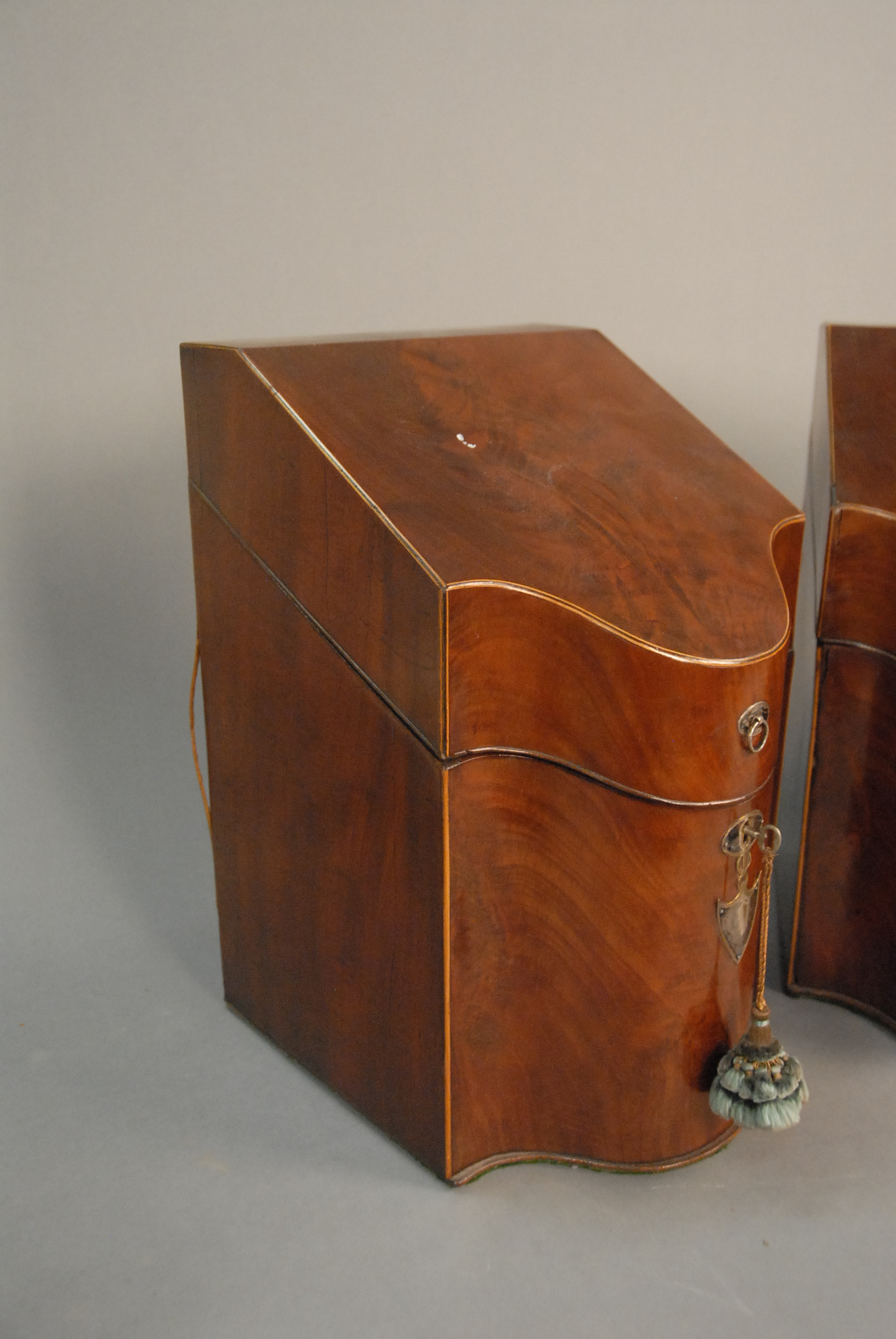 Pair of George III inlaid mahogany knife boxes with serpentine fronts and shield-form silver mounts, late 18th century – early 19th century. ht. 14in.