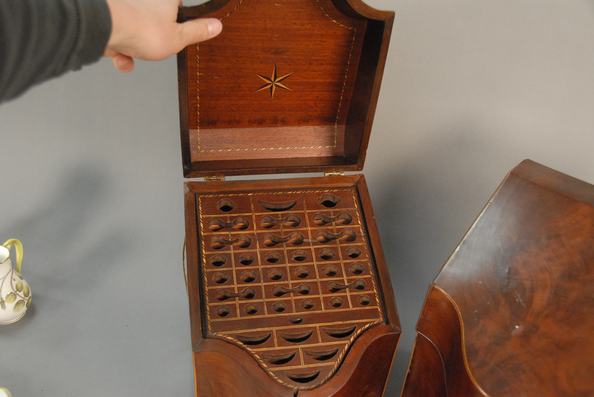 Lot 118: Pair of George III inlaid mahogany knife boxes with serpentine fronts and shield-form silver mounts, late 18th century – early 19th century. ht. 14in.