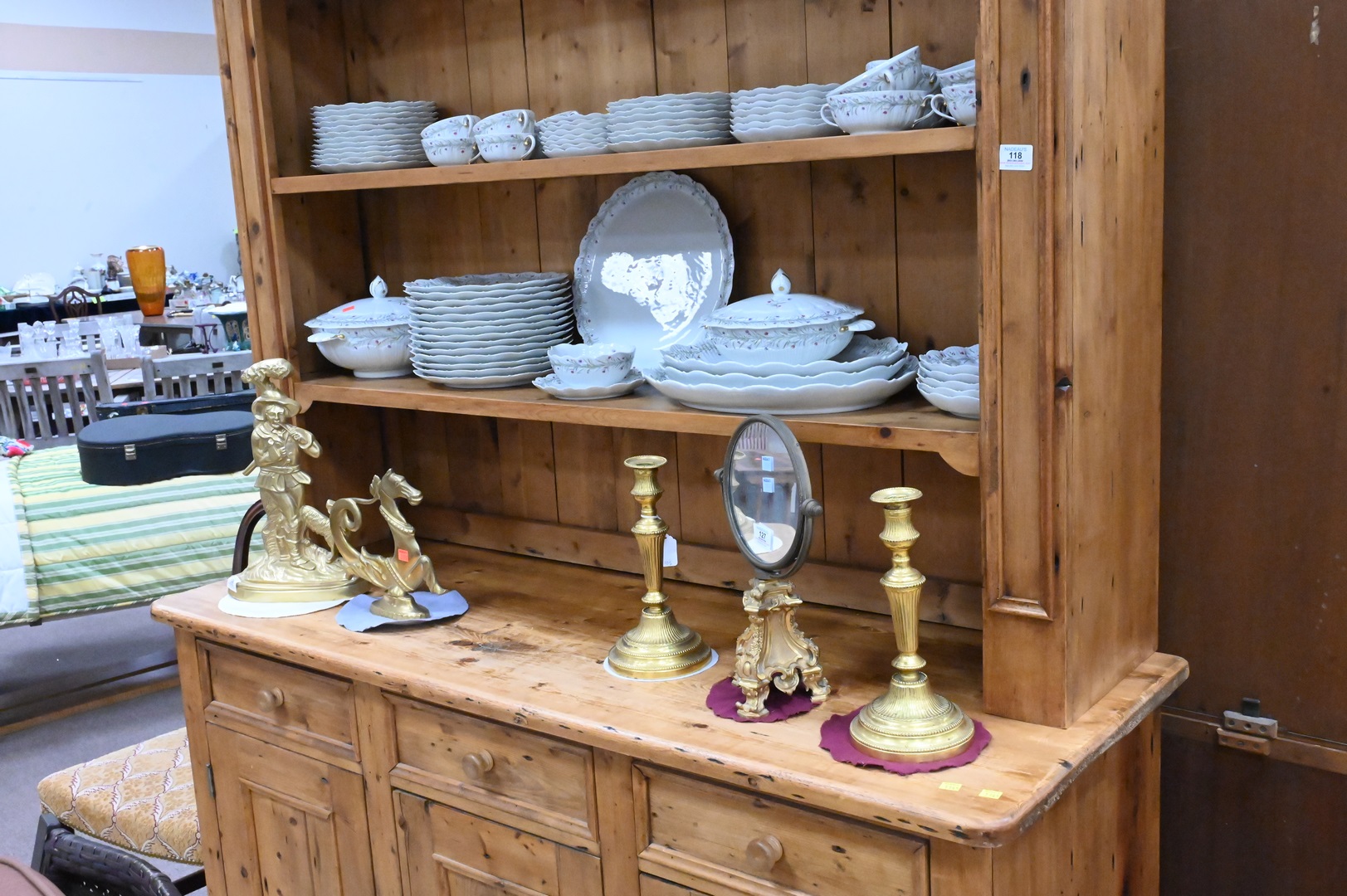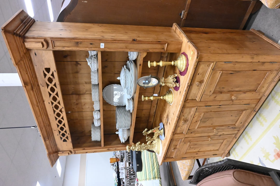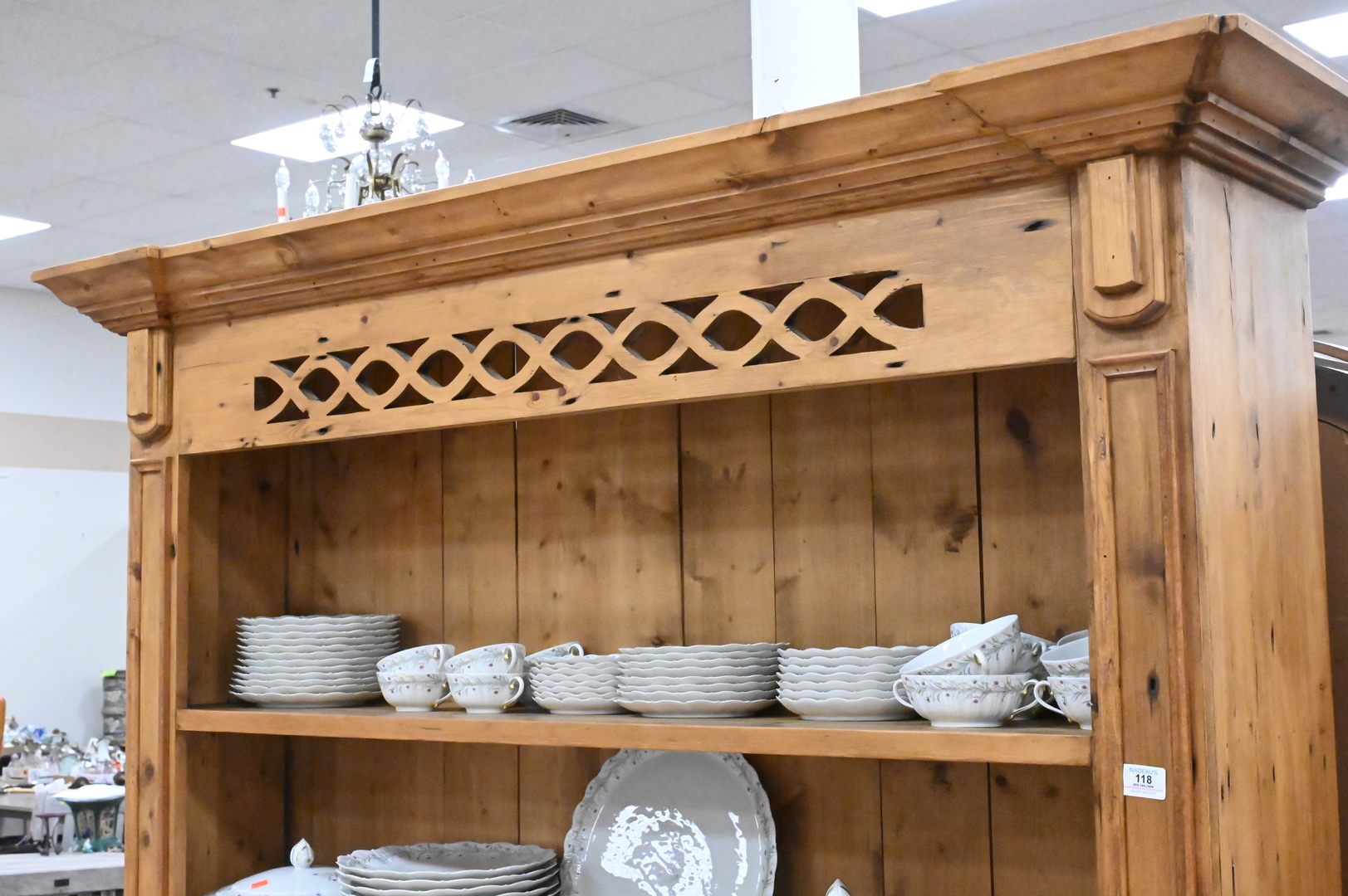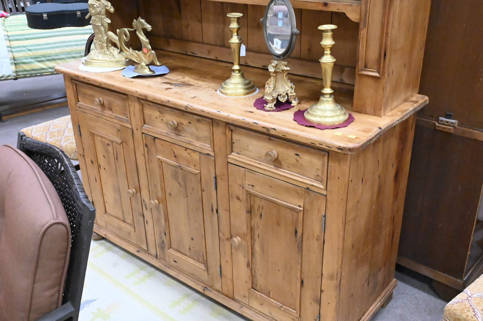 Pine Hutch in Two Parts, having open shelving over base having three drawers, over three doors, height 84 1/2 inches, width 59 inches, depth 21 1/2 inches.