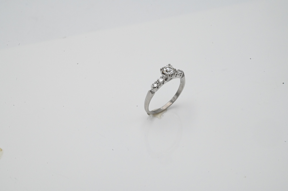 Platinum and Diamond Engagement Ring, set with center diamond, approximately .50 carats, flanked by two diamonds on either side, size 7 1/2.