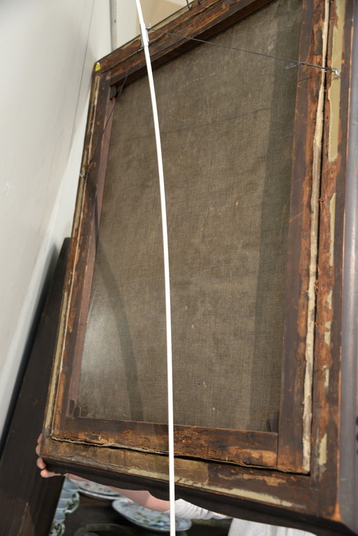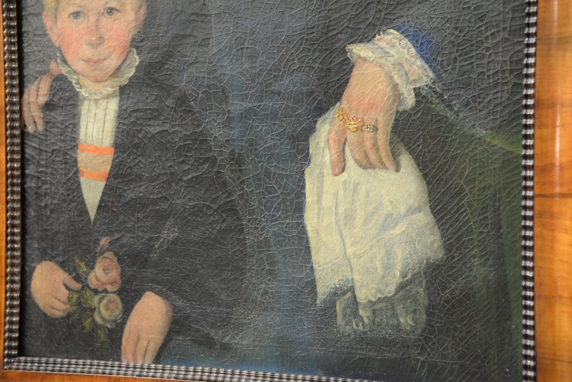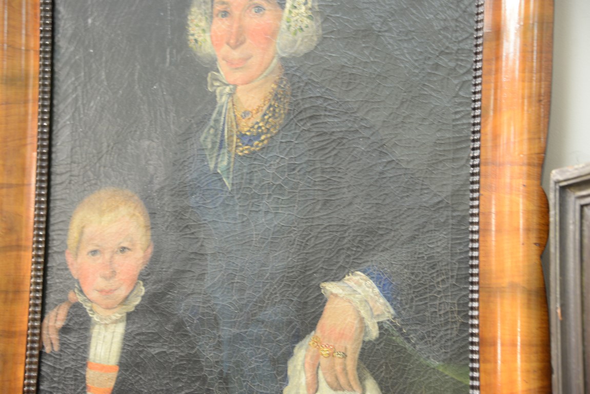 Primitive oil on canvas portrait of woman and child in walnut frame with ripple molding. 32 x 24