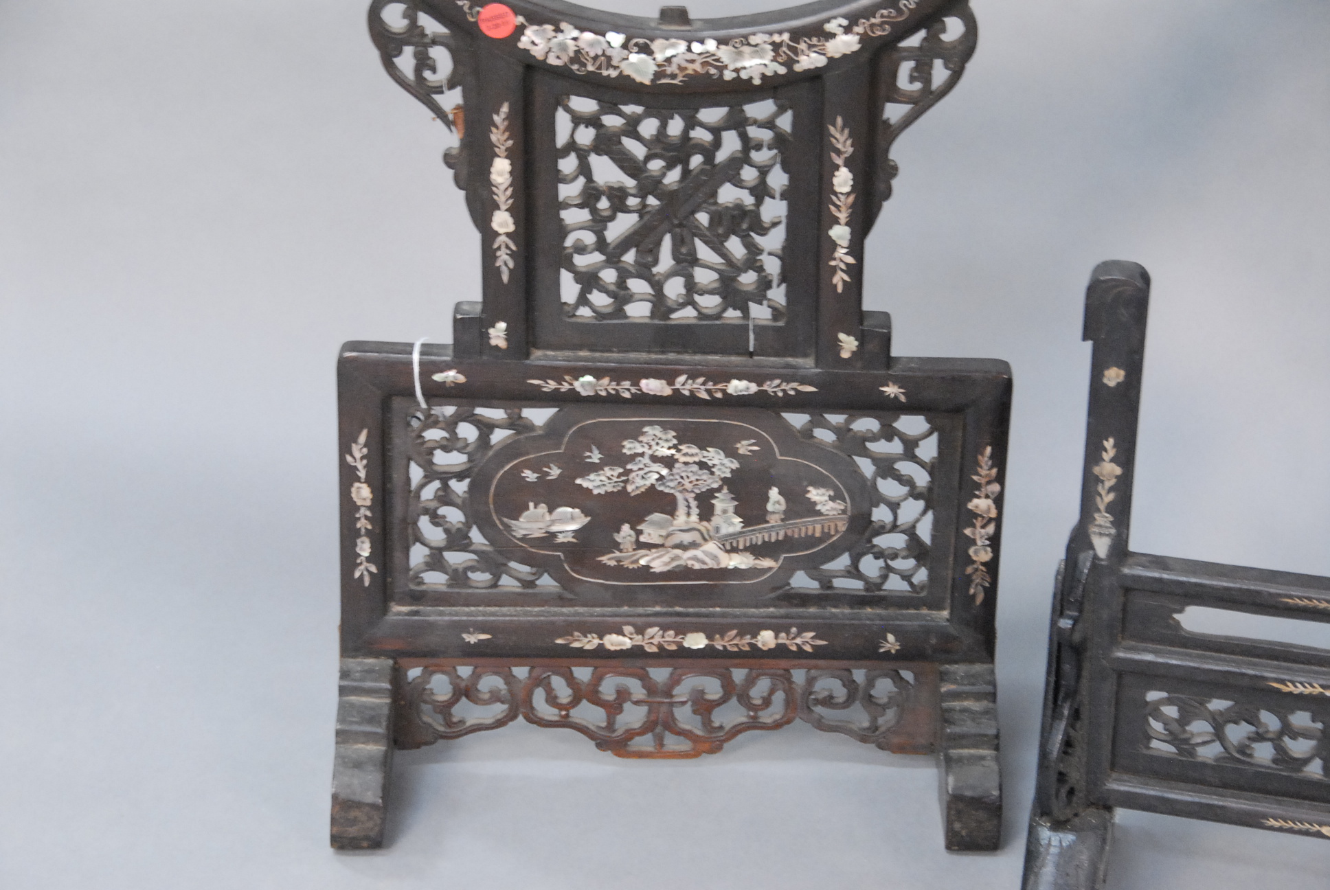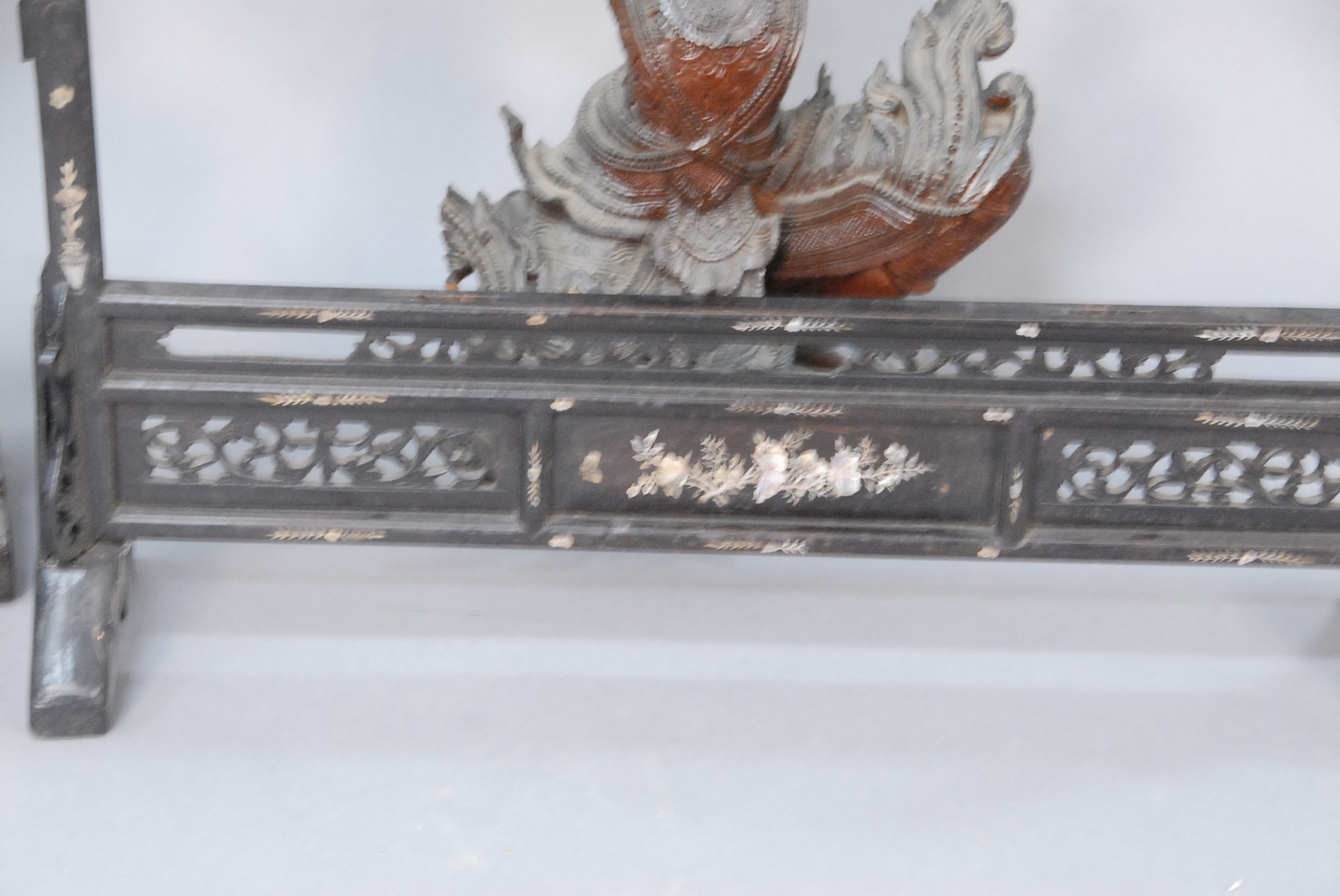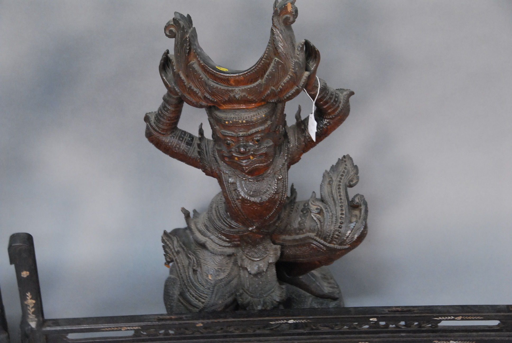 Three piece lot including Chinese carved hardwood stand with mother of pearl inlay, carved wooden stand with mother of pearl inlay, and a carved wood figure with glass eyes and ivory fangs.