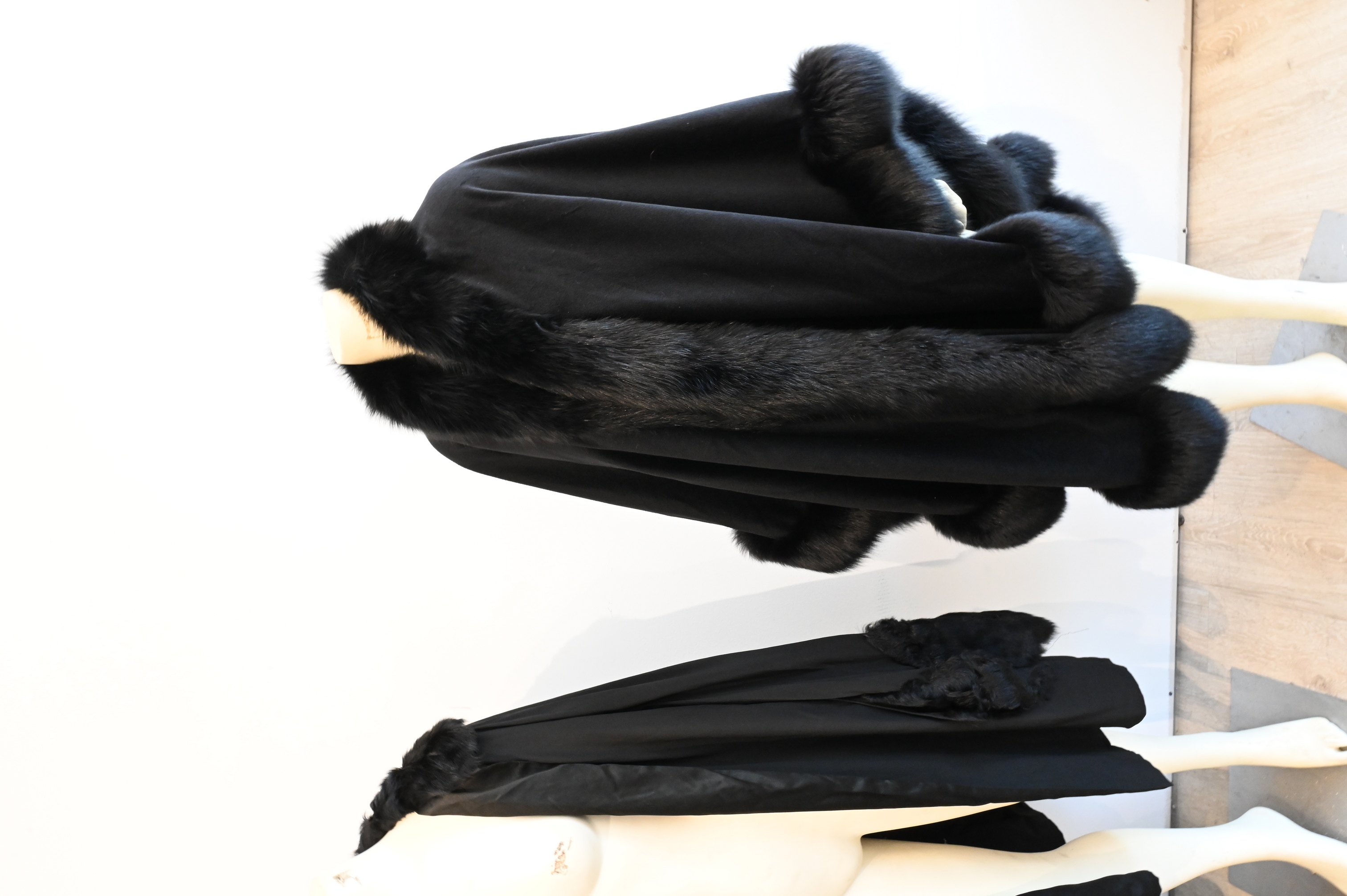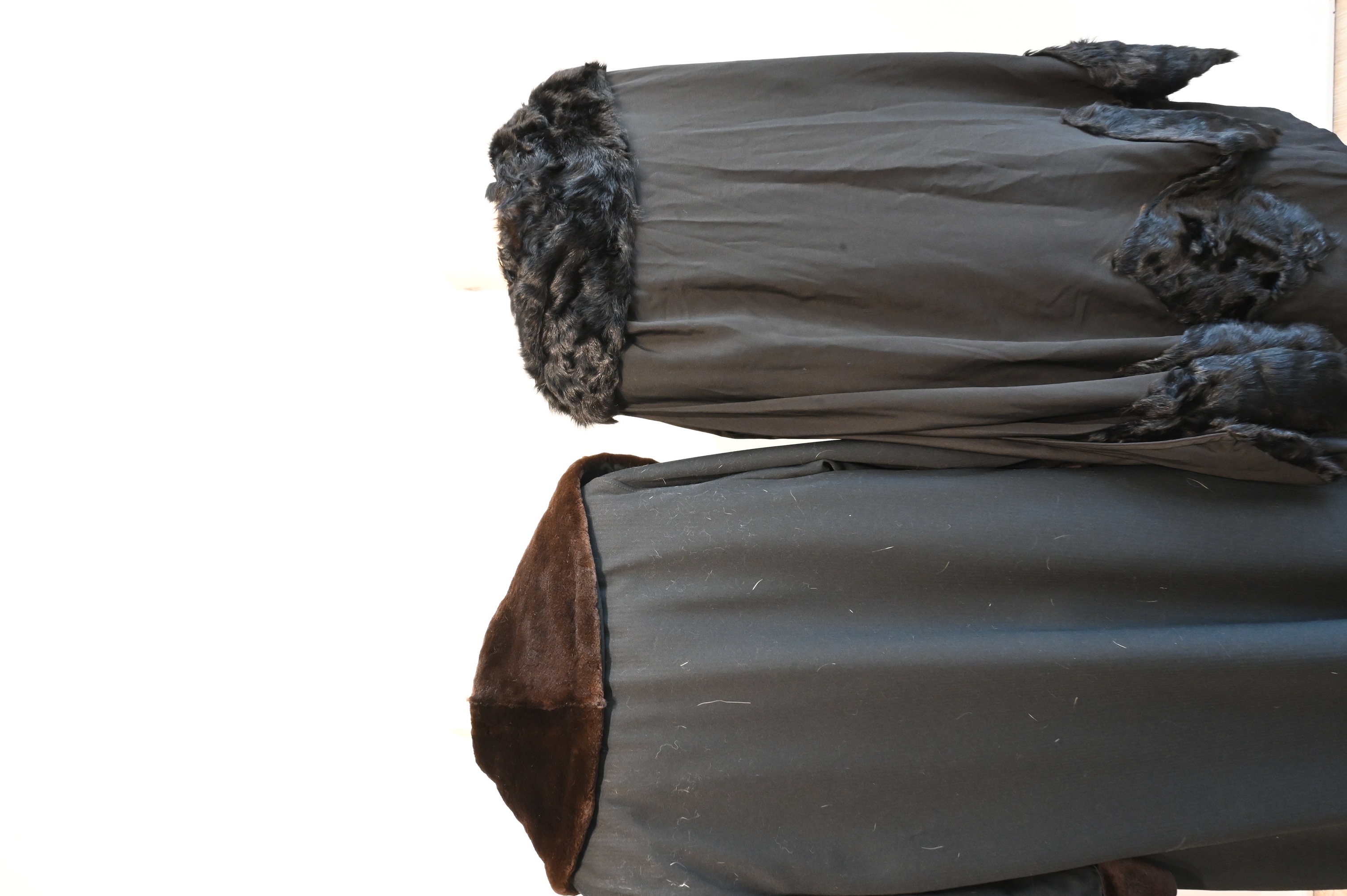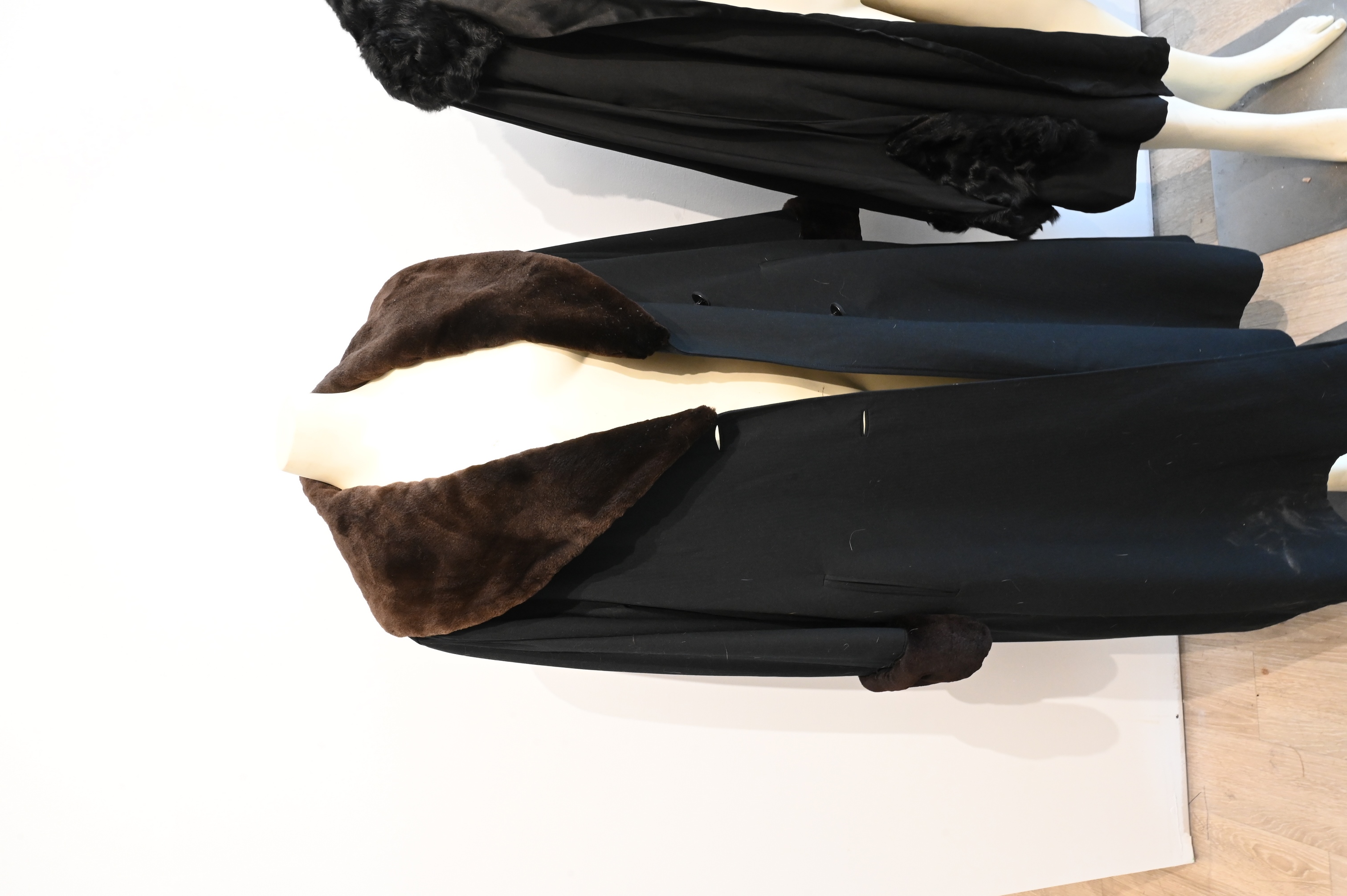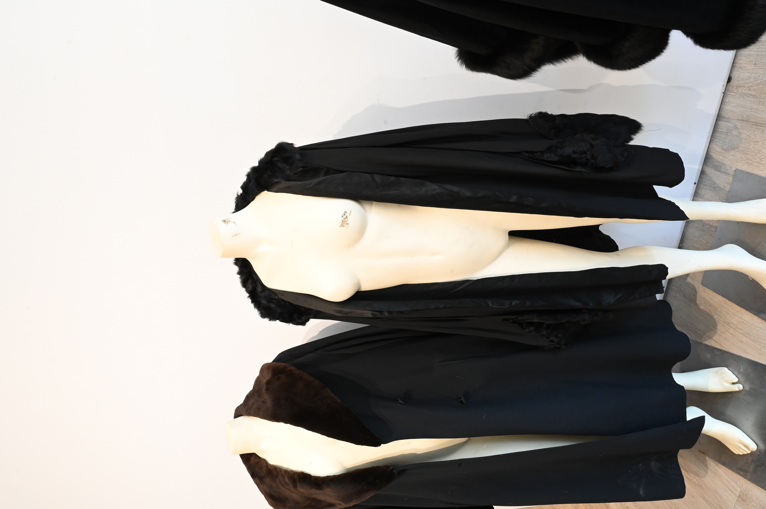 two black shawl with faux fur edge, and long coat having sheared mink interior
