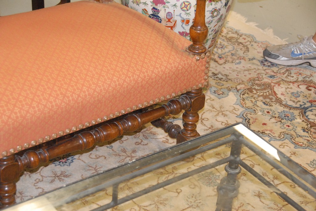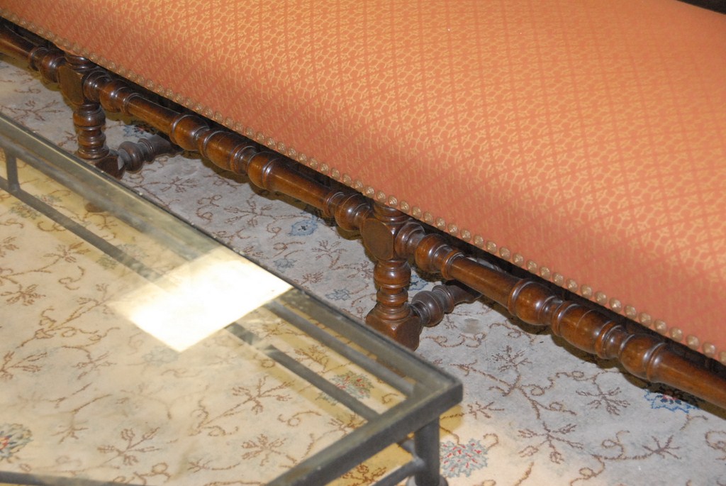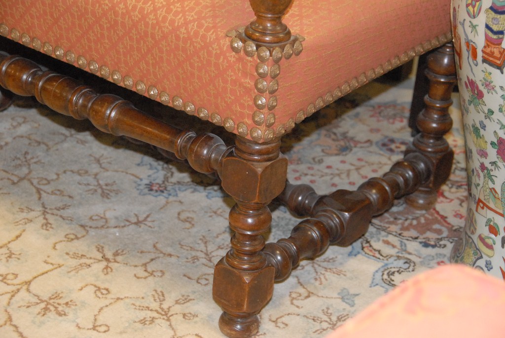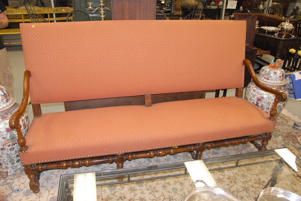 Walnut William and Mary style bench with upholstered seat and back, ht. 45, lg. 80