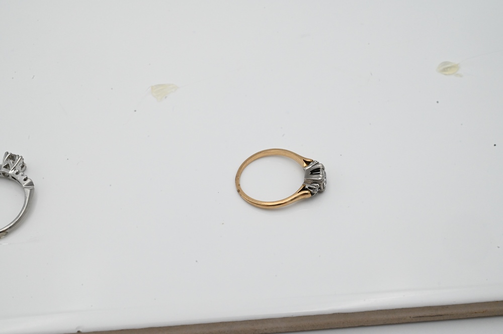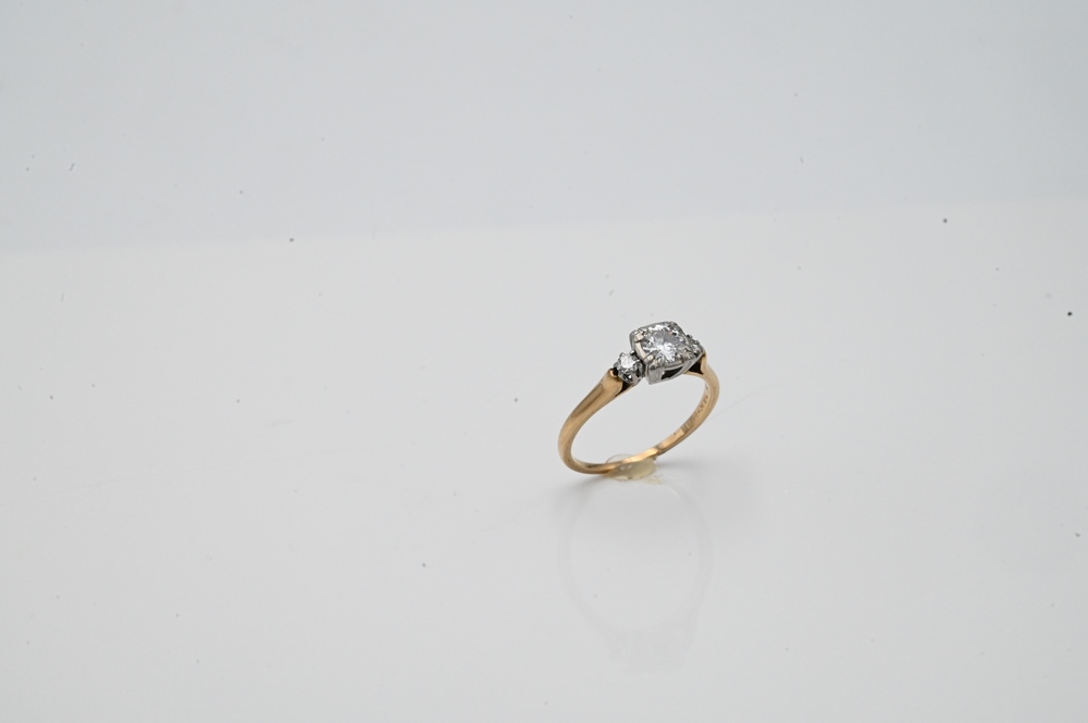 14 Karat Yellow Gold and Diamond Engagement Ring, set with center diamond approximately .50 carats, flanked by diamonds on either side, size 6.