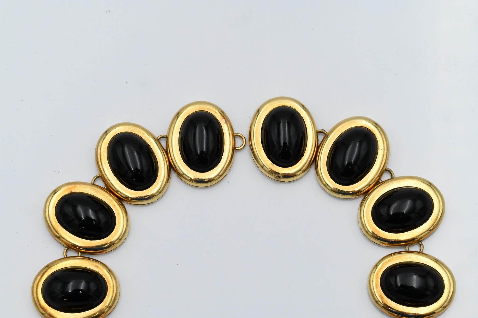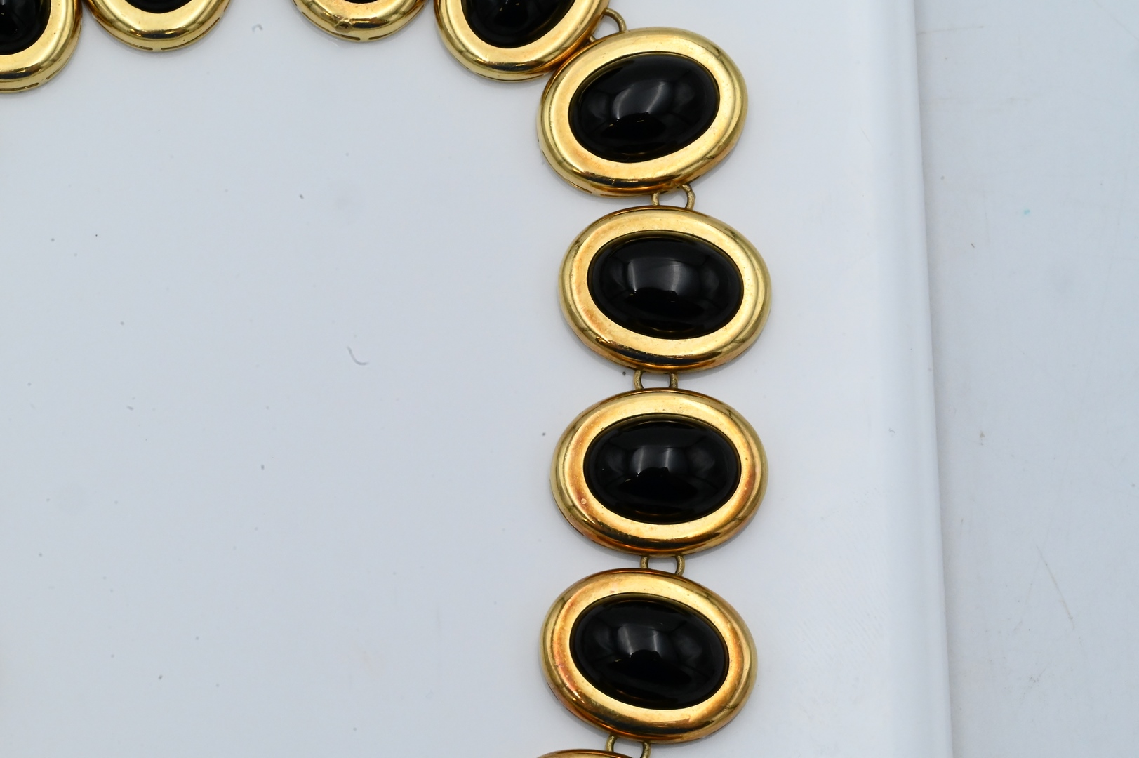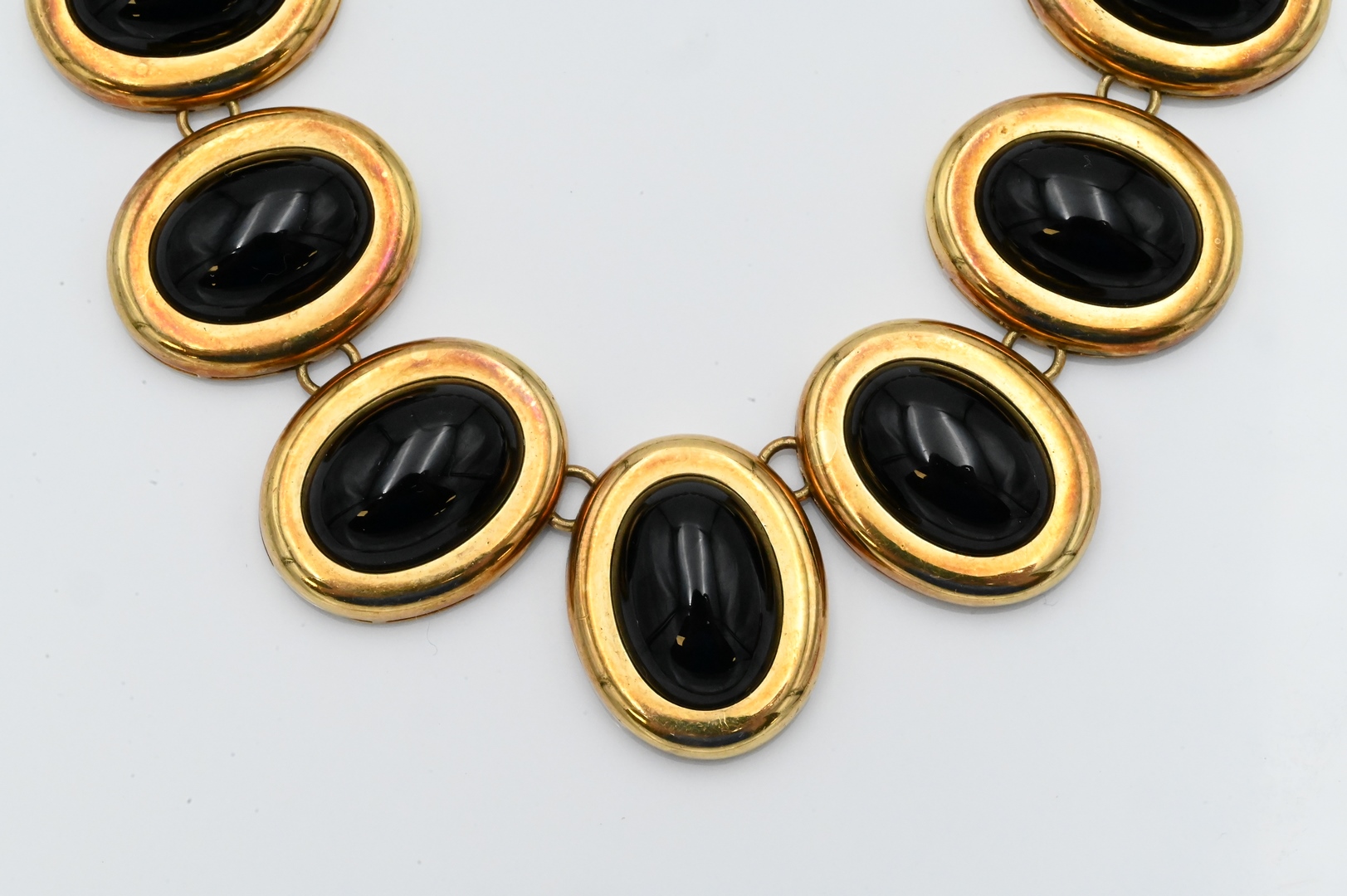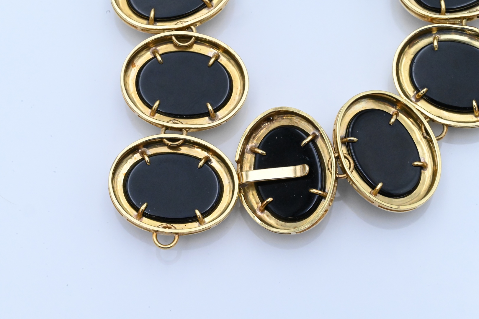 18 Karat Yellow Gold and Onyx Necklace having 19 oval onyx plaque mounted in 18 karat gold frames length 15 3/4 inches, 110.9 grams Condition: good condition