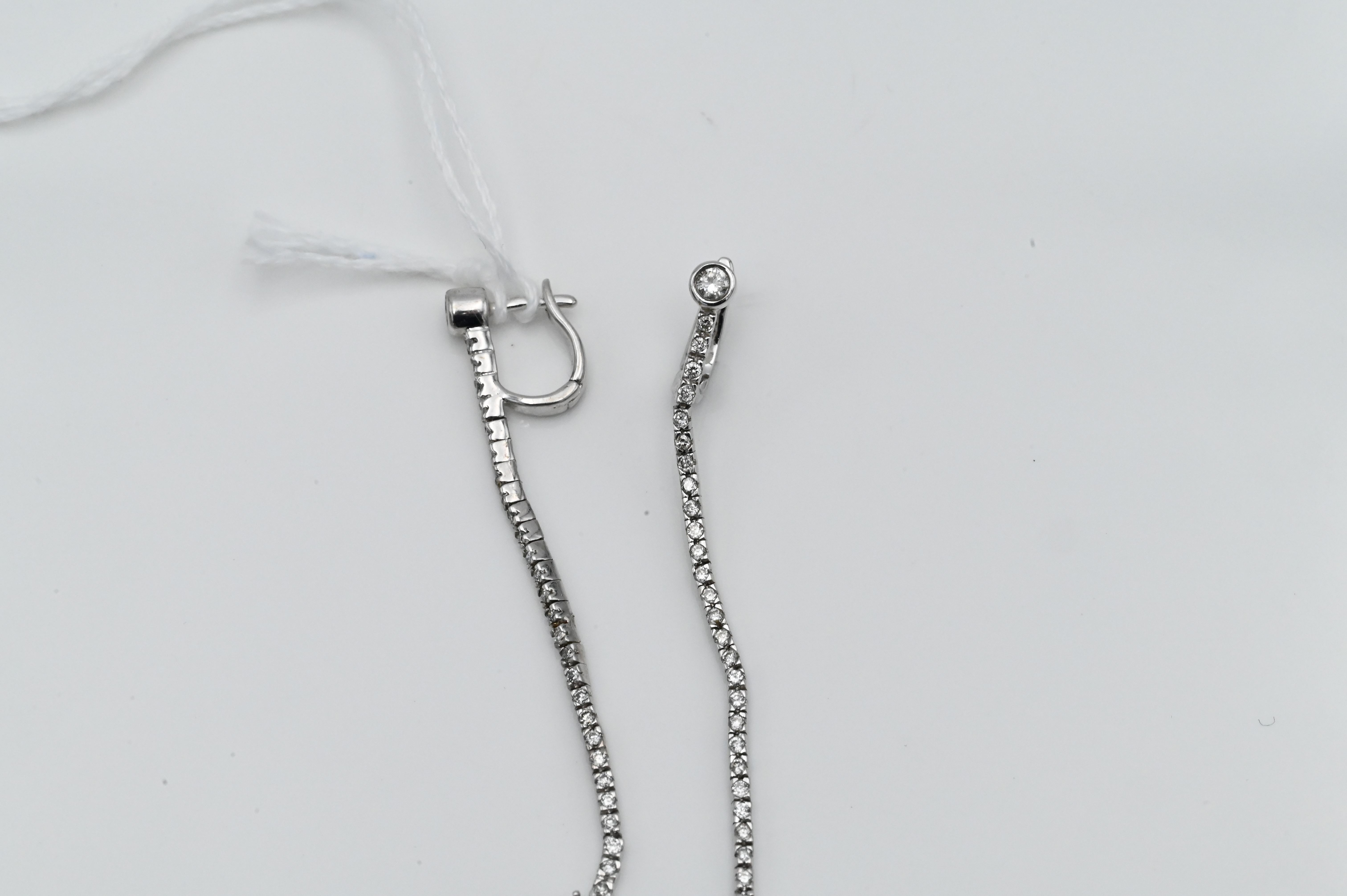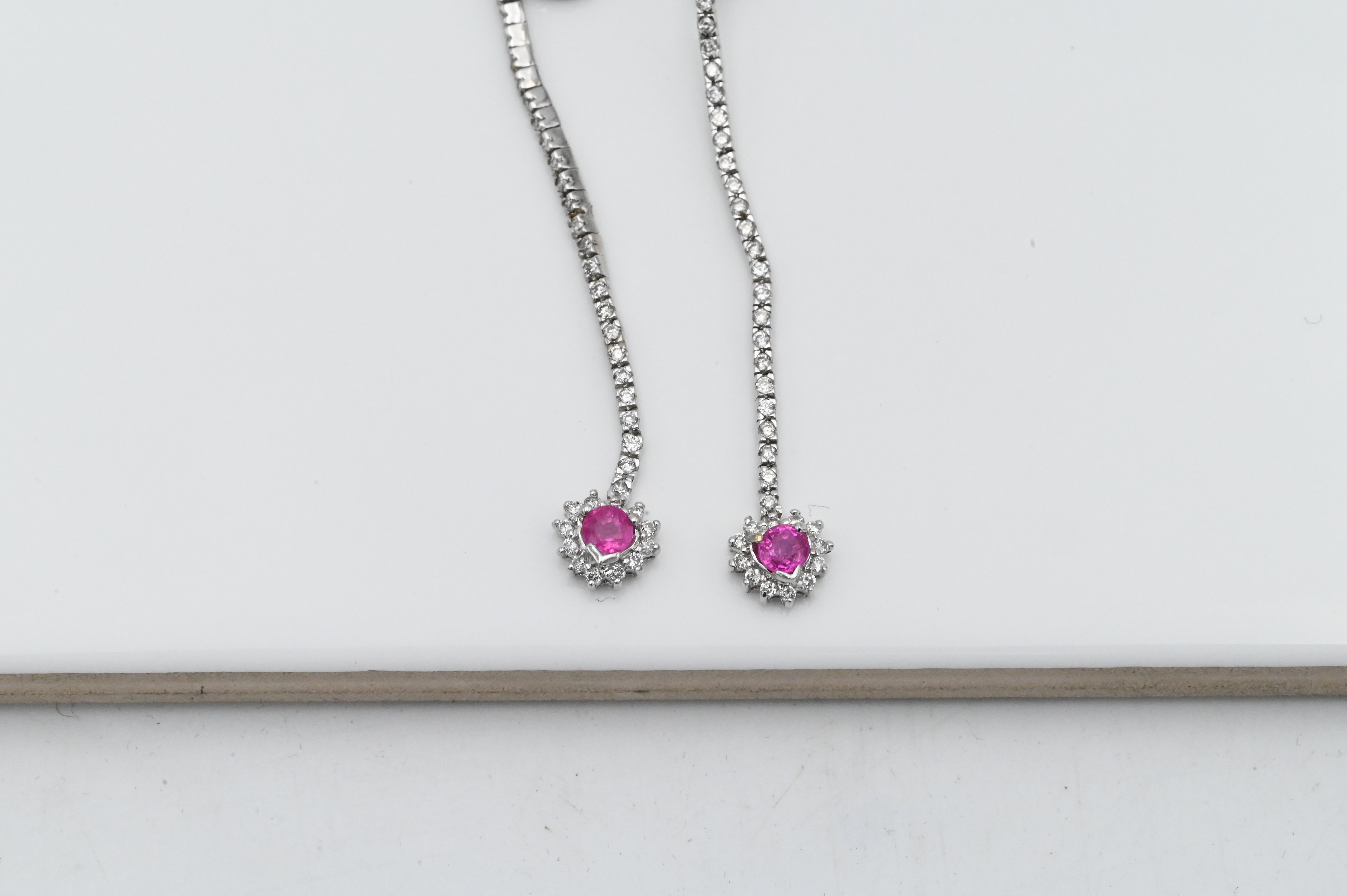 18 Karat White Gold Pierced Earrings, having hanging small diamonds, round red stone at end, length 2 1/4 inches.