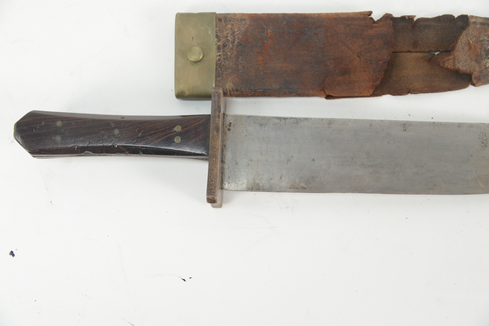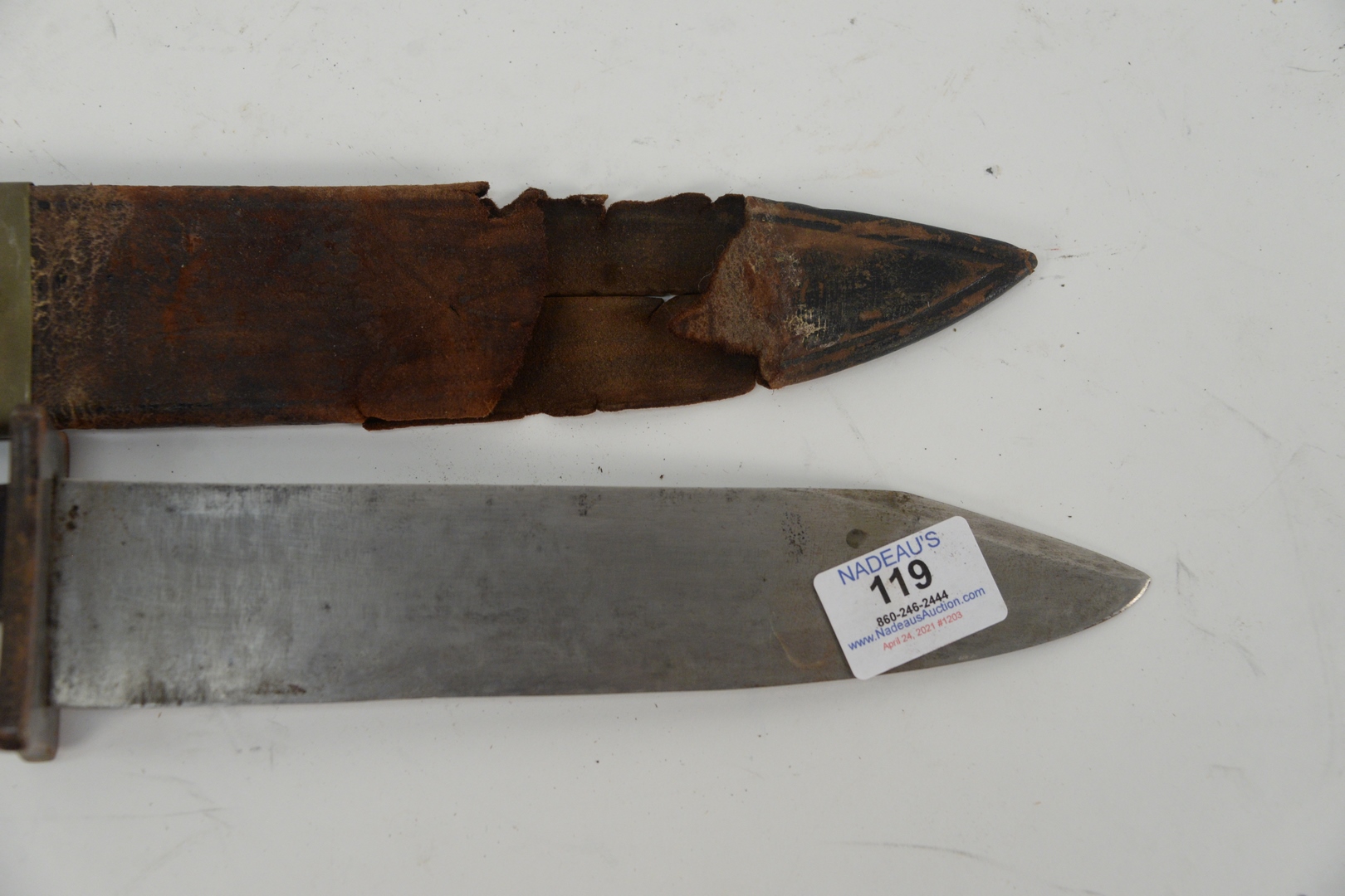 Lot 119: B. Richardson Philadelphia Clip Point Bowie Knife having wood handle with leather and brass sheath, blade marked B. Richardson, Philadelphia and Sons, Philadelphia, blade 9 1/2 inches, length 14 1/2 inches.
