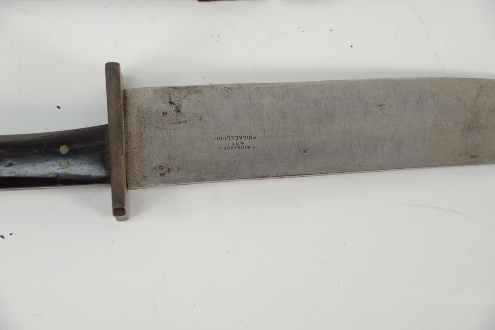 B. Richardson Philadelphia Clip Point Bowie Knife having wood handle with leather and brass sheath, blade marked B. Richardson, Philadelphia and Sons, Philadelphia, blade 9 1/2 inches, length 14 1/2 inches.