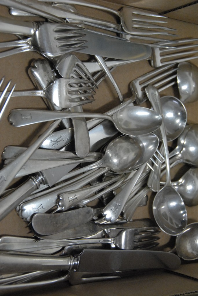 Box lot of sterling silver flatware, 41.1 t oz plus four handles.