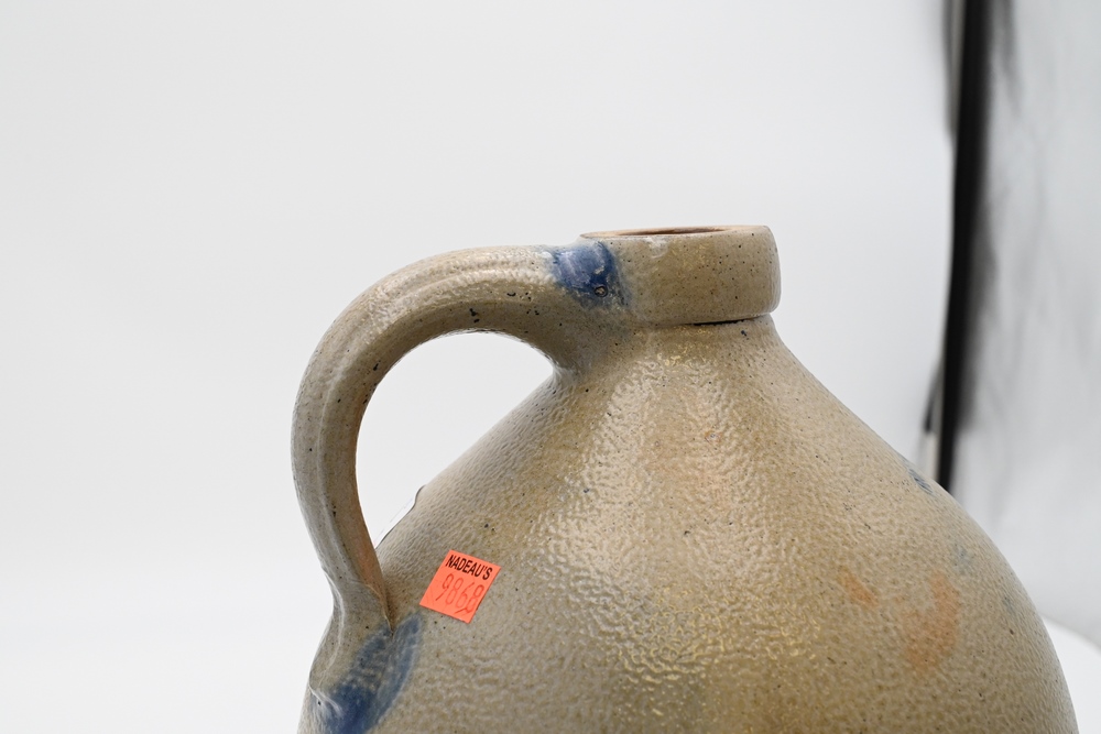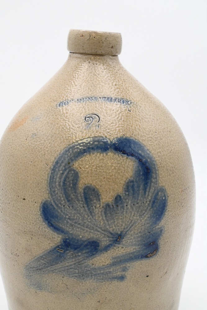 Lot 119: Cowden and Wilcox 20 Gallon Stoneware Jug having blue decoration height 13 1/2 inches Provenance: Estate of Bruce Sasalla, East Hartford, Connecticut.