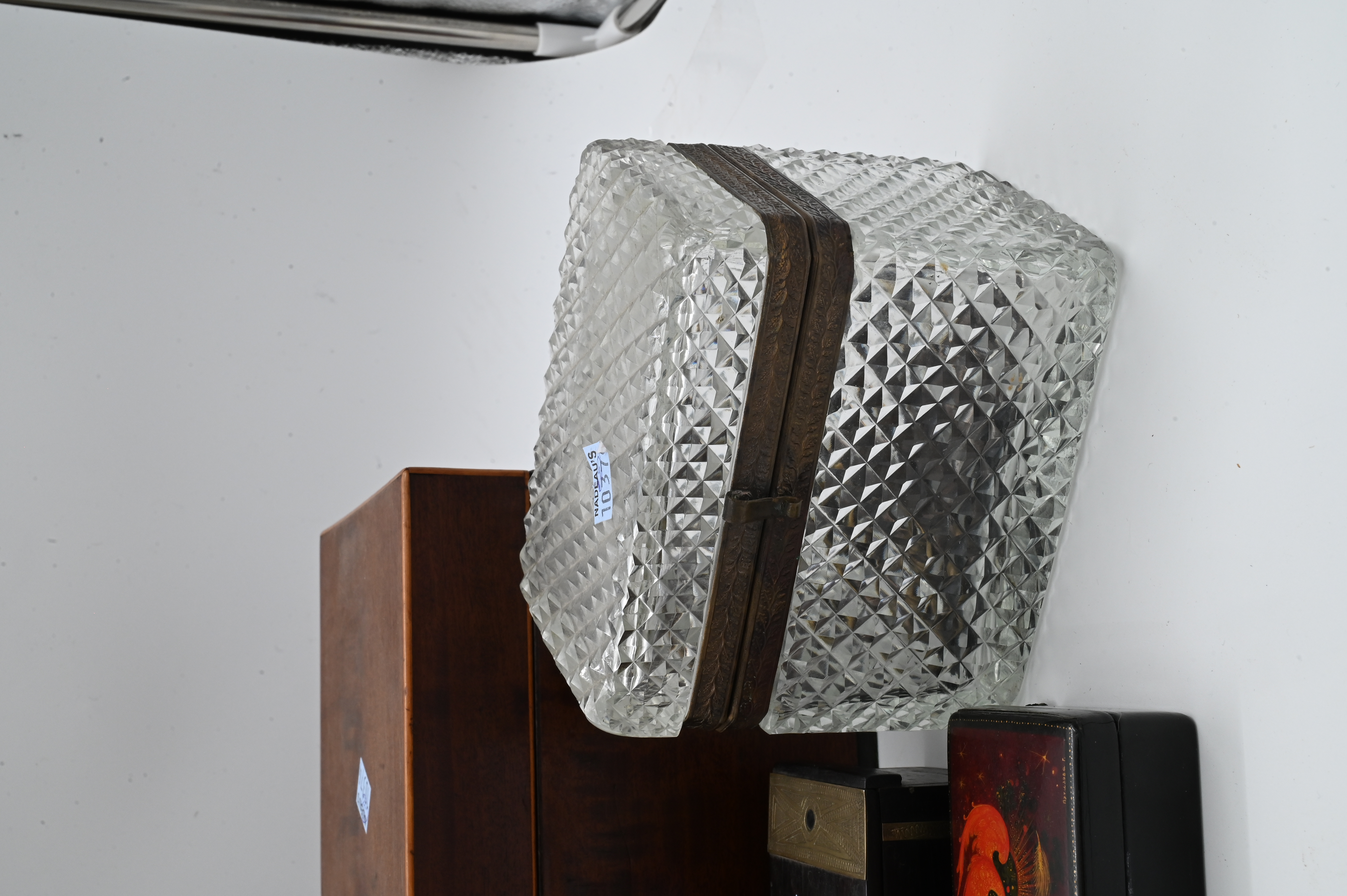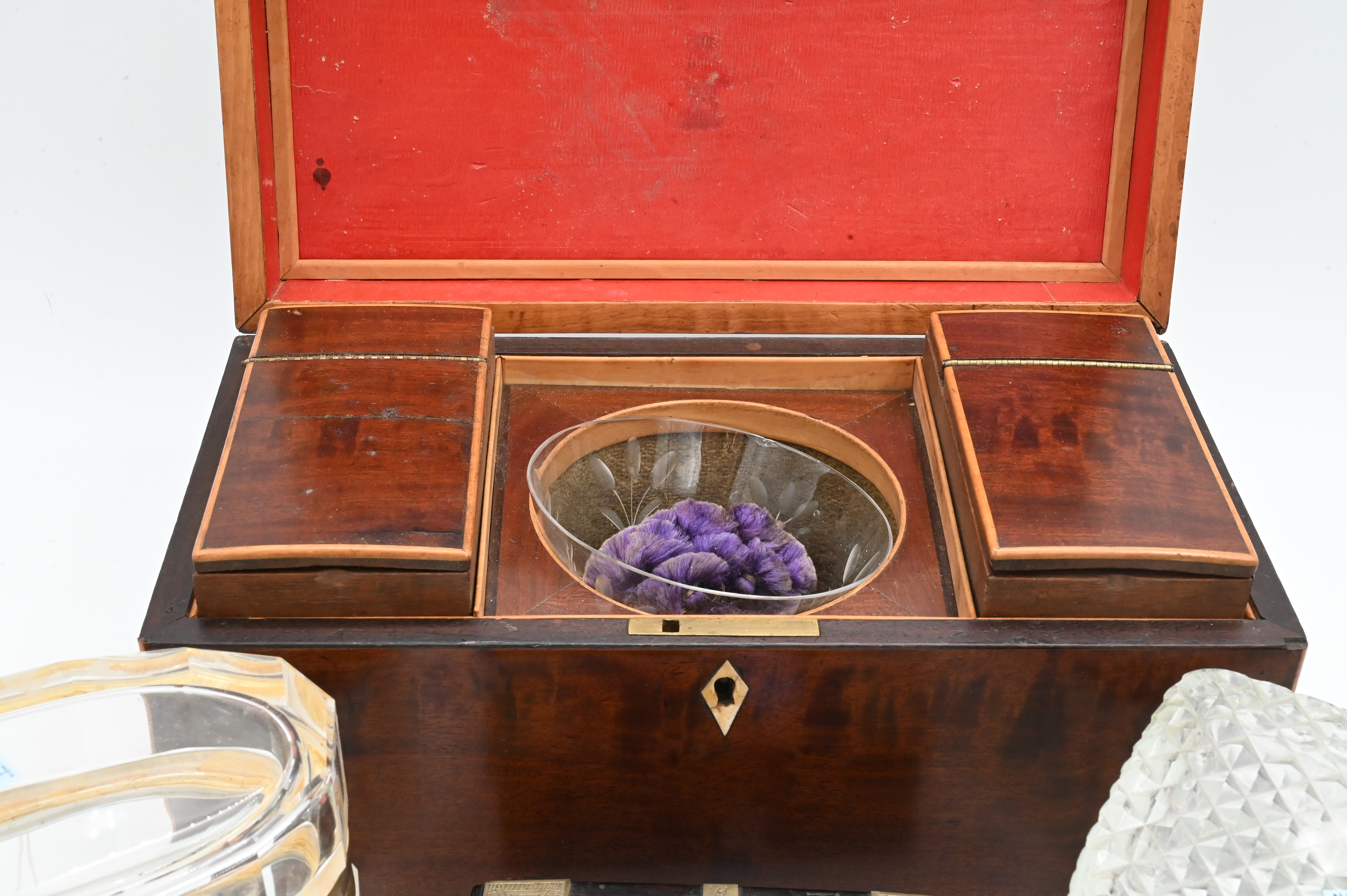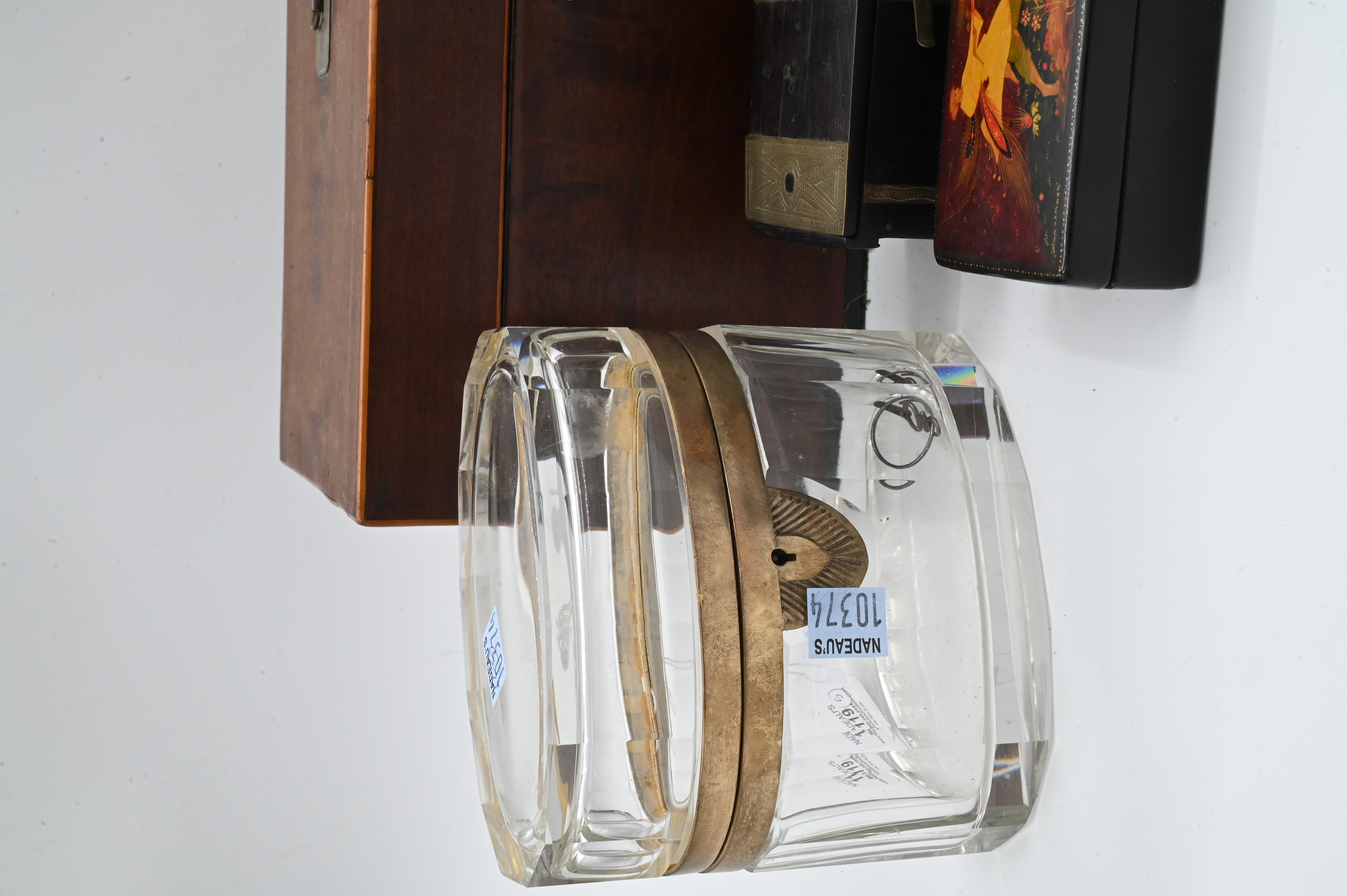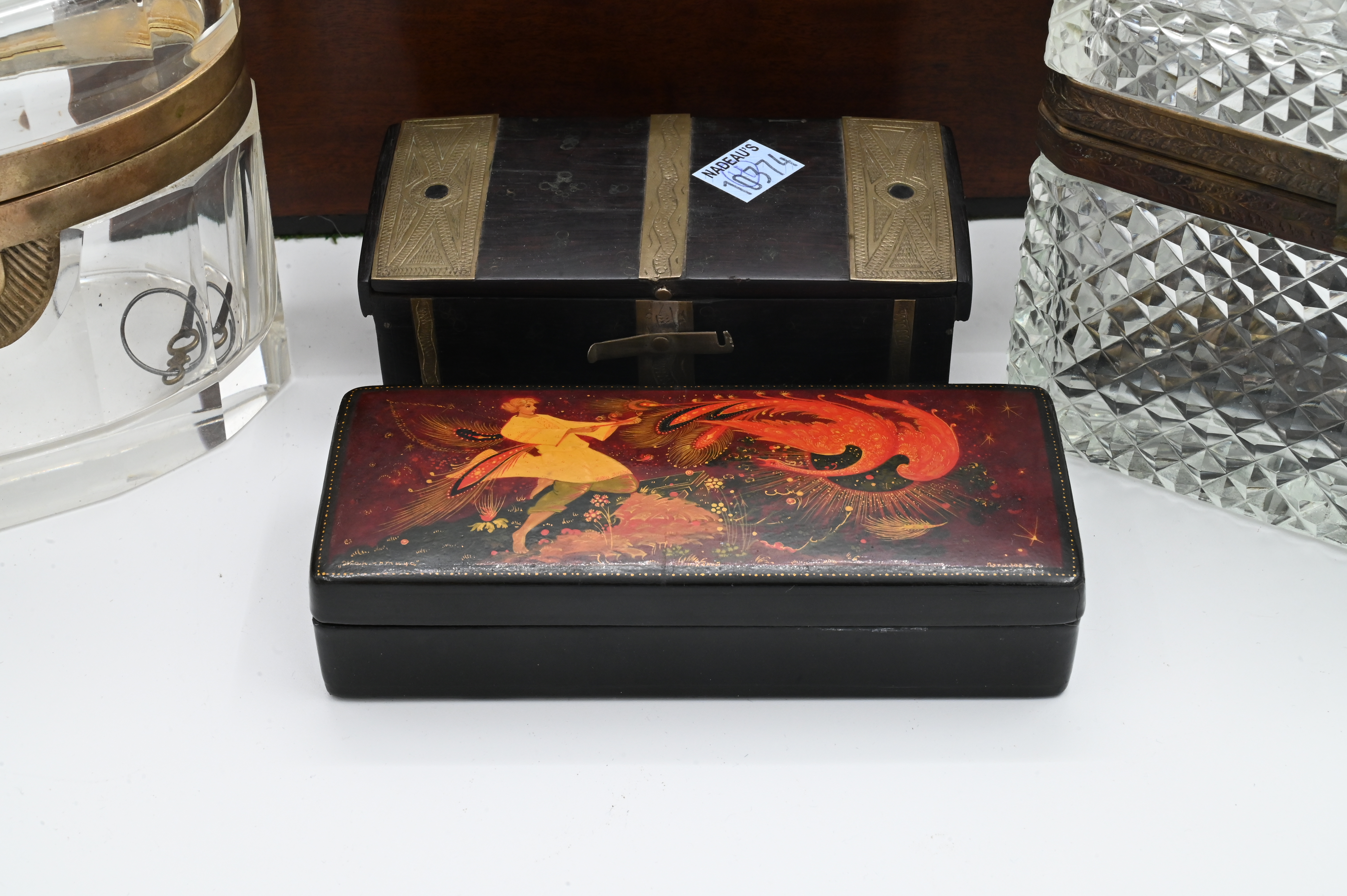 to include mahogany tea box with two interior hinged boxes, two cut crystal and brass boxes, small wooden box having metal inlay, Russian enamel box of a firebird signed lower right