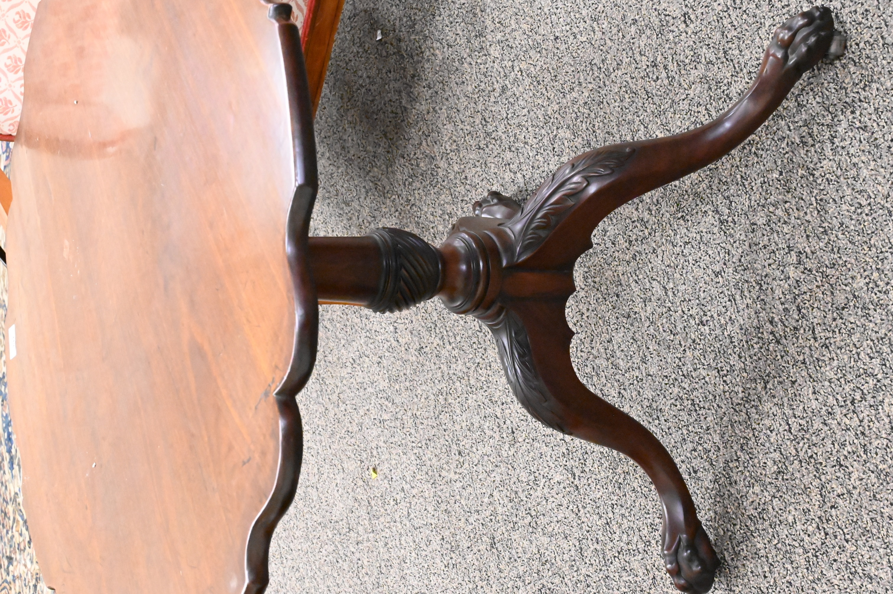 having shaped top above a turned baluster shaft carved with acanthus leaves, raised on three cabriole legs ending in boldly carved ball-and-claw feet, 18th century