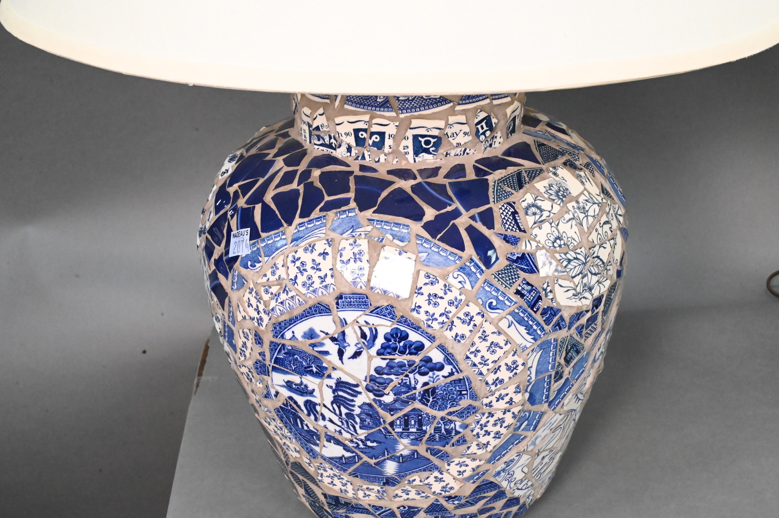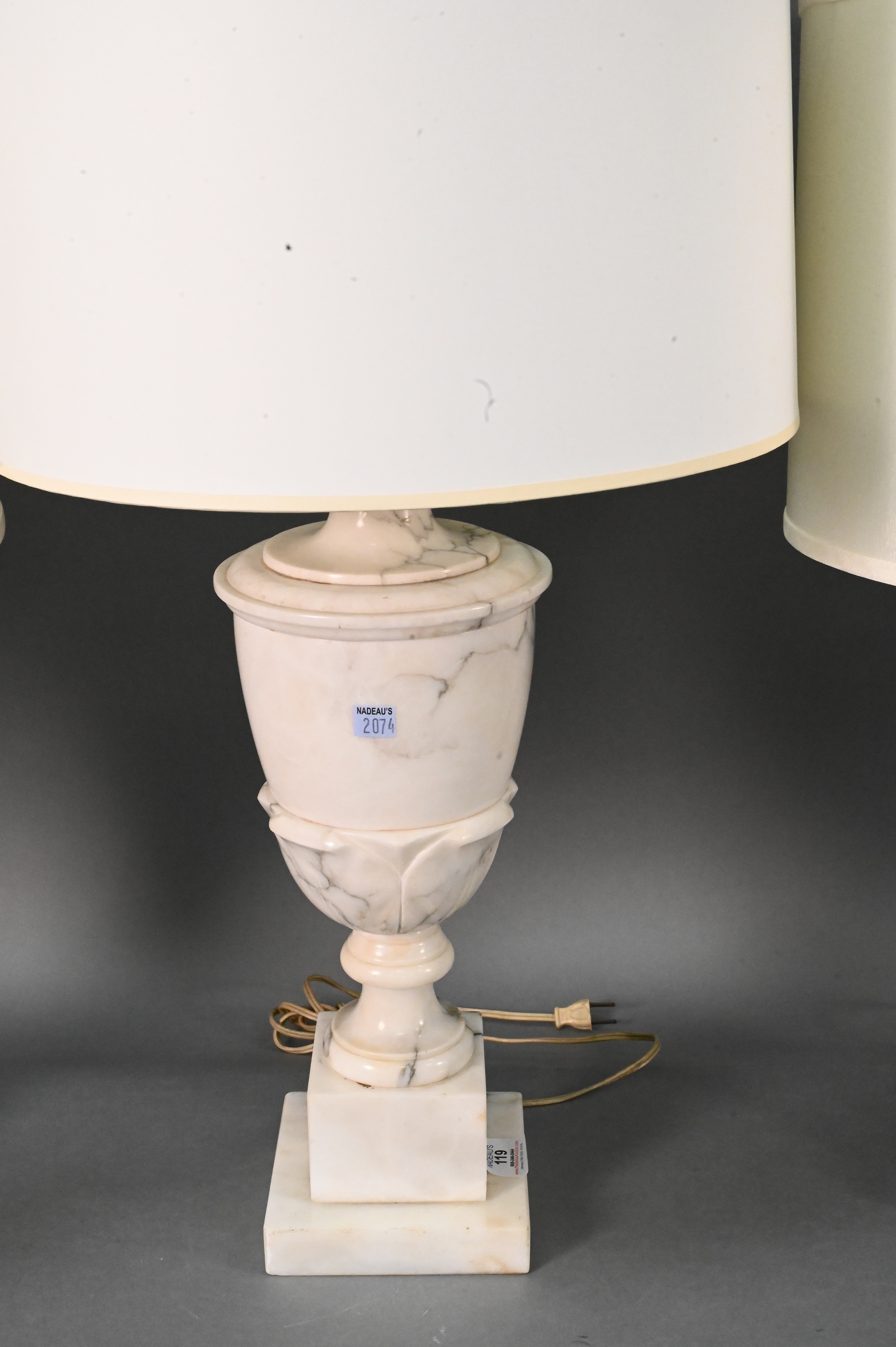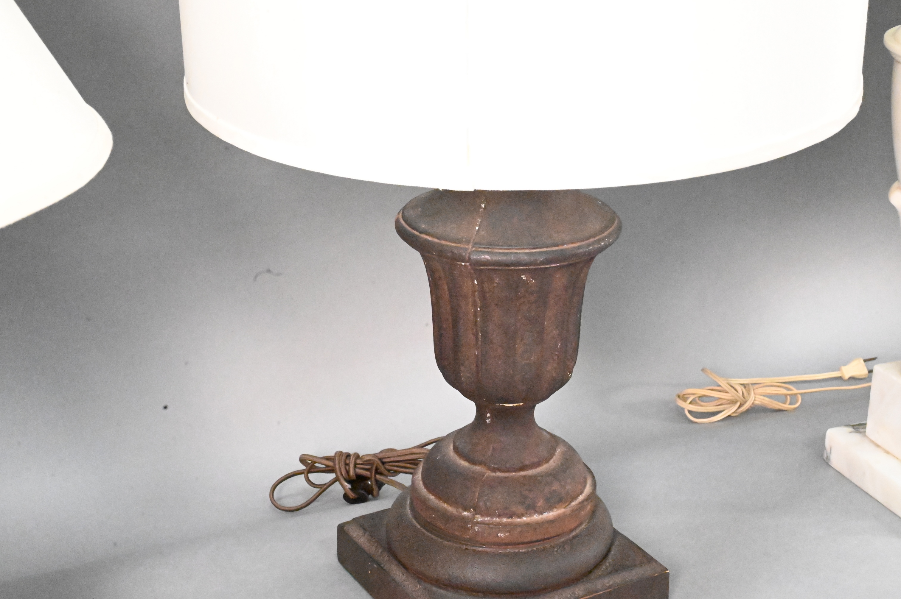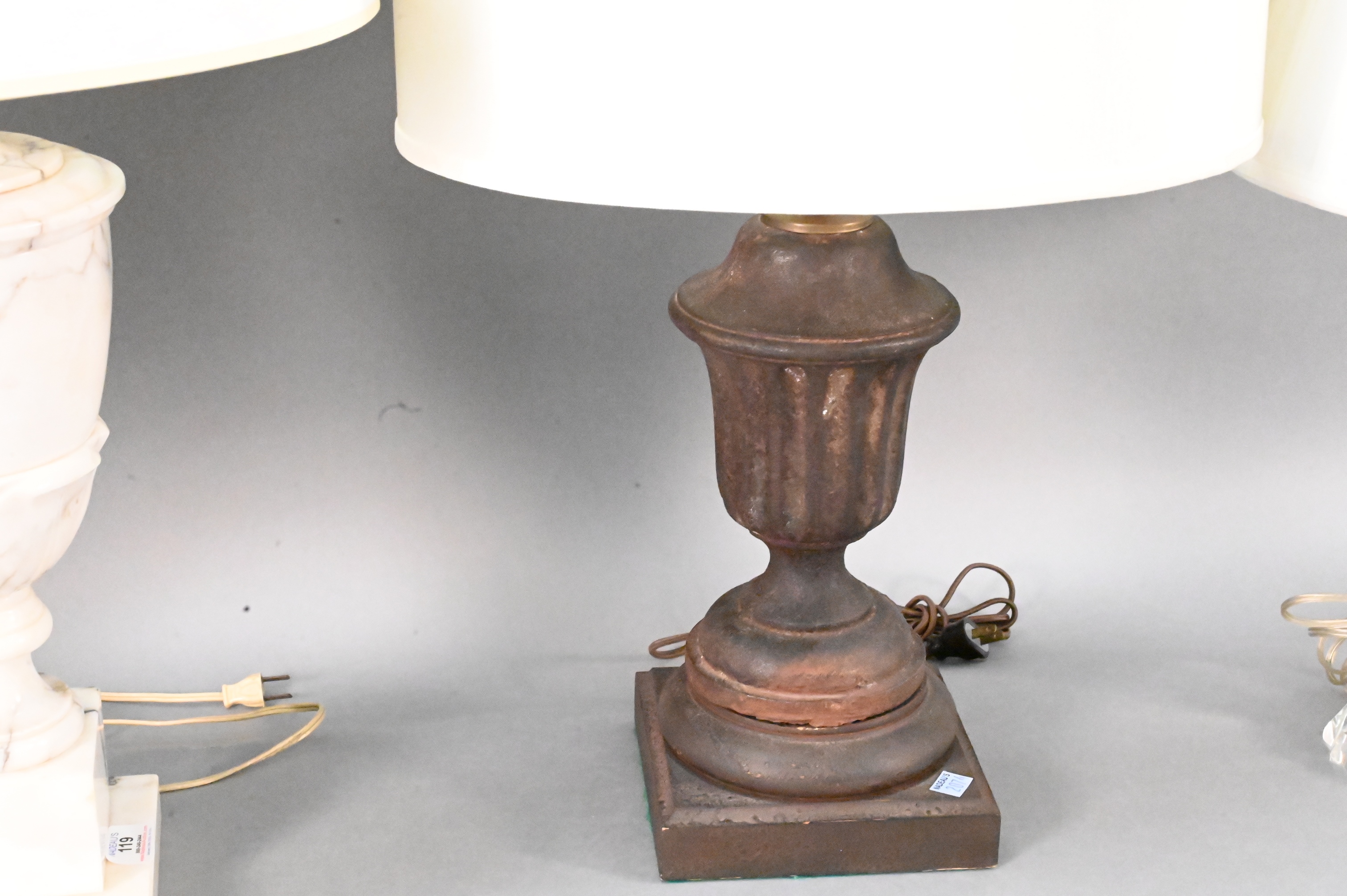 Group of Five Table Lamps, large white marble in the form of an urn, pair of iron urn form lamps, a cut glass stick lamp along with a blue and white mosaic tile lamp, tallest 20 1/2 inches.