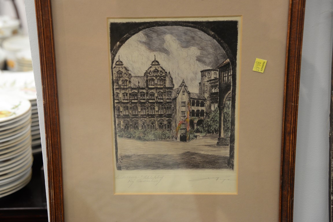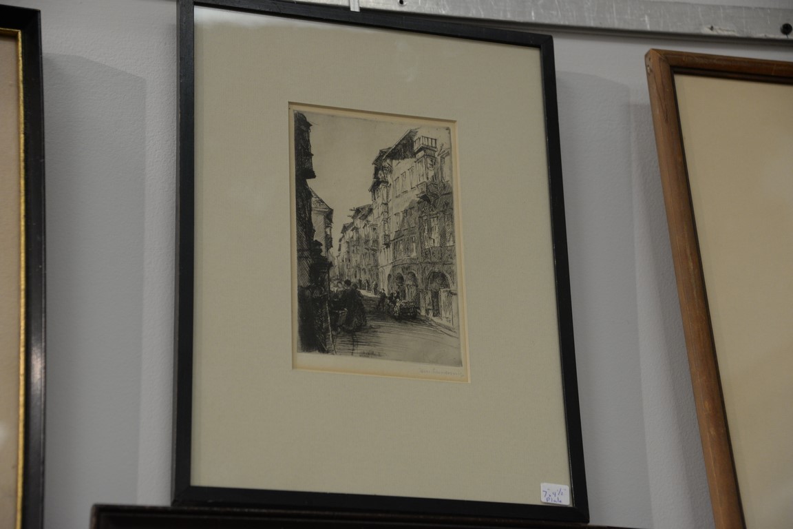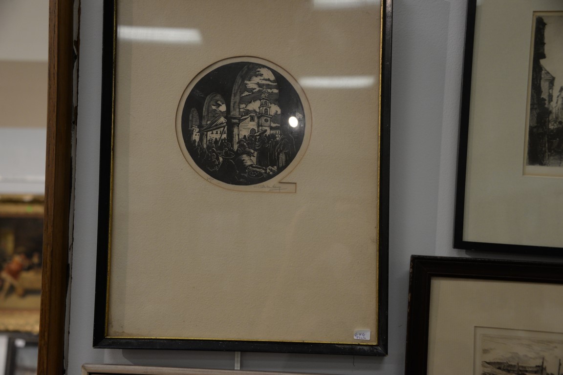 Lot 119: Group of six etchings to include Alfred Rudolph Companions etching, round etching pencil signed lower right Giteu Ka, street scene…