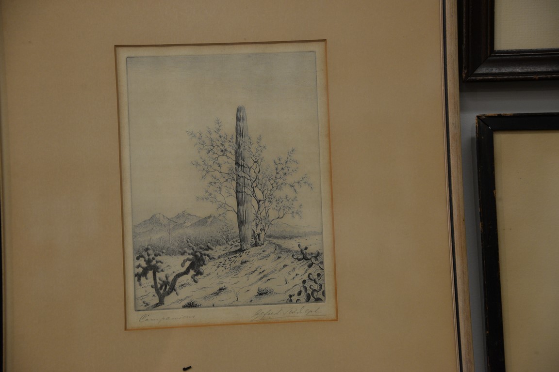 Group of six etchings to include Alfred Rudolph Companions etching, round etching pencil signed lower right Giteu Ka, street scene signed lower right in pencil illegibly, etching Crossing River on Horse Seymour Nadin, and an unsigned etching of boats on water’s edge. plate size 7 x 4 1/2 to 10 x 7 1/2 Provenance: Estate of Arthur C. Pinto, MD