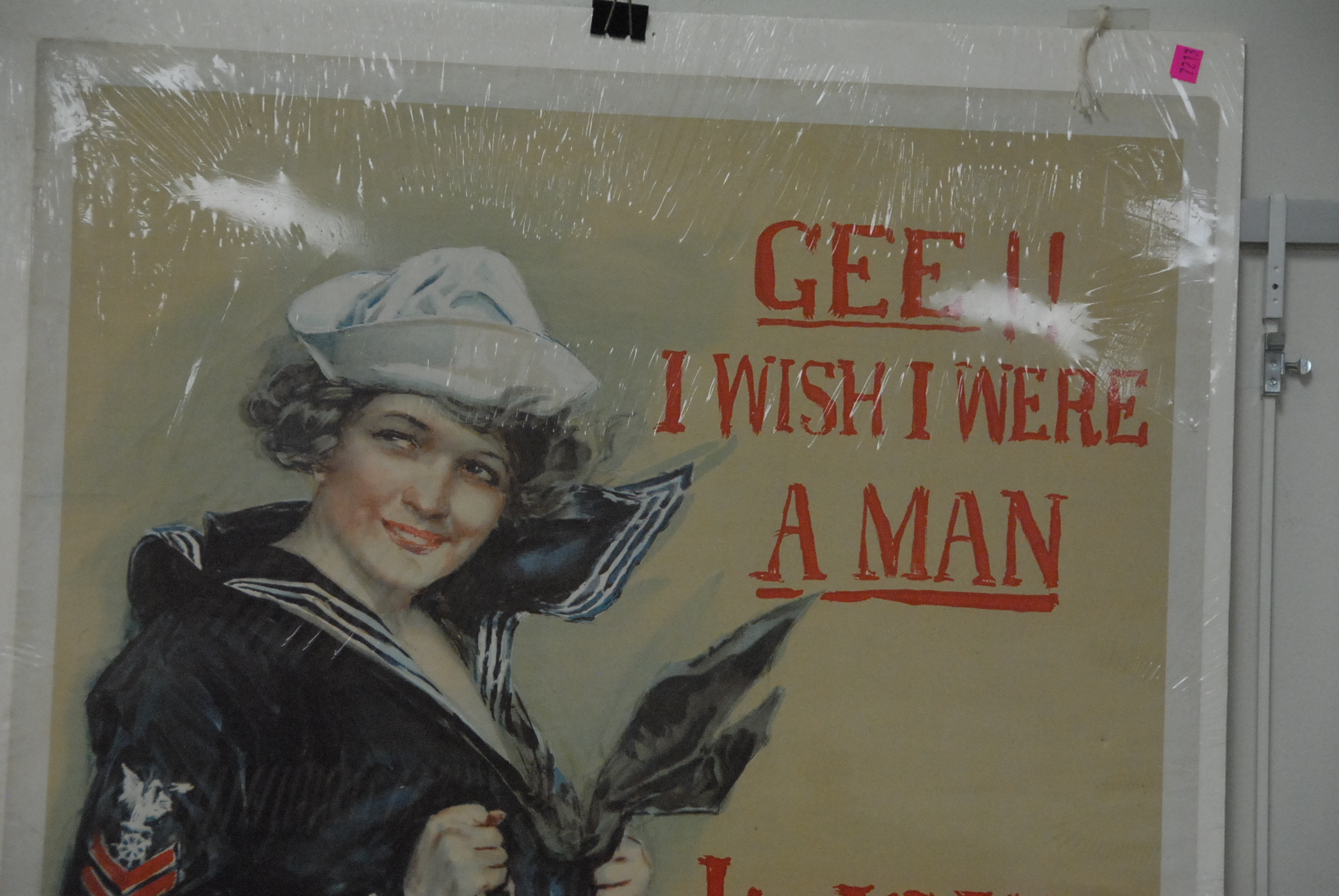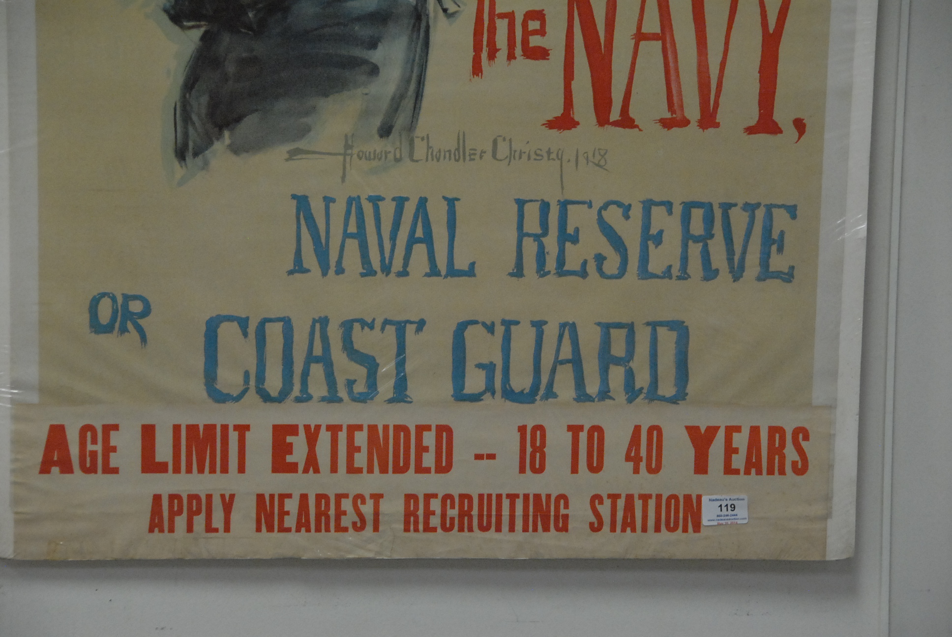 Howard Chandler Christy 1873-1952 Gee I wish I were a man – I’d Join The Navy, Naval Reserve or Coast Guard signed bottom center in litho Howard Chandler Christy 1918 along with smaller poster on bottom Age limit extended – 18 to 40 years – Apply nearest recruiting station, 41 x 27 and 5 1/2 x 26 1/2.