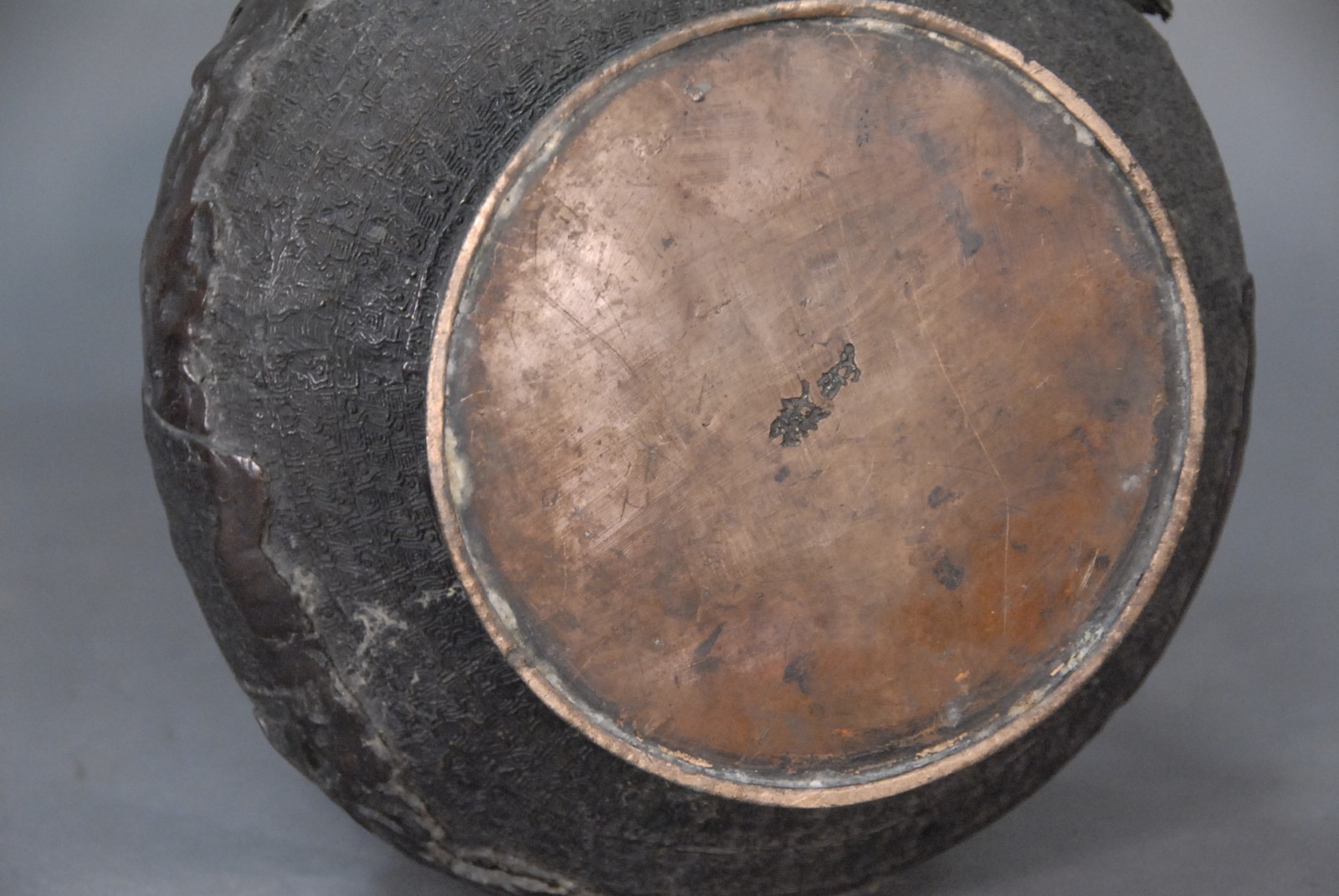 Large Japanese bronze, mixed metal, bottle vase with landscape and bridge in high relief, signed, 19th century.