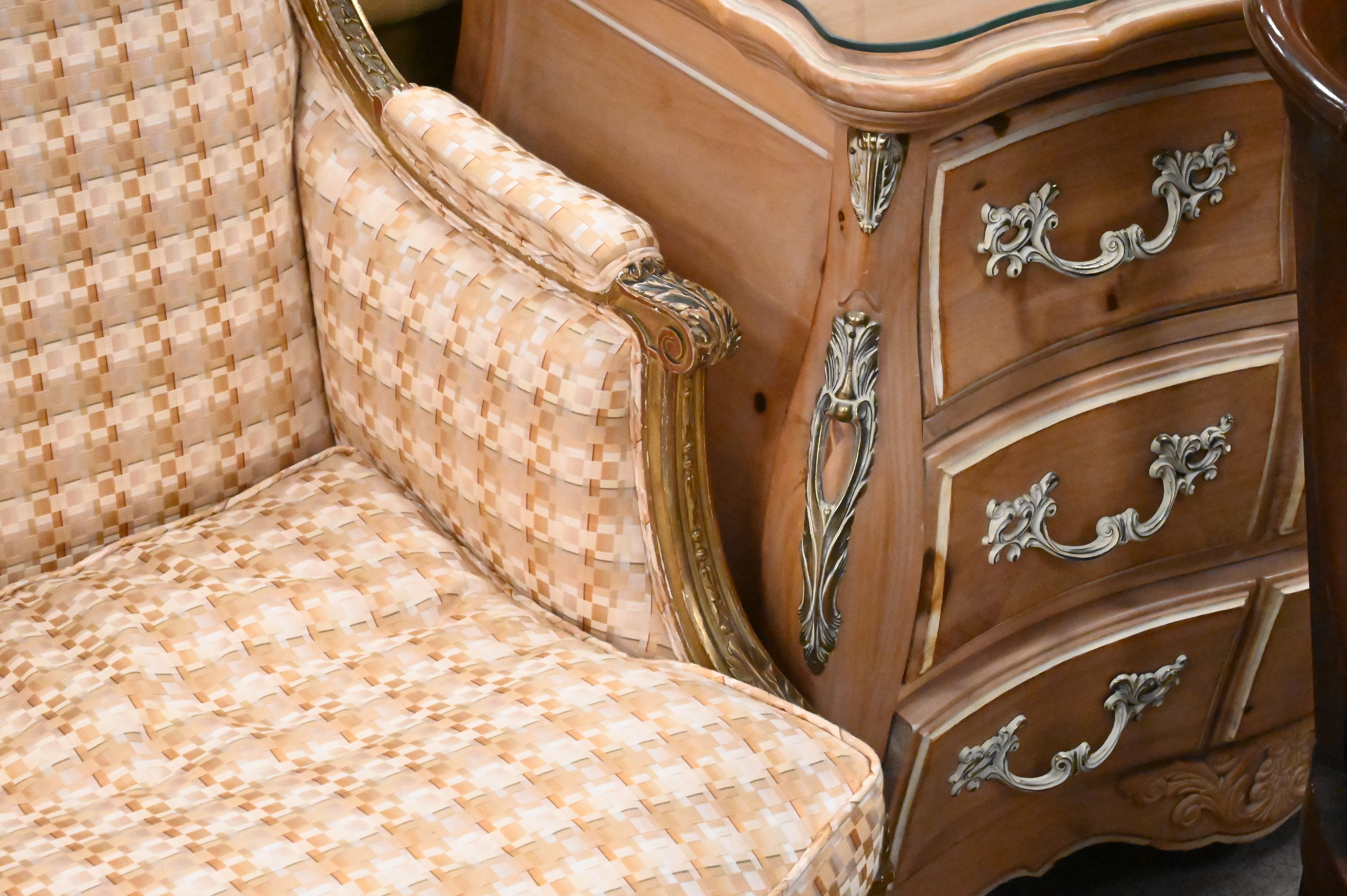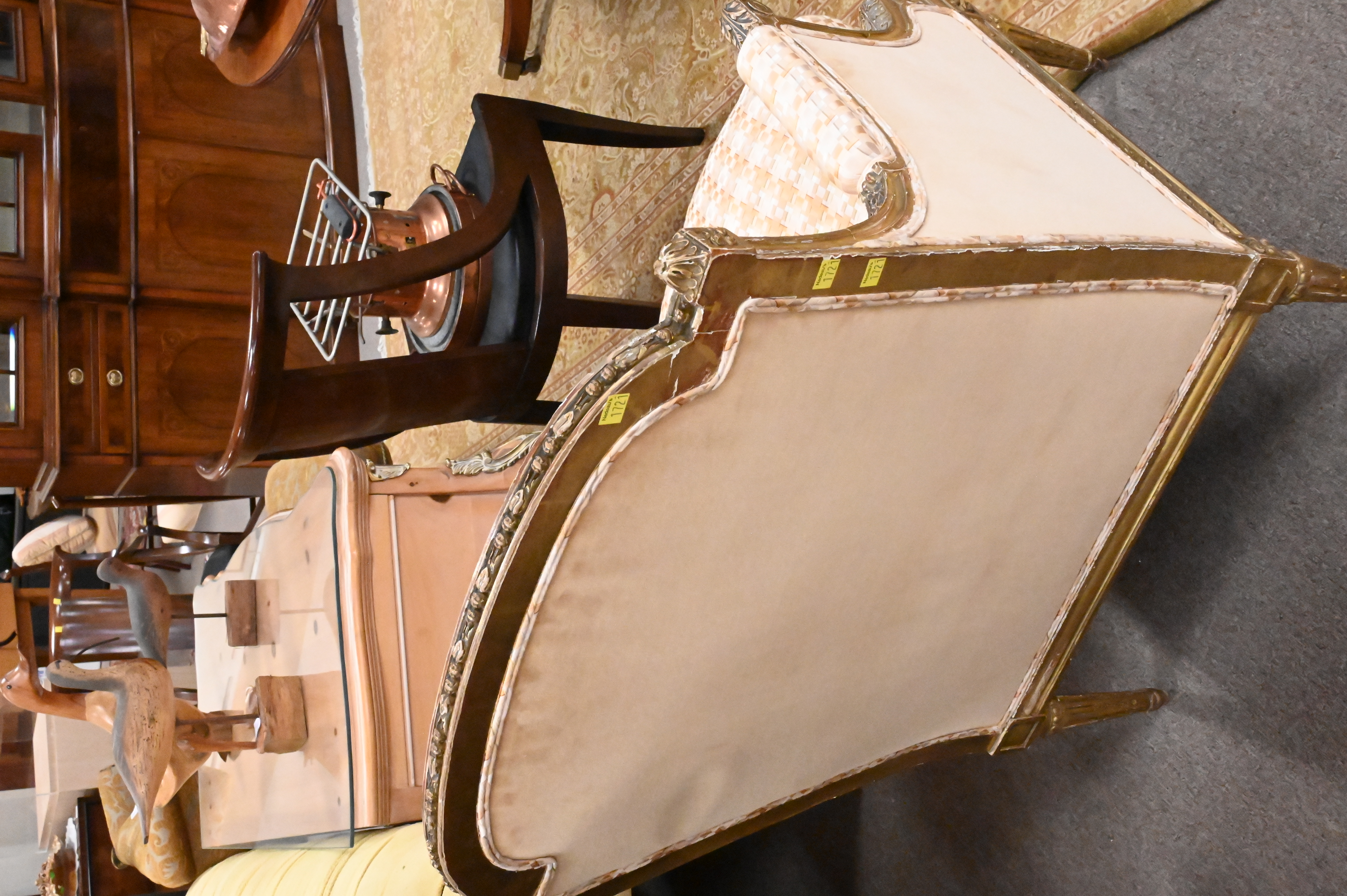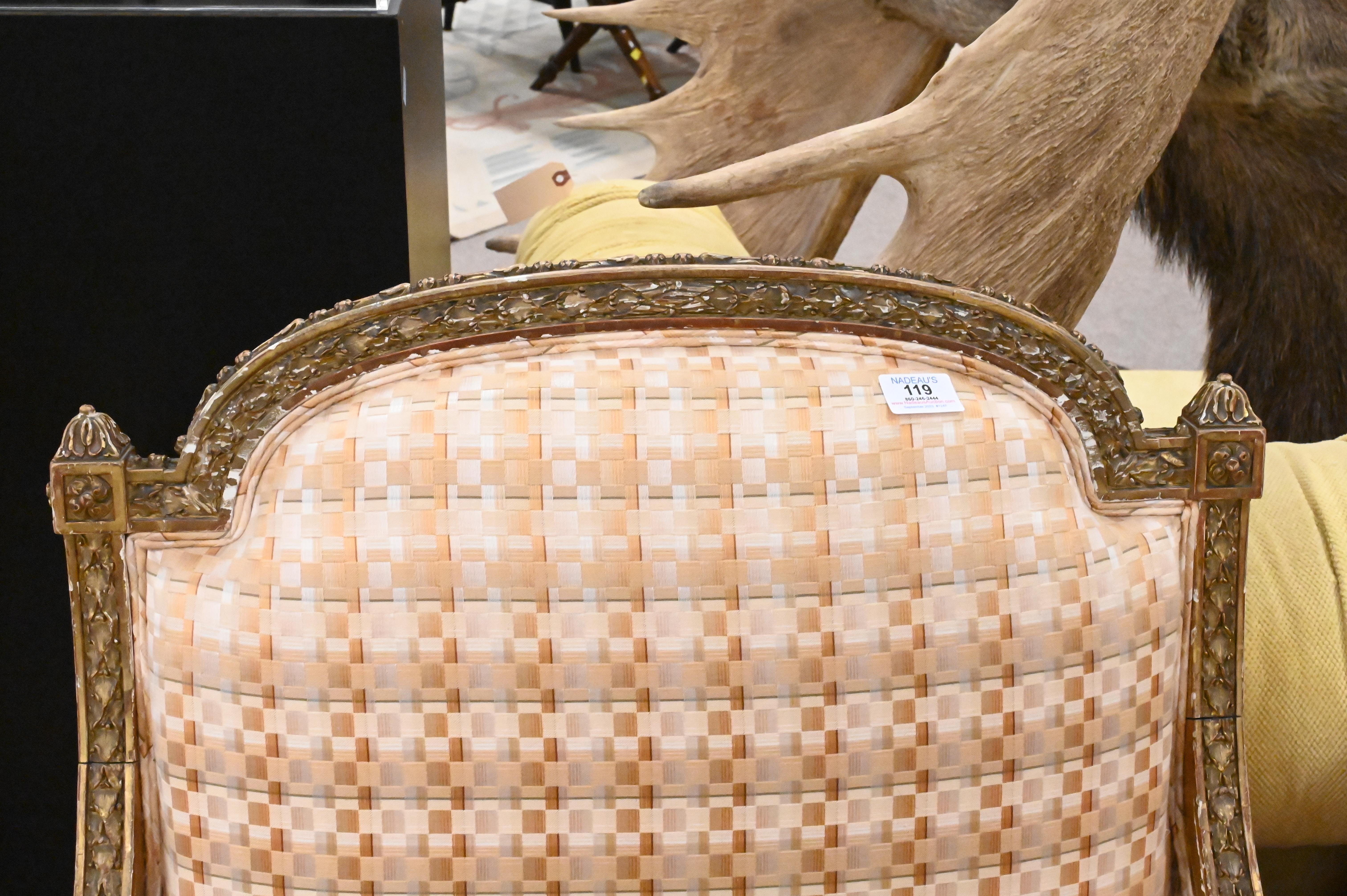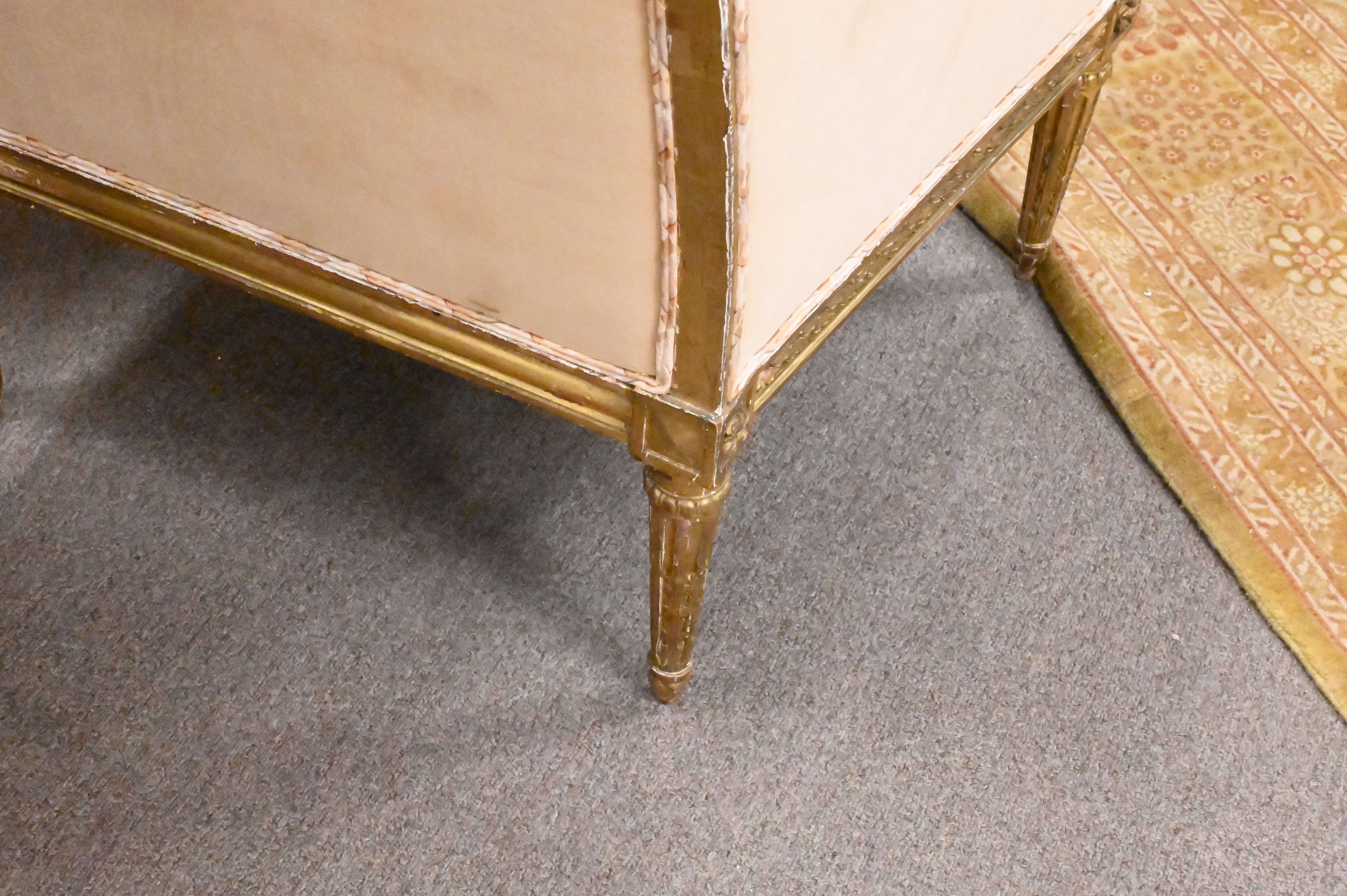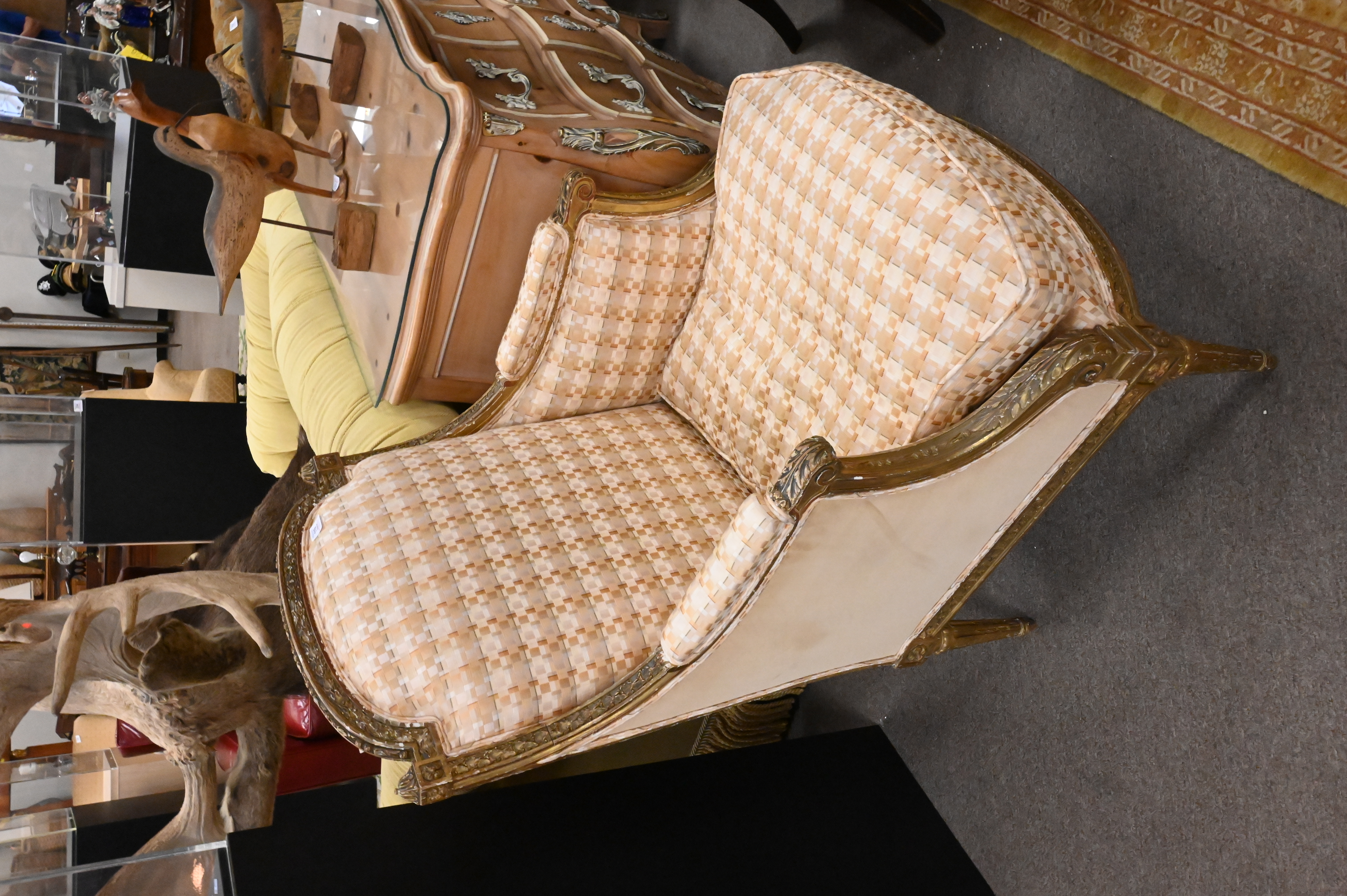 Louis XVI Style Bergere, having custom upholstered and gilt decorated carved frame, height 40 inches, width 30 inches.